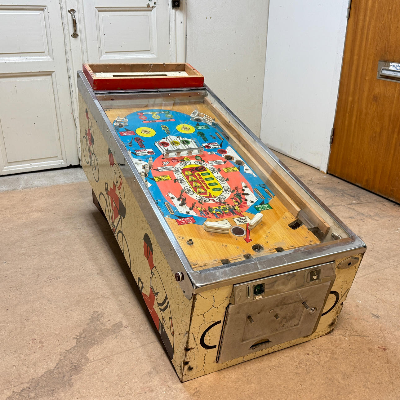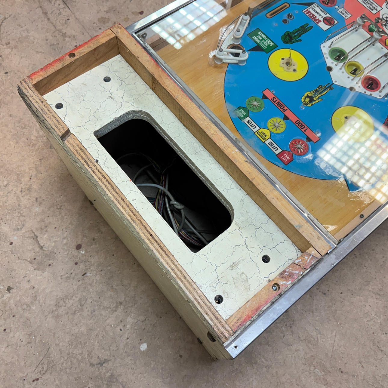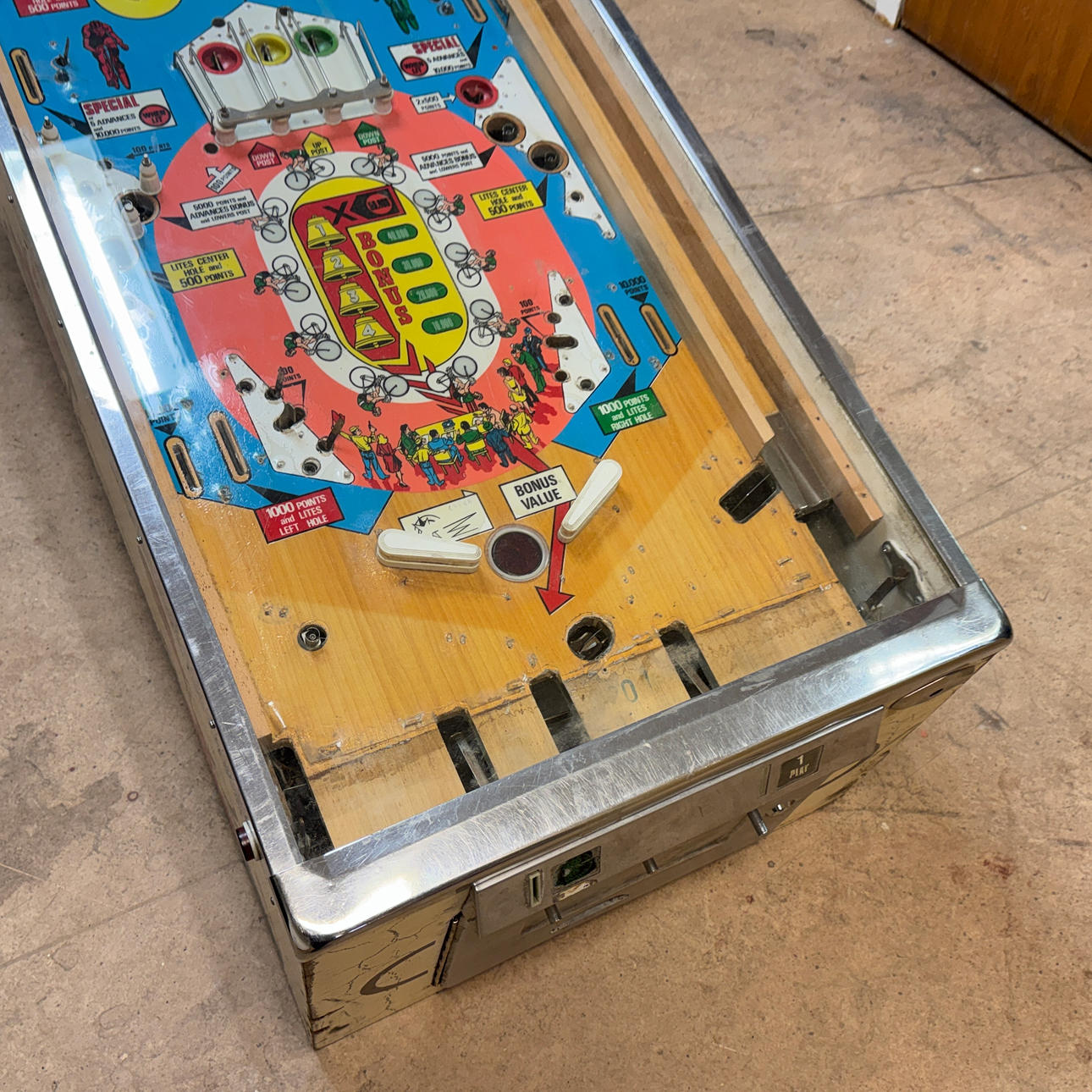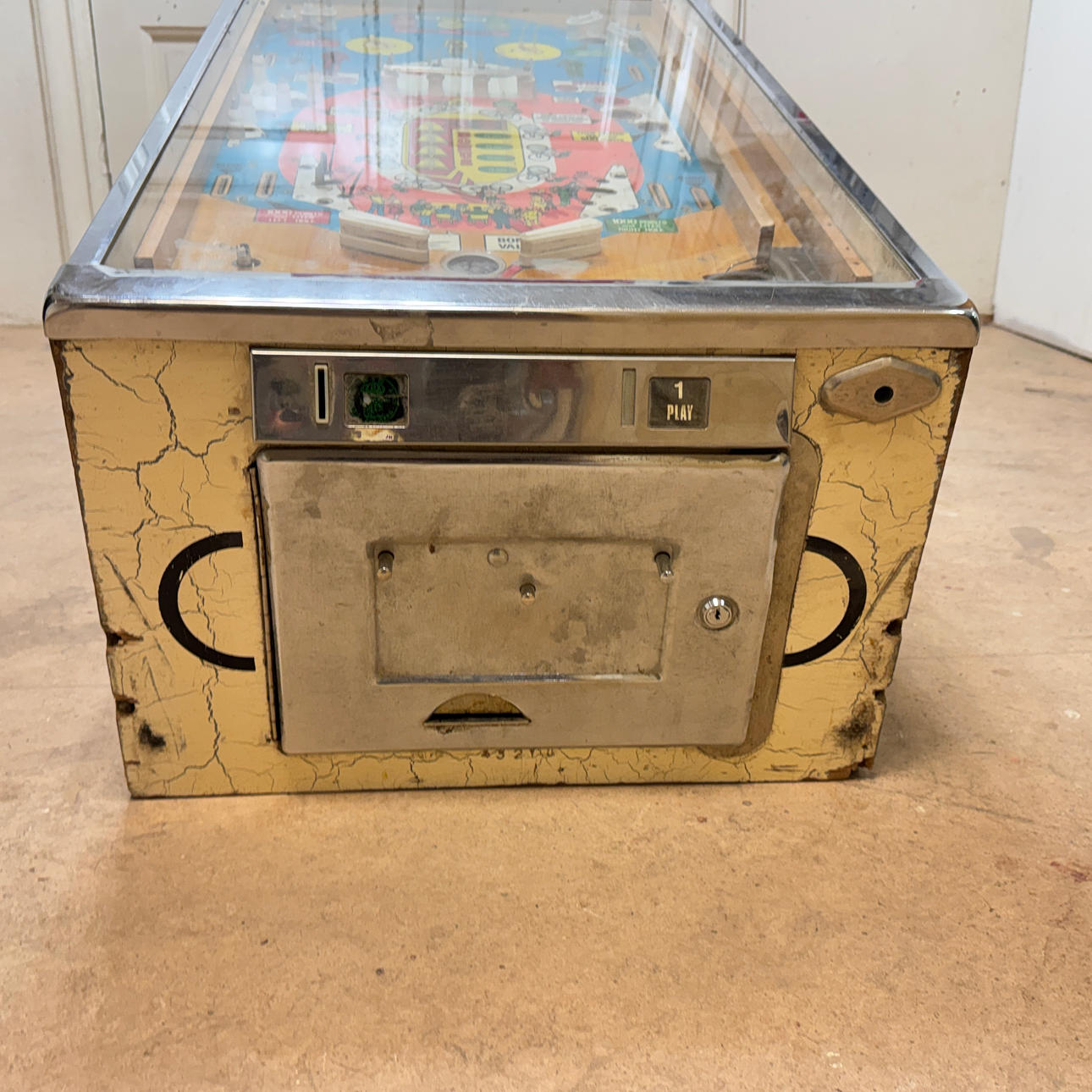 Rear glass in good condition. Cabinet in good condition for its age. Playing field and plastic ok (a broken plastic though). The game is otherwise in good shape for its age.