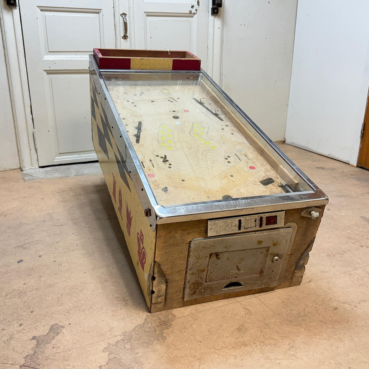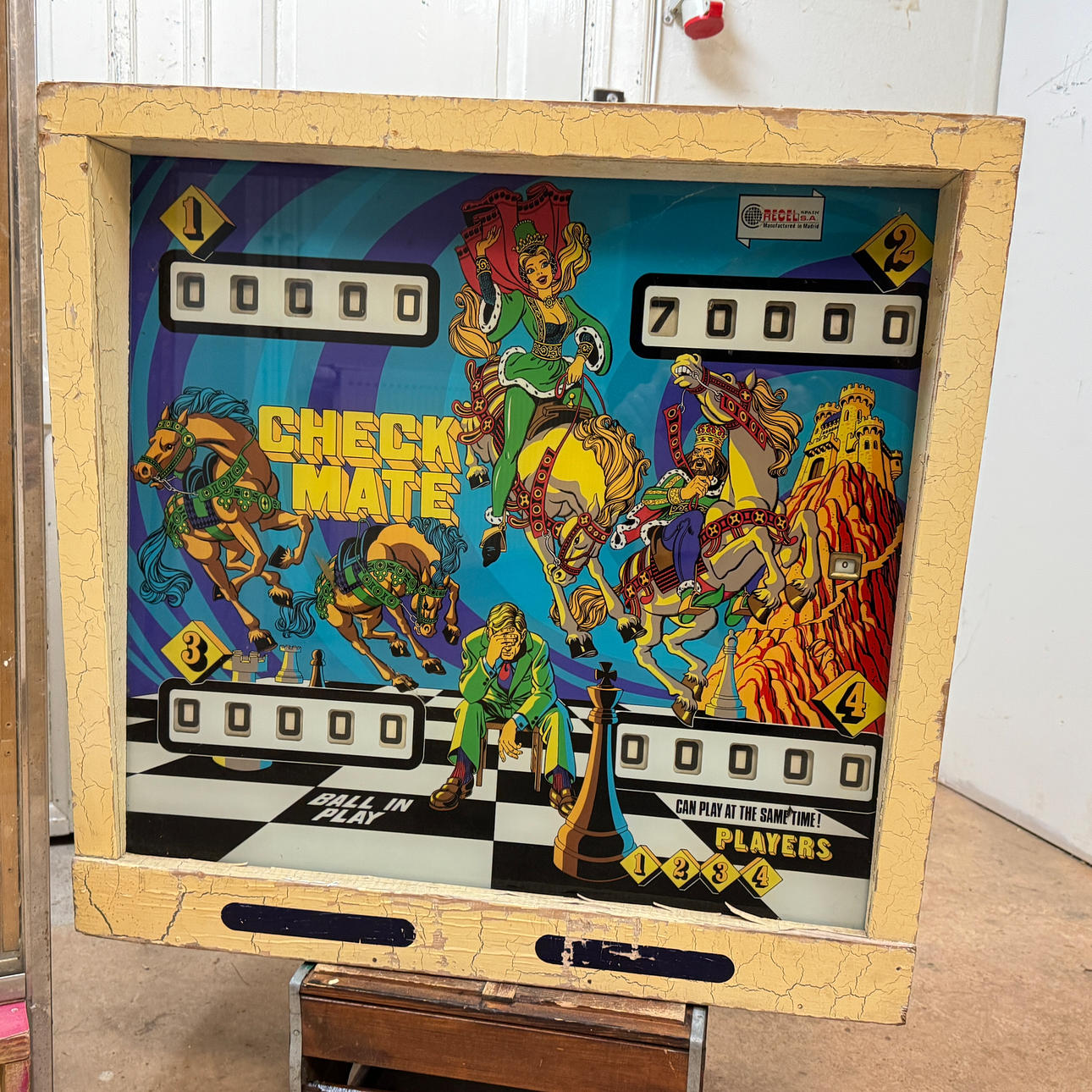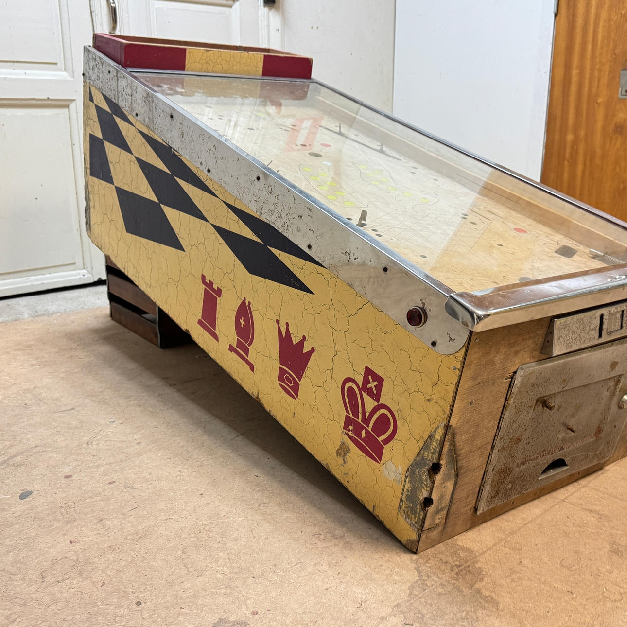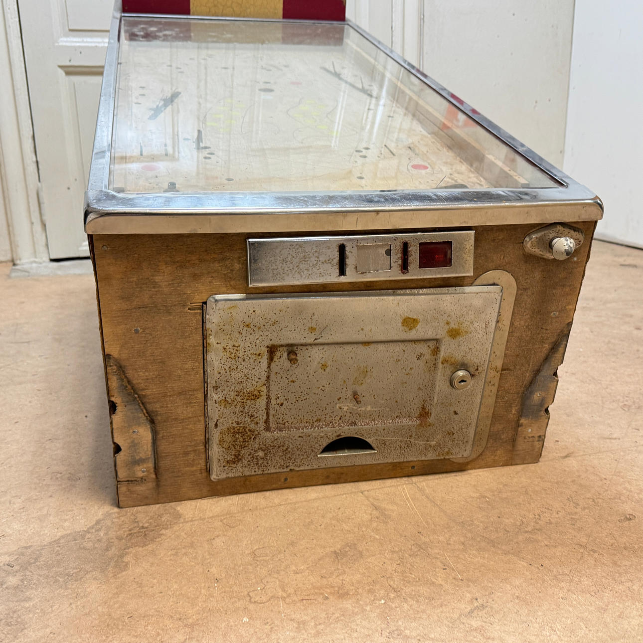 Rear glass in good condition. Cabinet ok for its age. Playing field plasters ok. Game plan bad. It lacks a back door. The game is otherwise in good shape for its age.