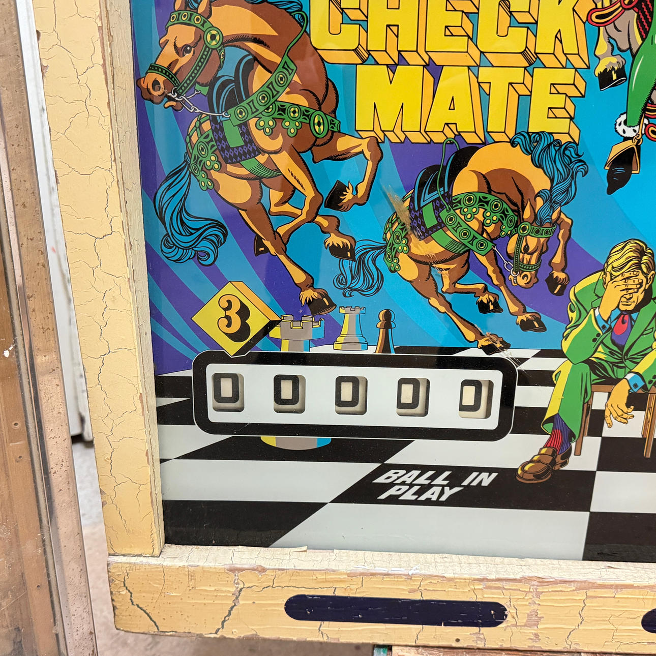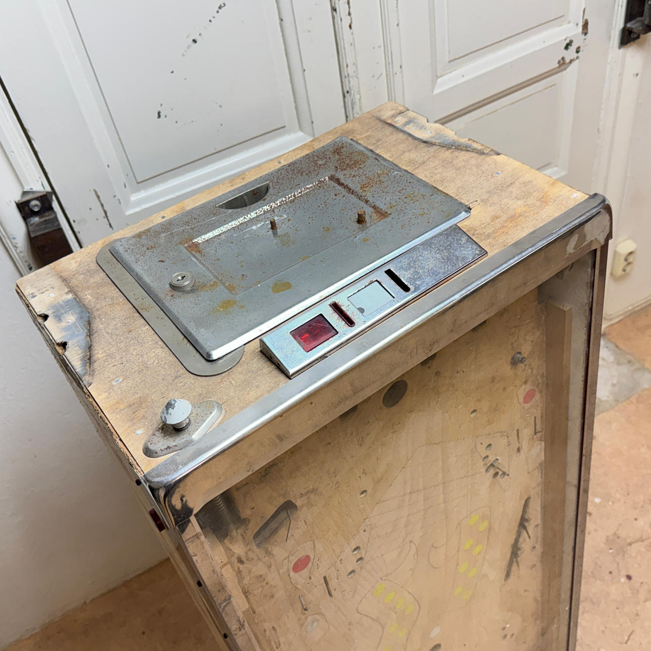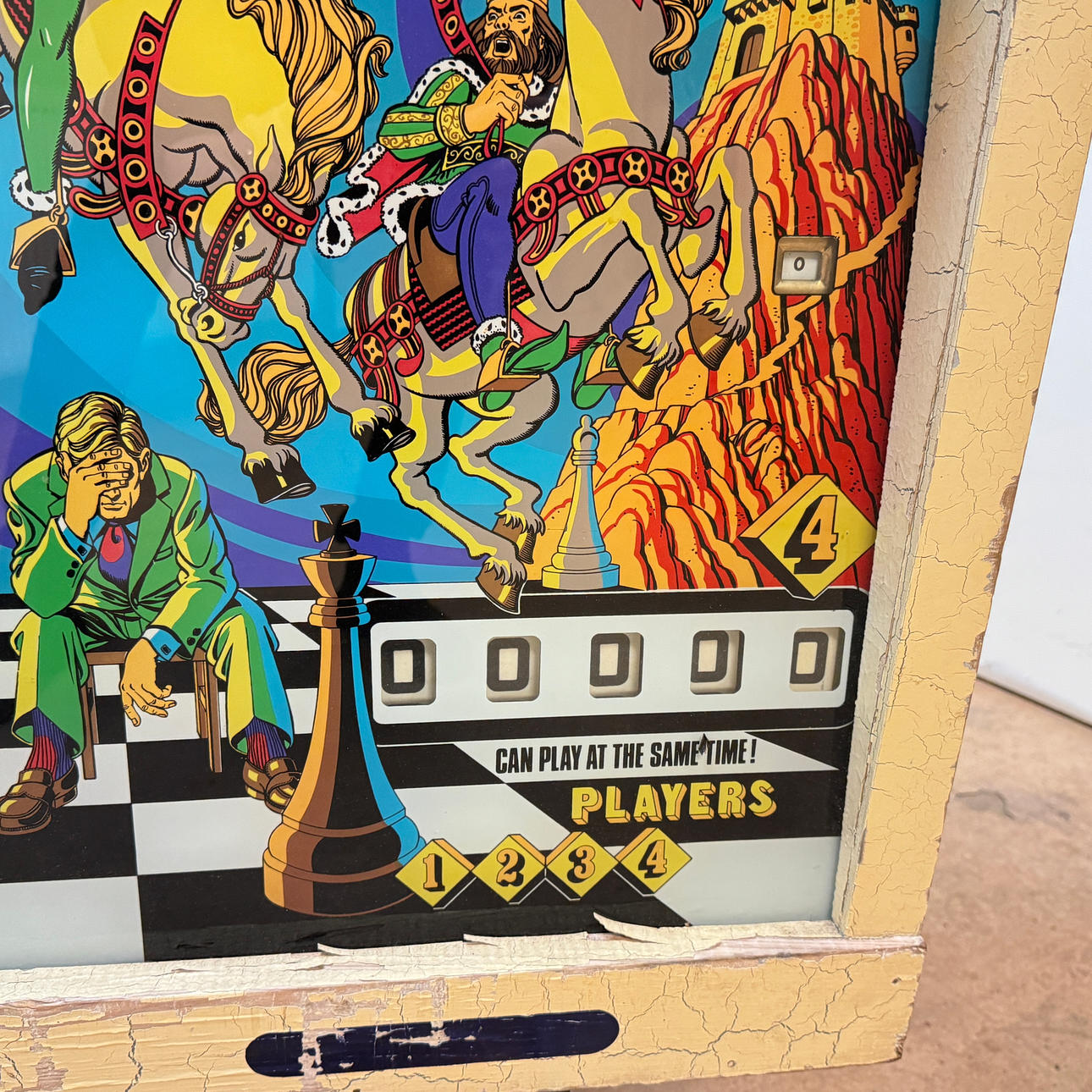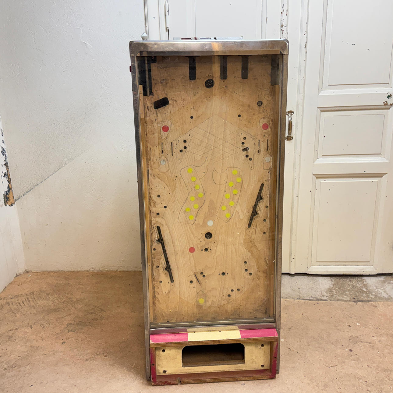 Rear glass in good condition. Cabinet ok for its age. Playing field plasters ok. Game plan bad. It lacks a back door. The game is otherwise in good shape for its age.