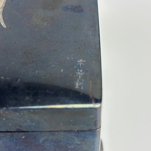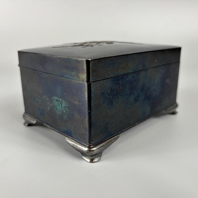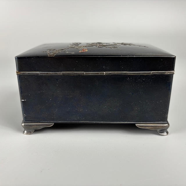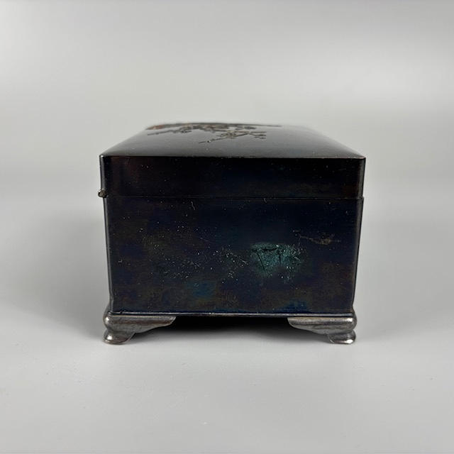 Japanese metalwork box with design of Cockerel on blossom branch approximately 7.5 x 11 x 6cm.
