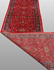 Saruk gallery model with red base color and a center field covered in floral ornaments, palmettes and arabesques in dark blue, beige and green. The border has a dark blue base with decoration of palm branches. The forelock is made of wool and the warp is of cotton.