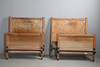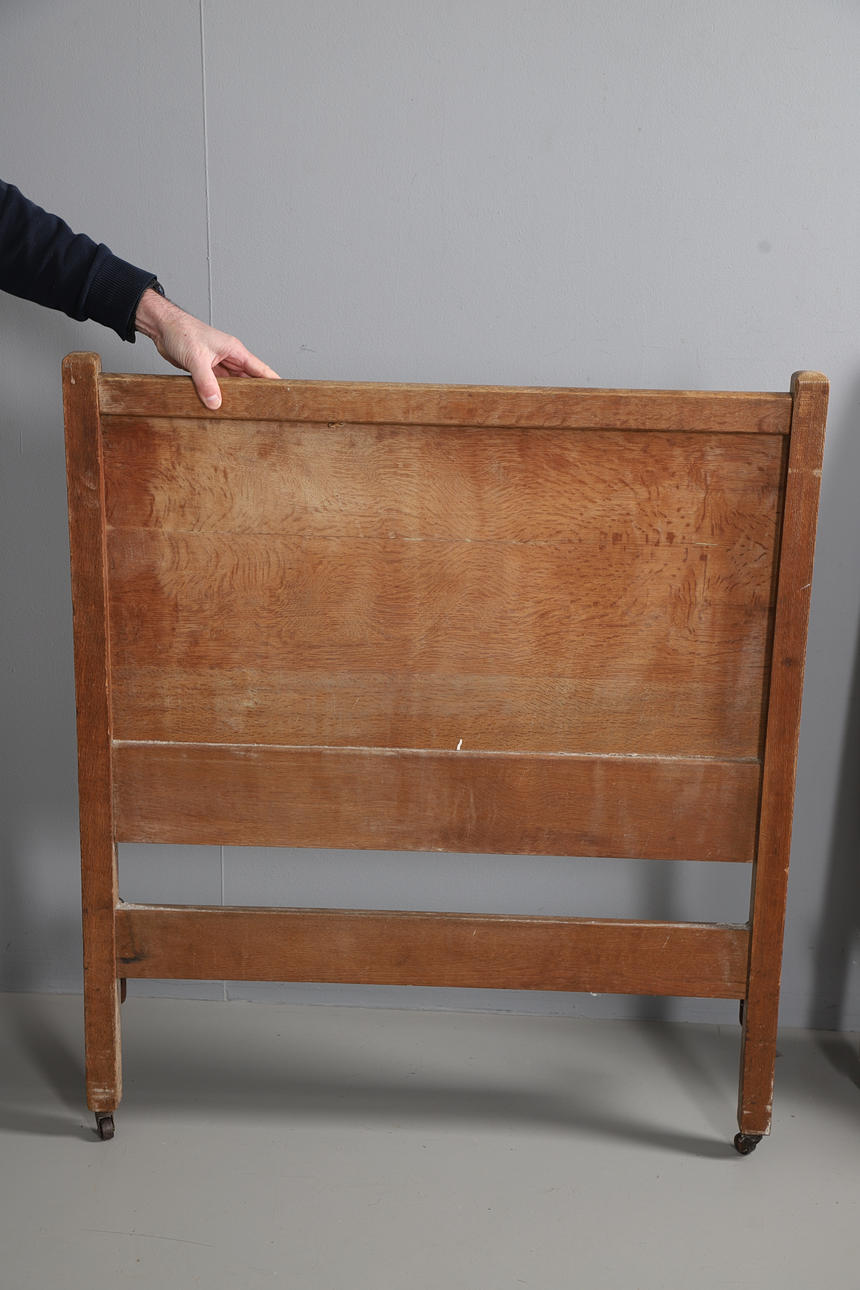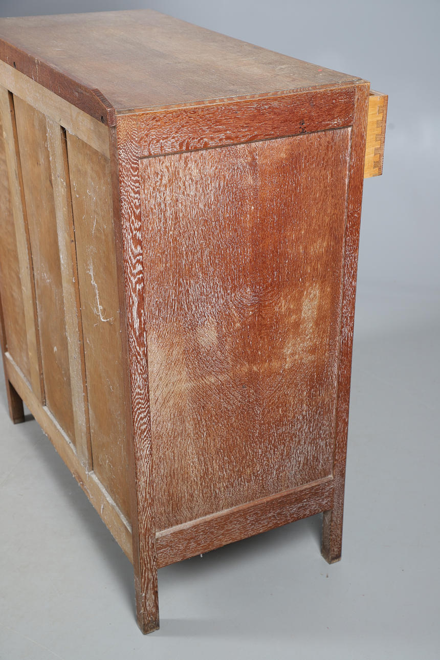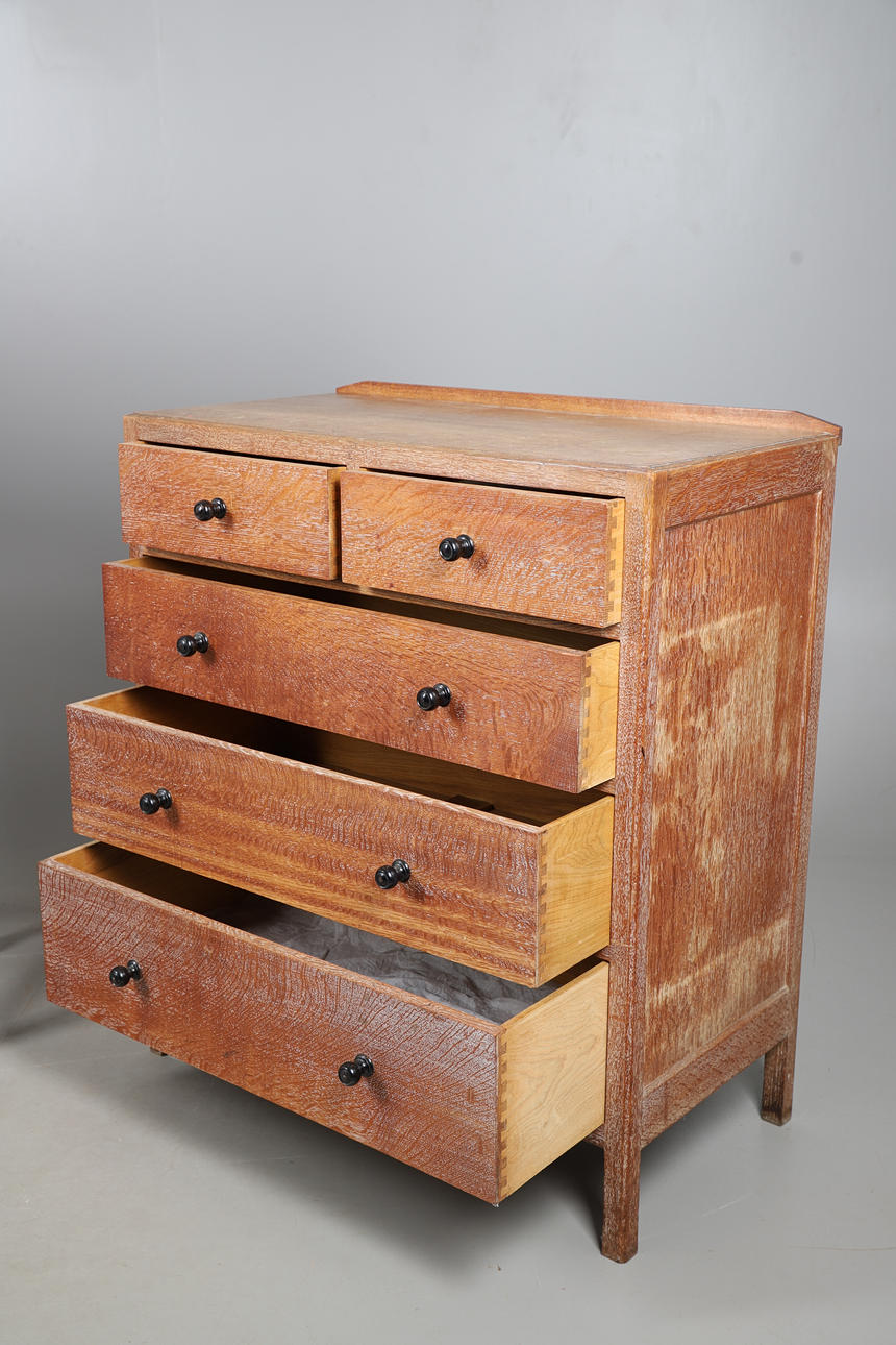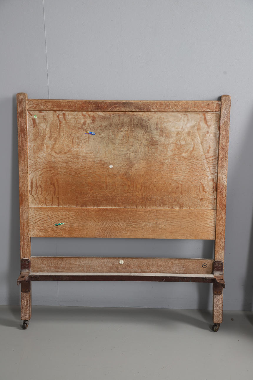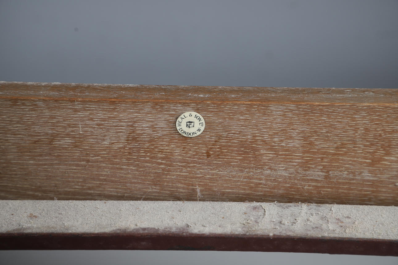 Including a limed oak chest of drawers with two short drawers over three larger drawers, and with turned handles (top 91cms by 48cms, 106cms high), a dressing table with an arrangement of four drawers (137cms high), and two single beds with irons (3ft beds). The chest and dressing table with Heals buttons to the drawers, beds also with buttons. (4).