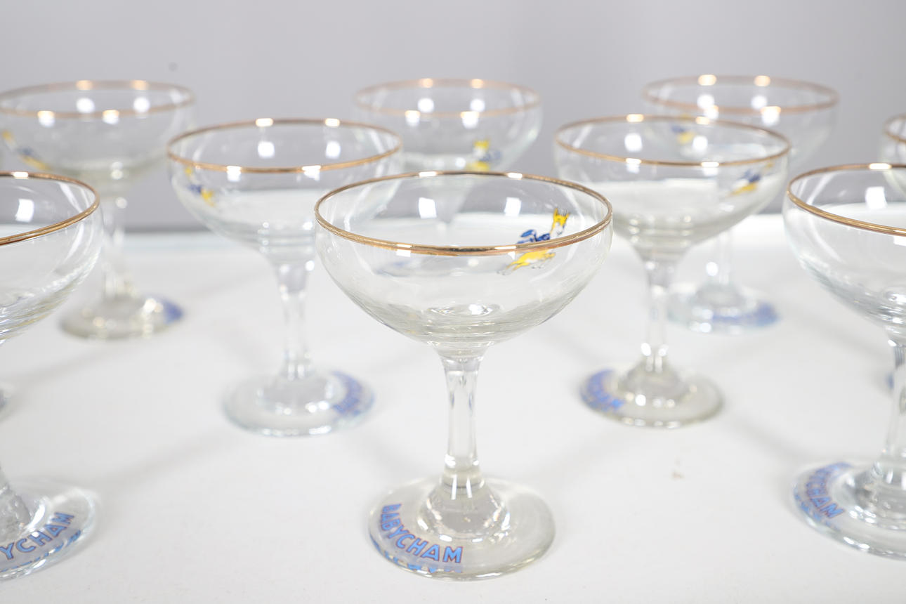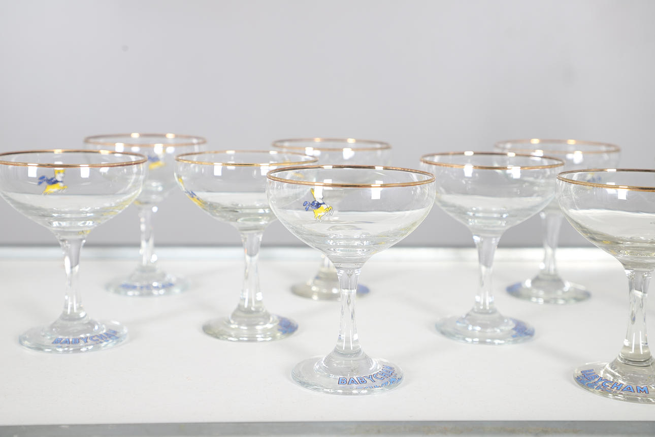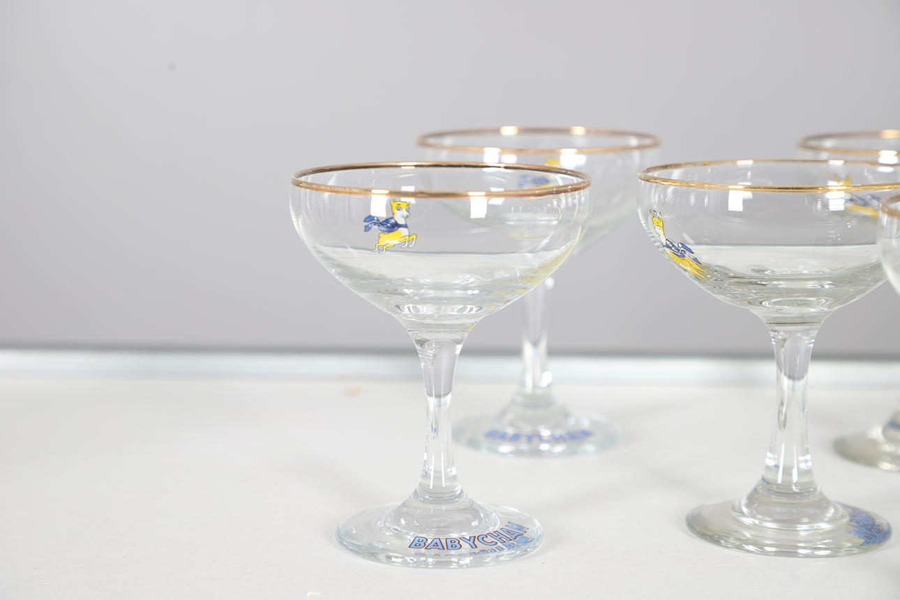 TWELVE BABYCHAM COUPE GLASSES WITH LOGO.