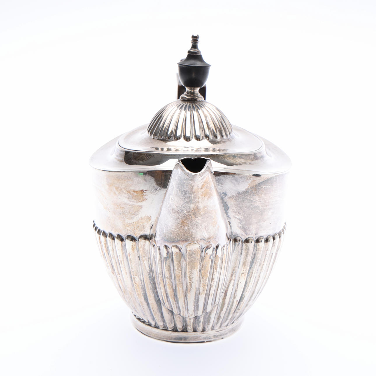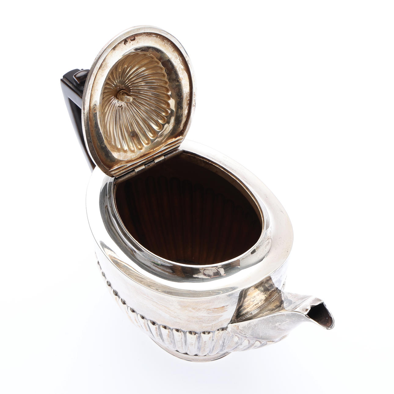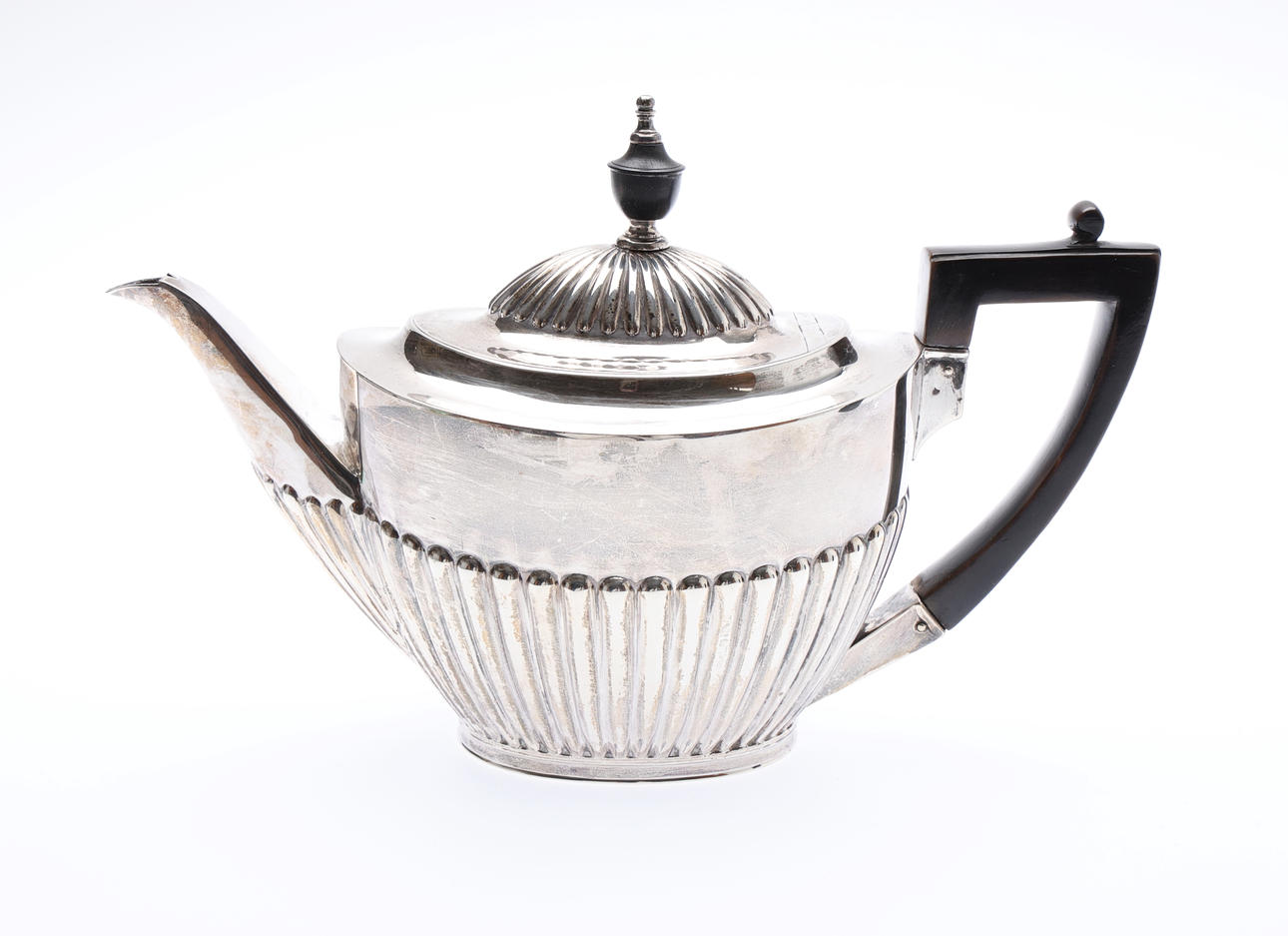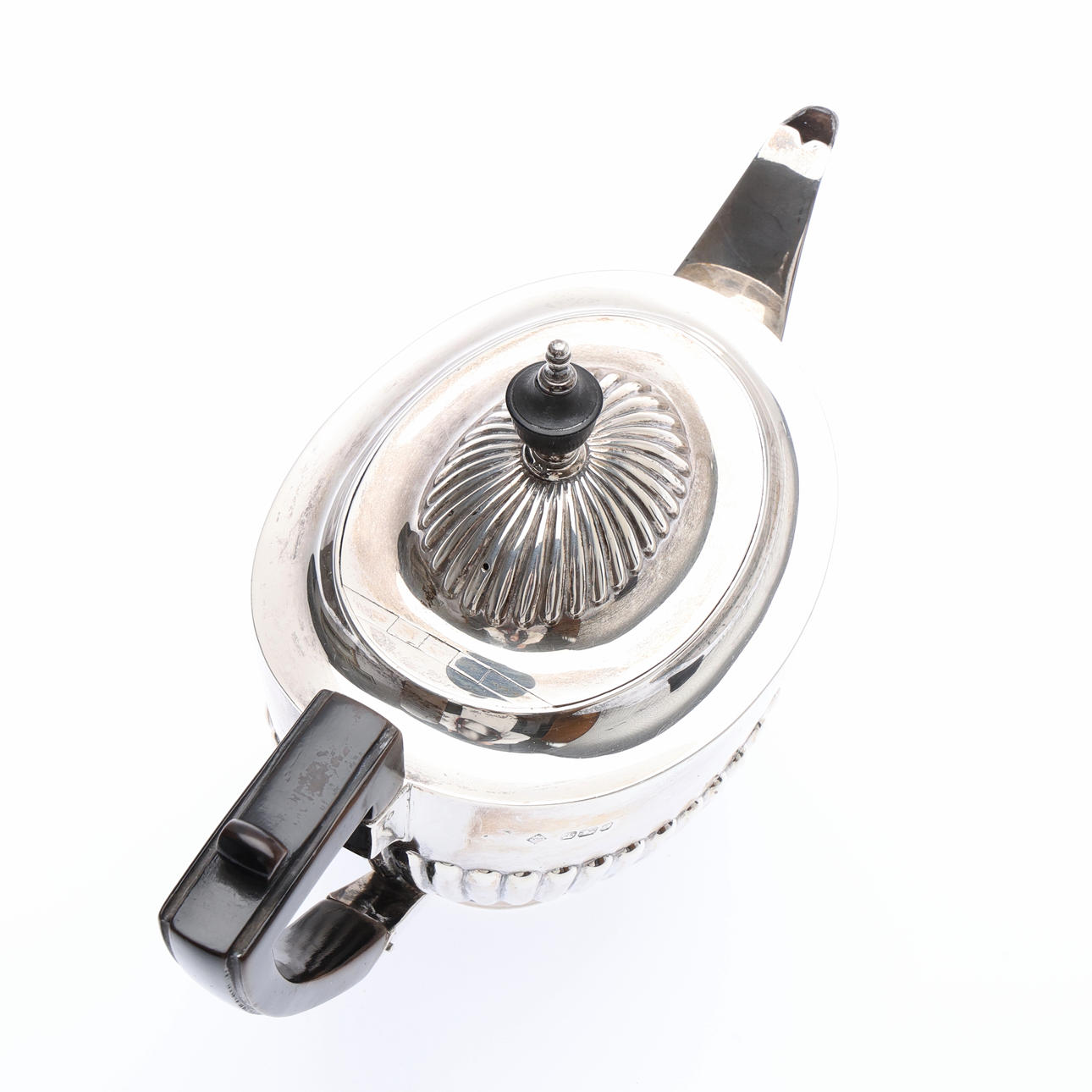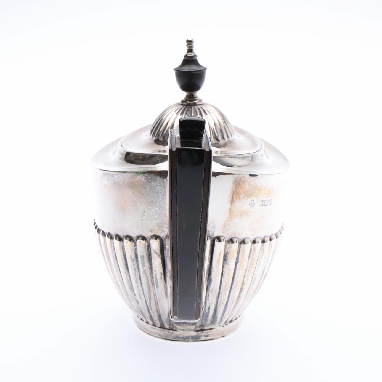 with a semi-reeded hinged cover and body, ebonised urn finial and handle, by Mappin Brothers, Sheffield, 1897, W.24.5cm, gross 472grs.