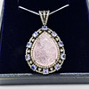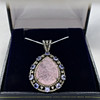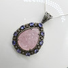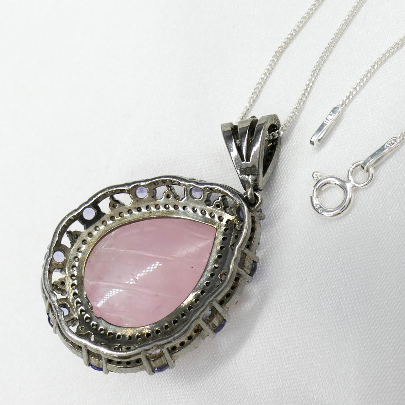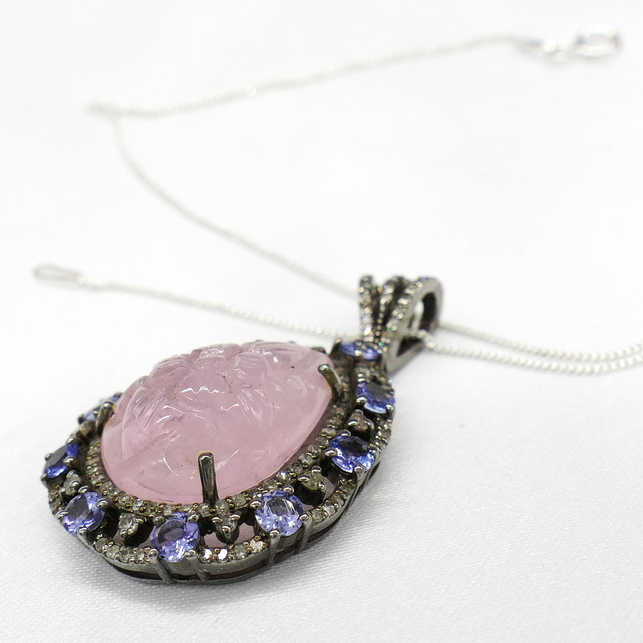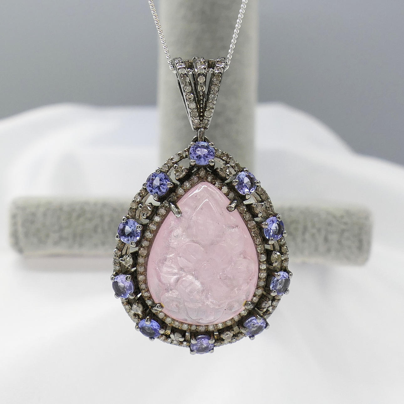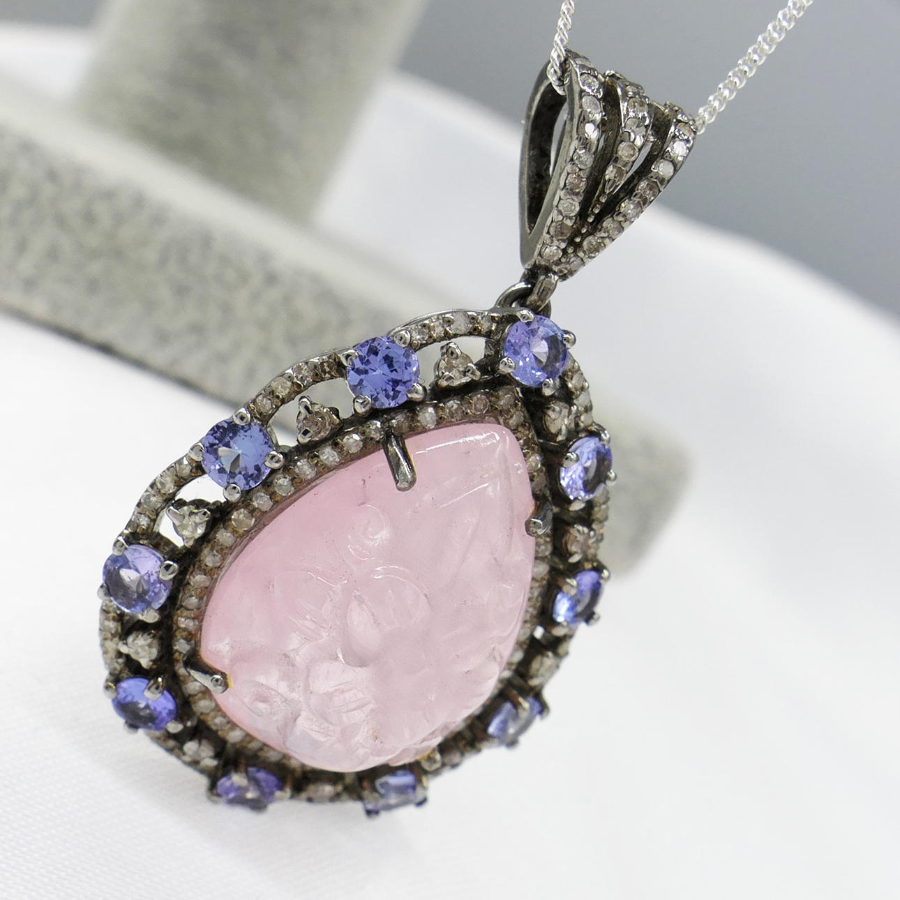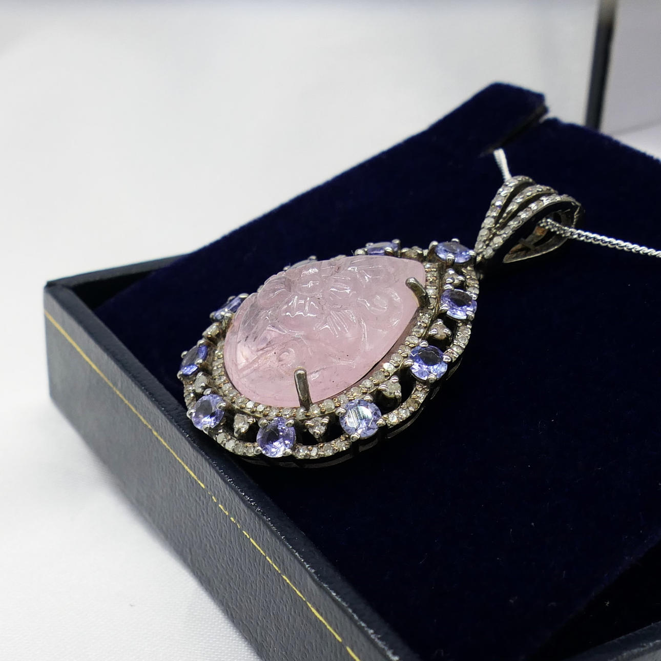 A silver pear shaped pendant set with a carved morganite, tanzanites and diamonds on a silver chain, with gifting box
