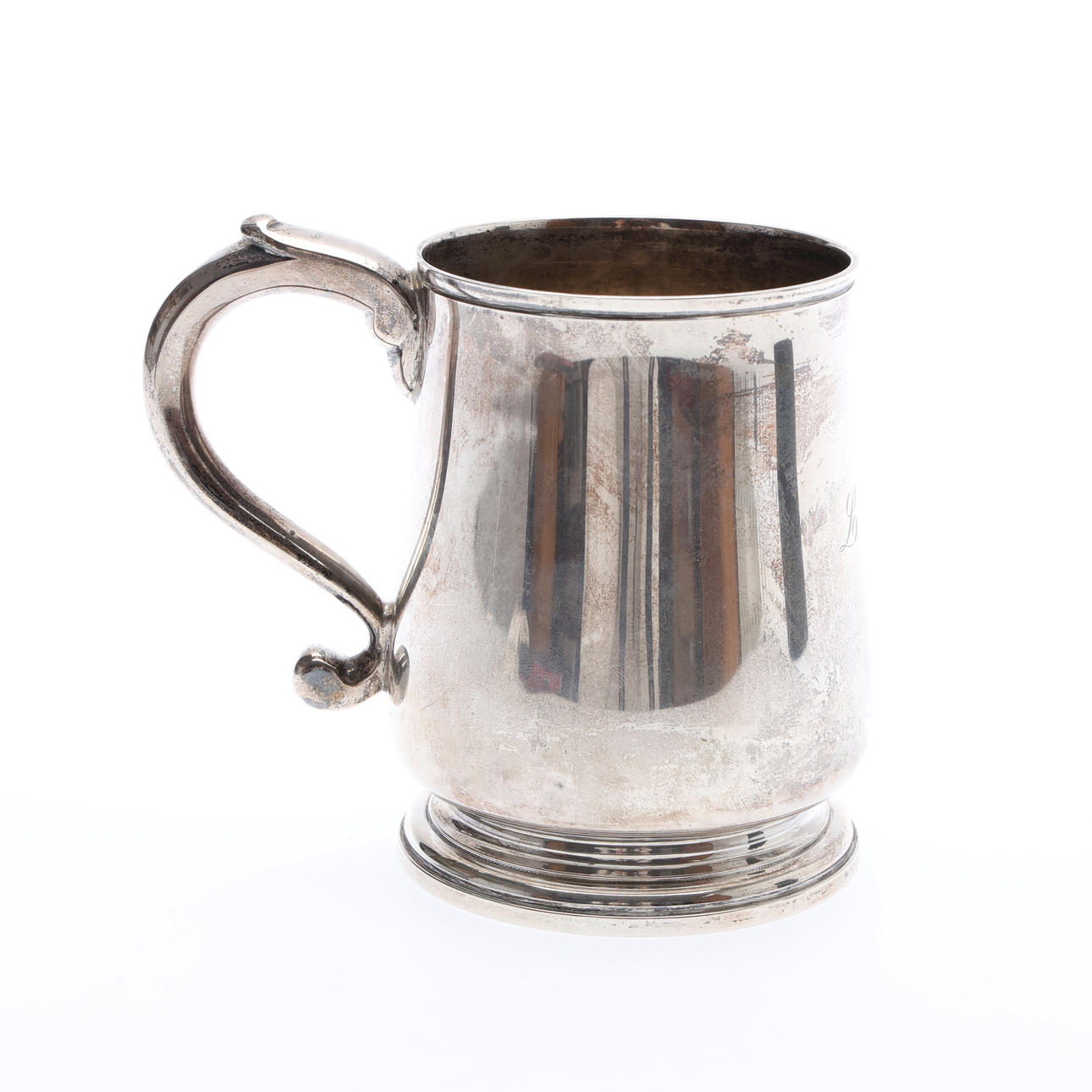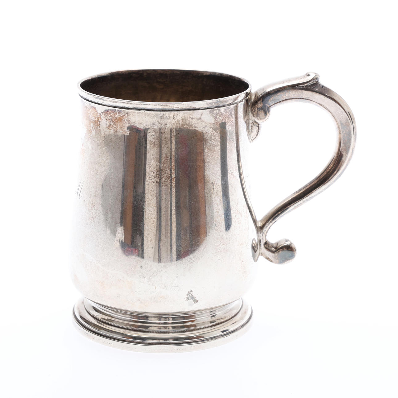 Of slight baluster form with a scroll handle, initialled "L. A. M.", on a stepped circular foot, by William Comyns & Sons Ltd., London, 1960, H.9.5cm, 222grs.