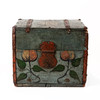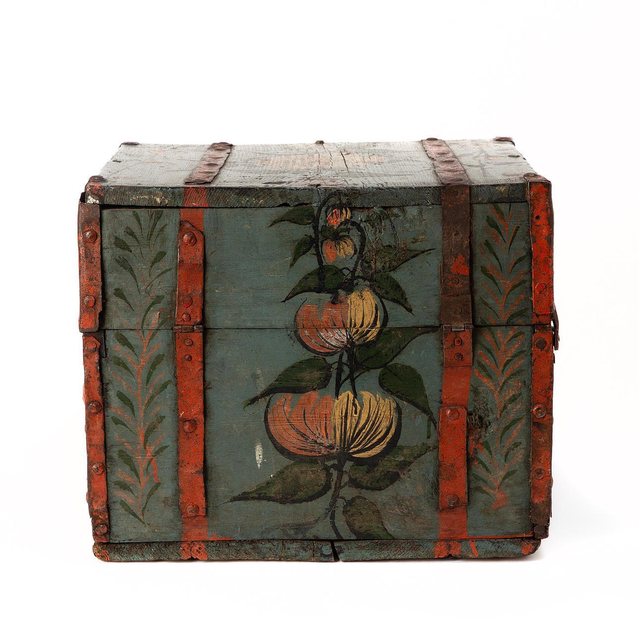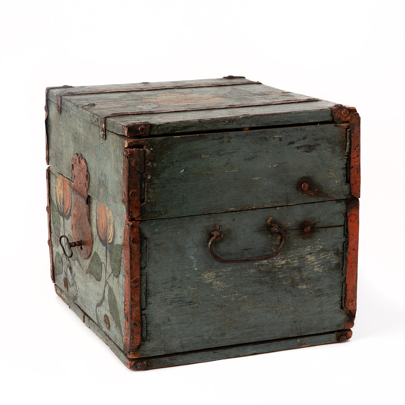Decor with flowers on a dove blue base. red-painted moldings and locks. Interior with six compartments. Height 29 cm, length 35 cm, width 29 cm.