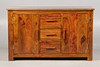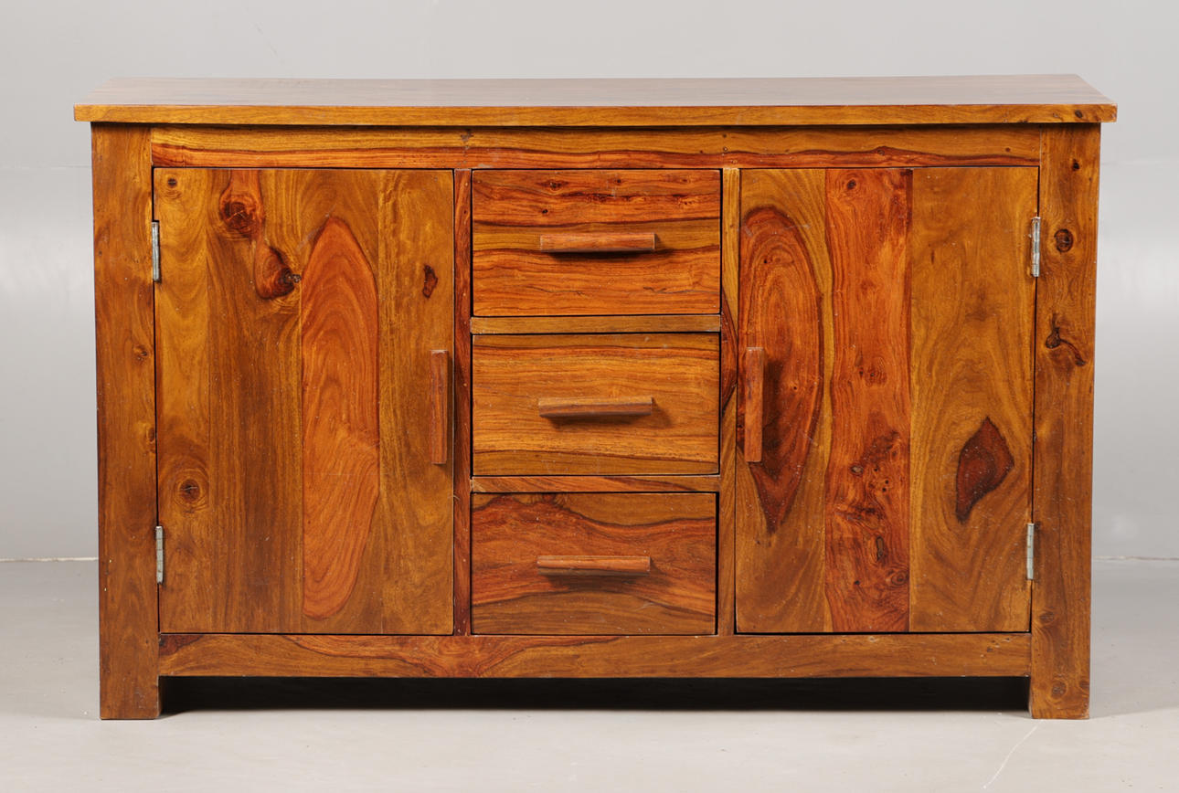 Fitted with three drawers and a cupboard door either side, 139.5 cm wide, 85 cm high, 45 cm deep.