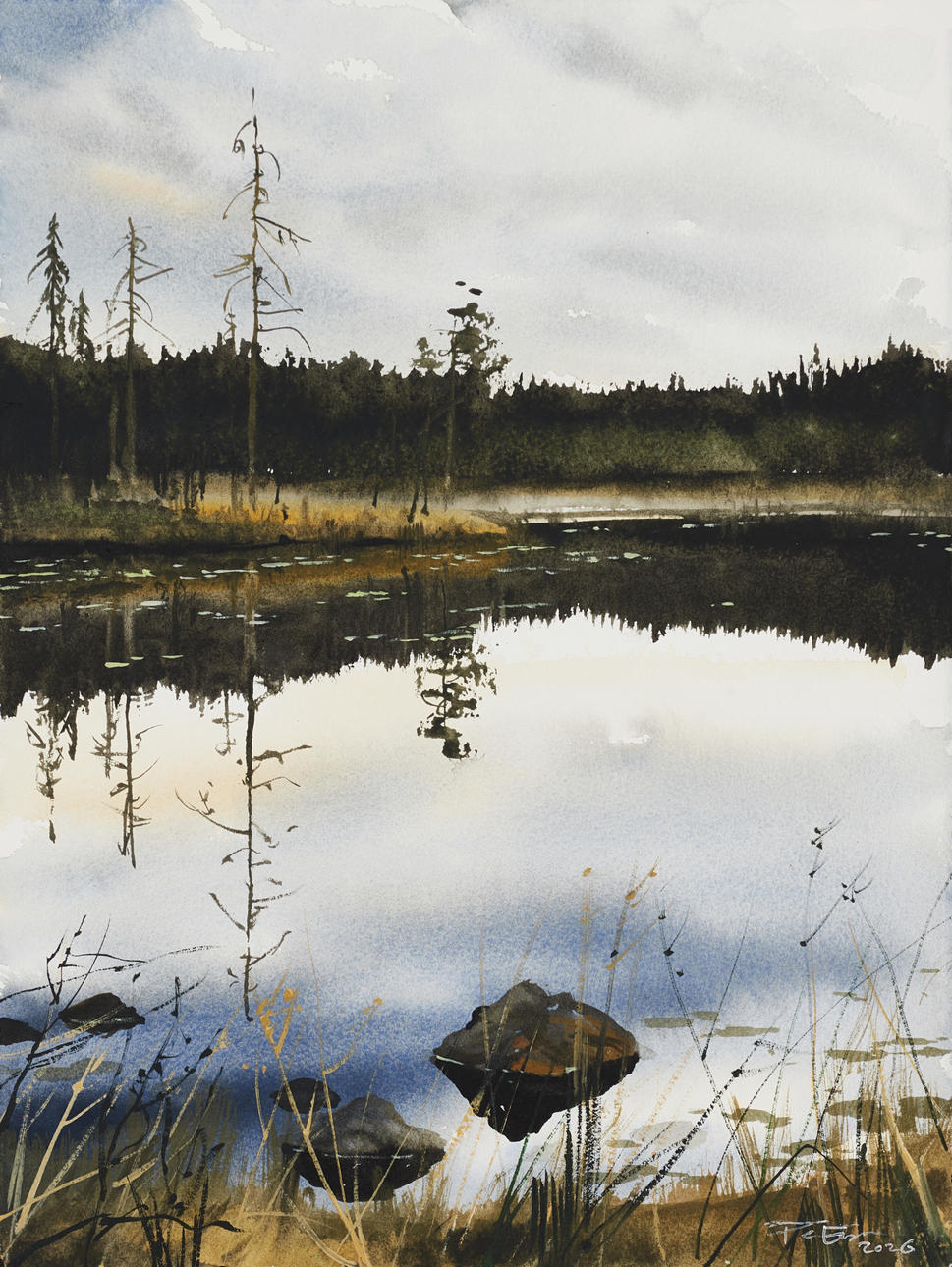 Peter Eugén Nilsson was born in 1978 in Sundsvall, but now lives and works in Stockholm. He has established himself as a popular watercolour and nature painter, with a large number of exhibitions both nationally and internationally. He draws inspiration from the forests of his childhood – dramatic and beautiful motifs where water is often central and water lily motifs are his hallmark.