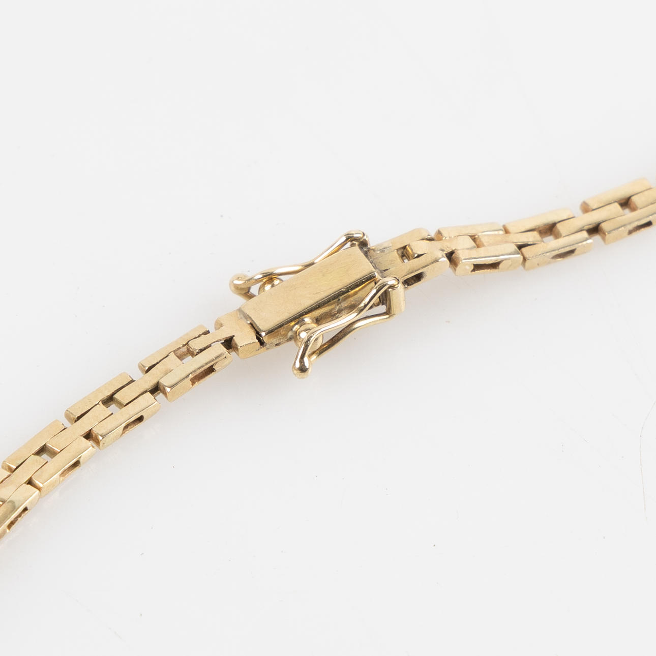 Link 'Brick', dosed width about 3-6 mm. L about 42 cm. Coffin lock with safety hooks. Tagged 'SEJ, 585'. Box is included.