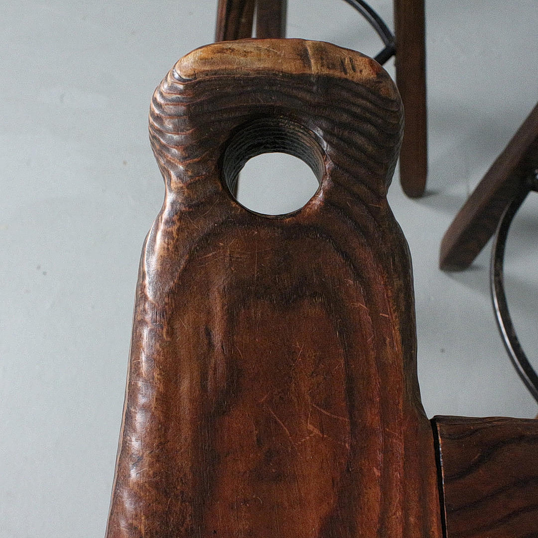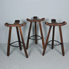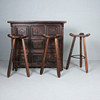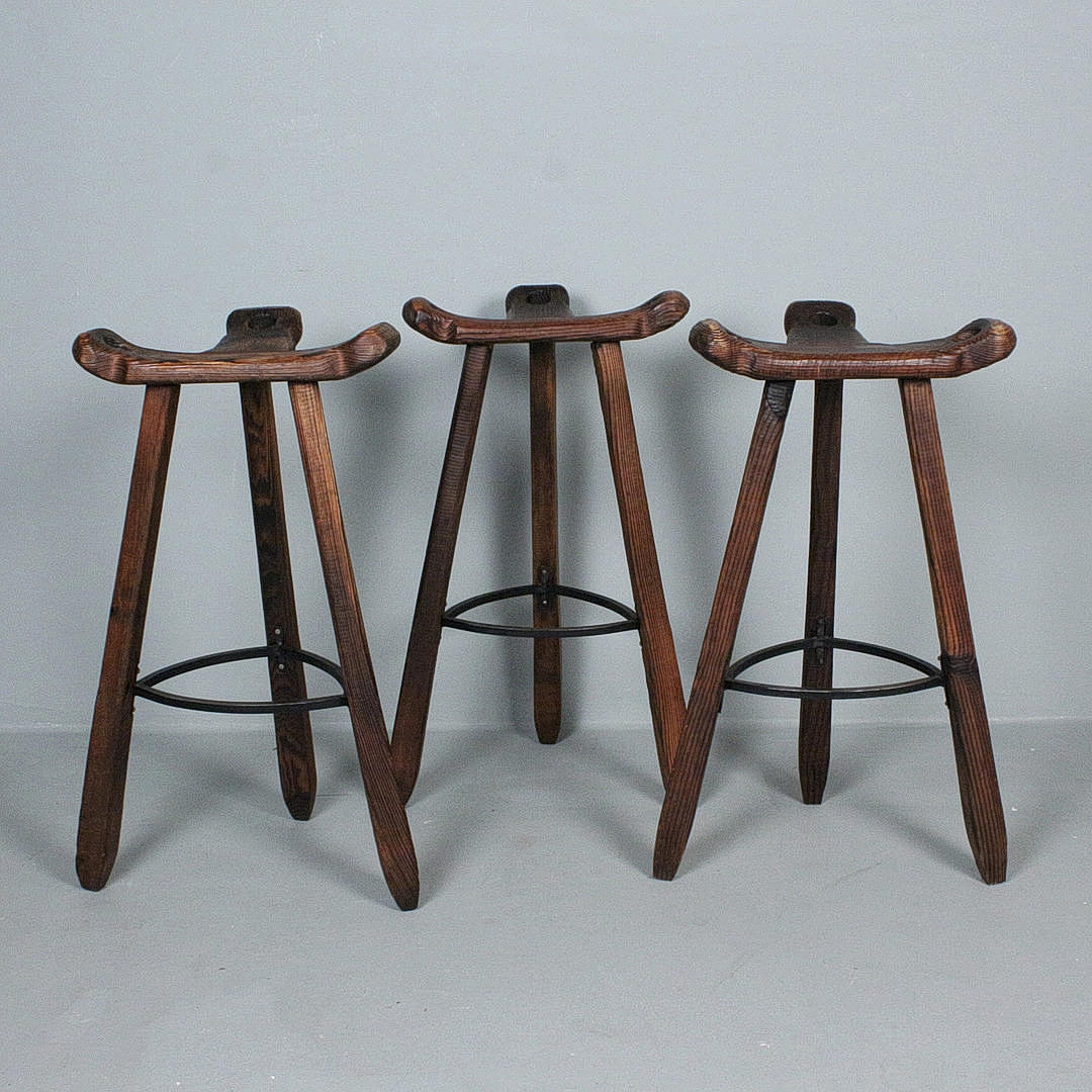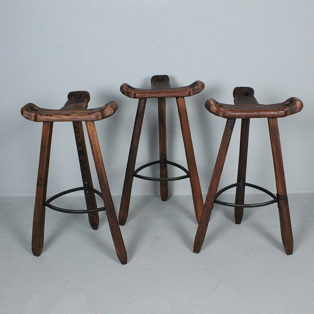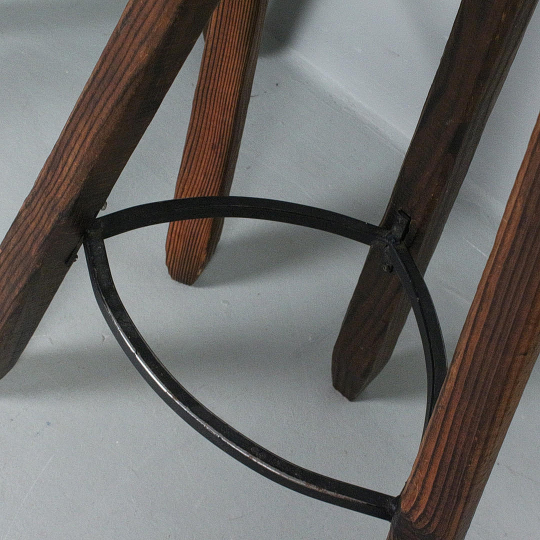 Brutalist bar with three stools, Spain, 1960s, dark stained softwood bar and stool, stool with black painted steel footrests,