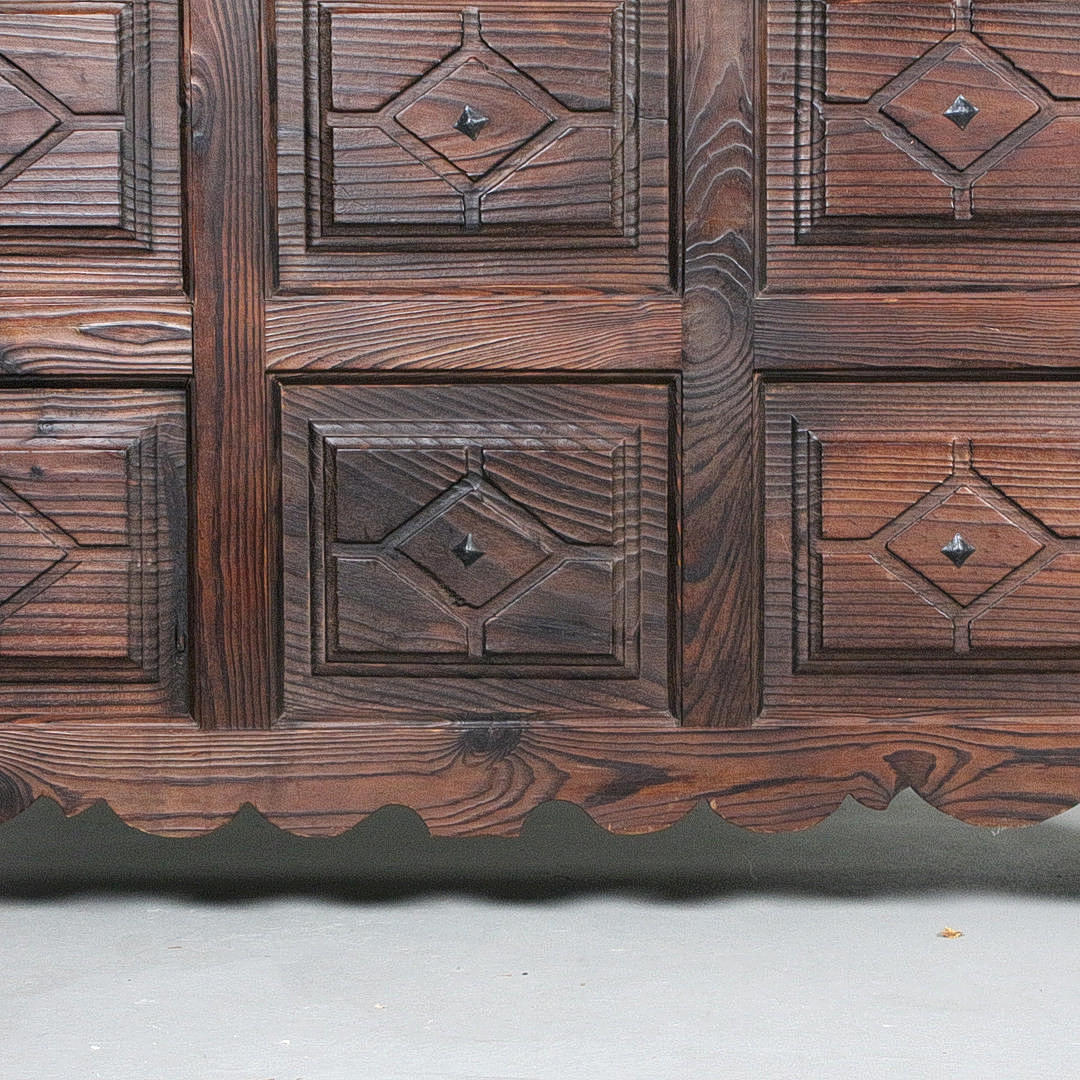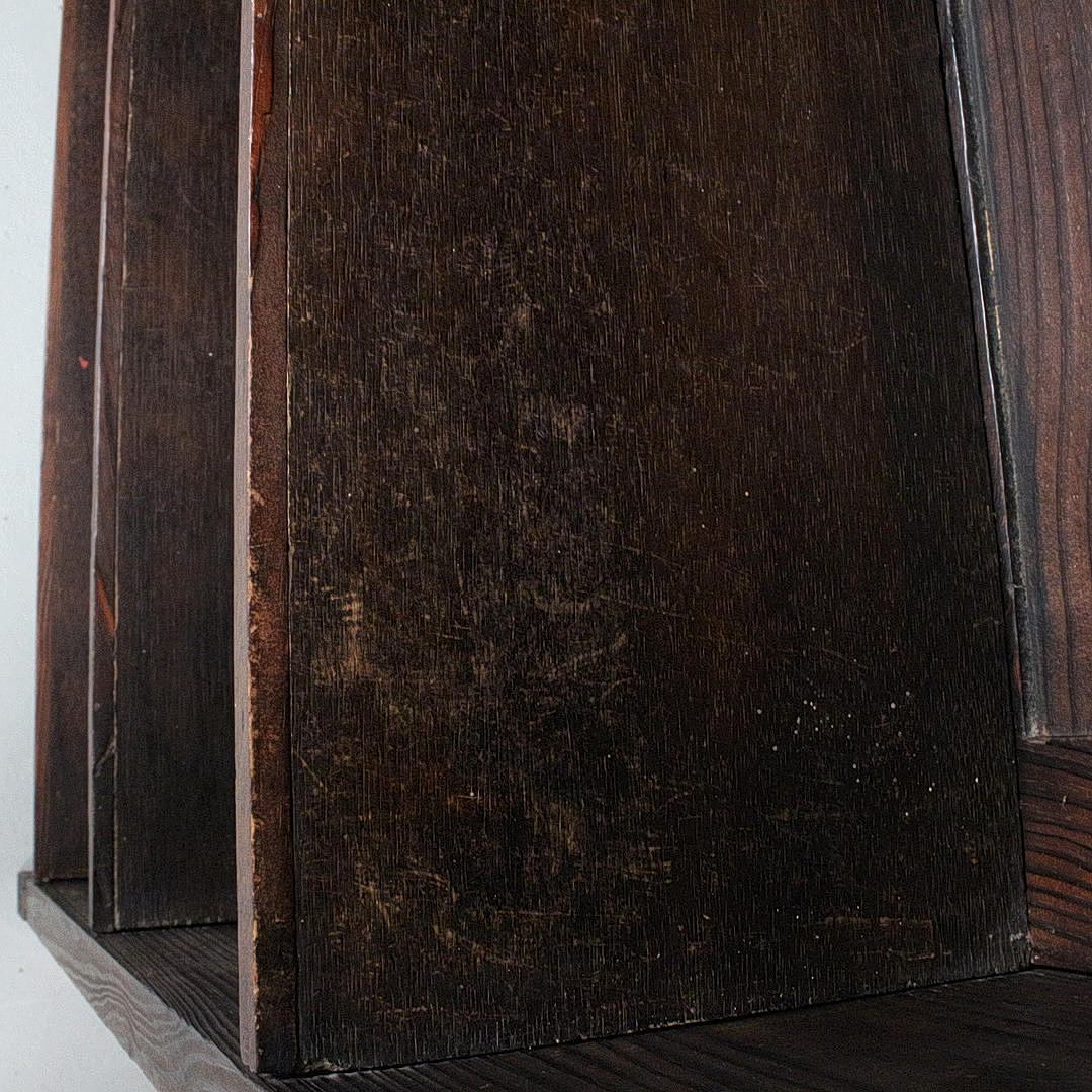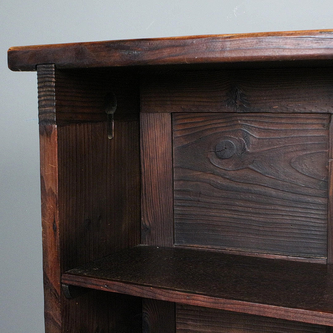 Brutalist bar with three stools, Spain, 1960s, dark stained softwood bar and stool, stool with black painted steel footrests,