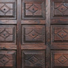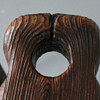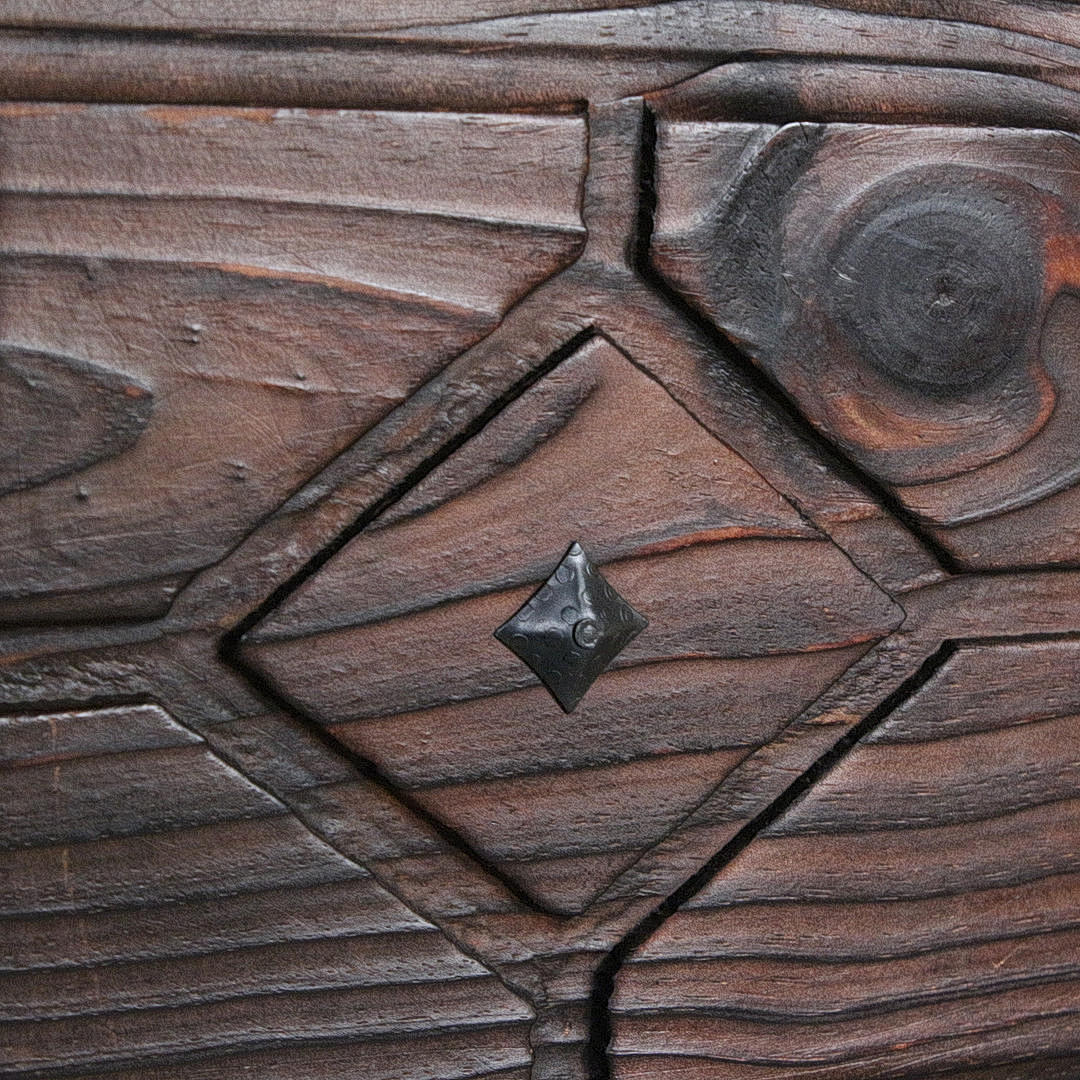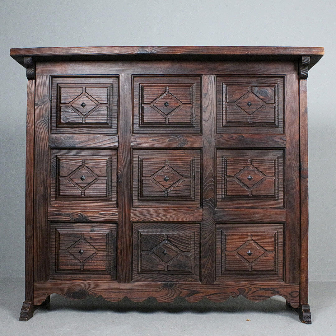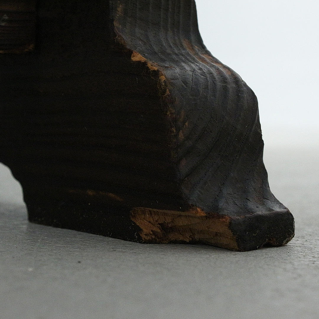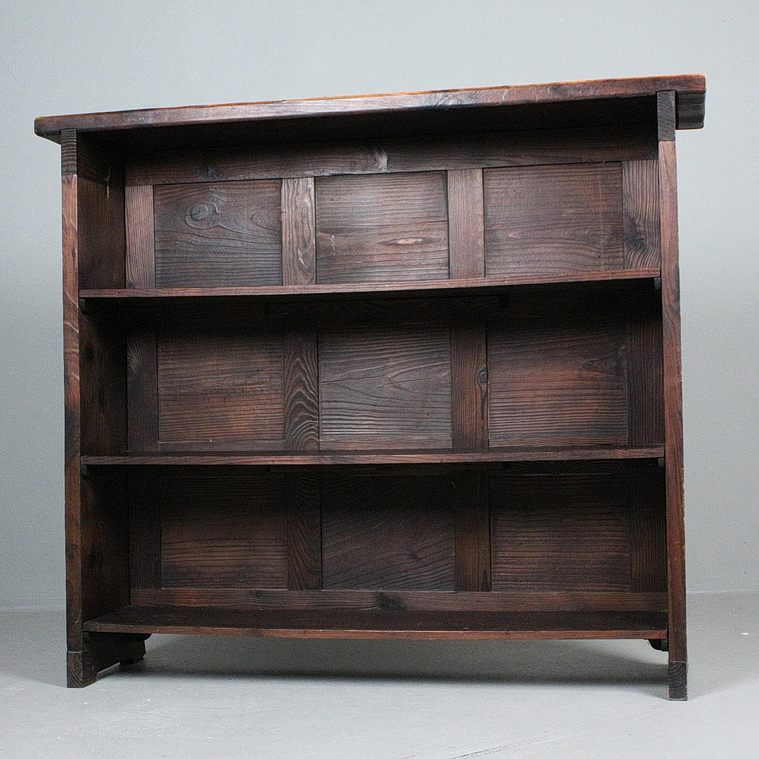 Brutalist bar with three stools, Spain, 1960s, dark stained softwood bar and stool, stool with black painted steel footrests,
