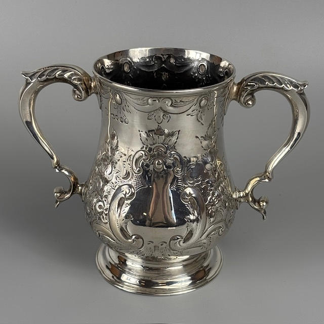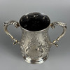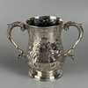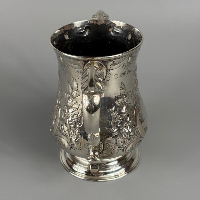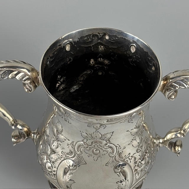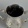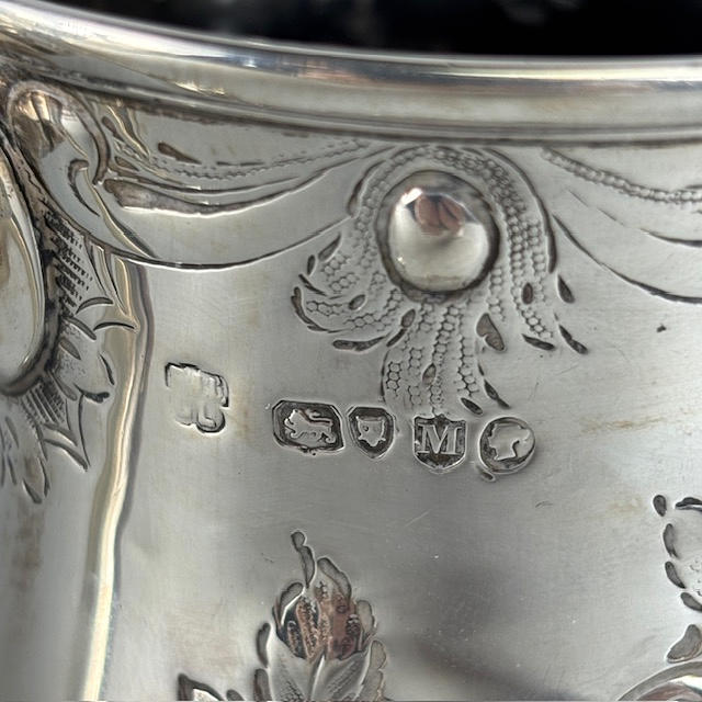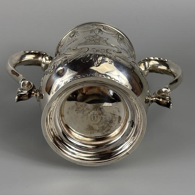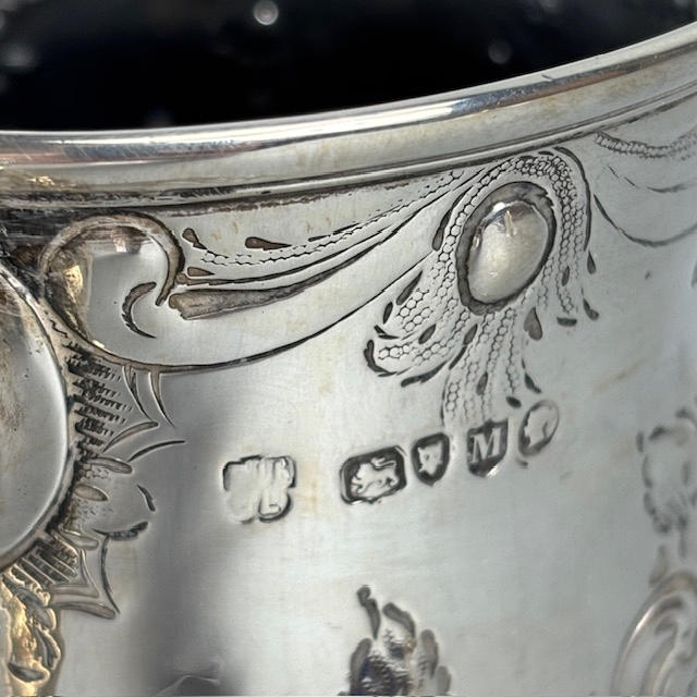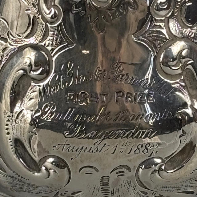Victorian fully hallmarked English silver trophy cup with embossed decoration, engraved 'West Gloster Farmers Club, First Prize, Bull under 12 months, Bagendon August 1st 1887', approximately 13cm tall, 385g.