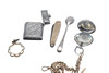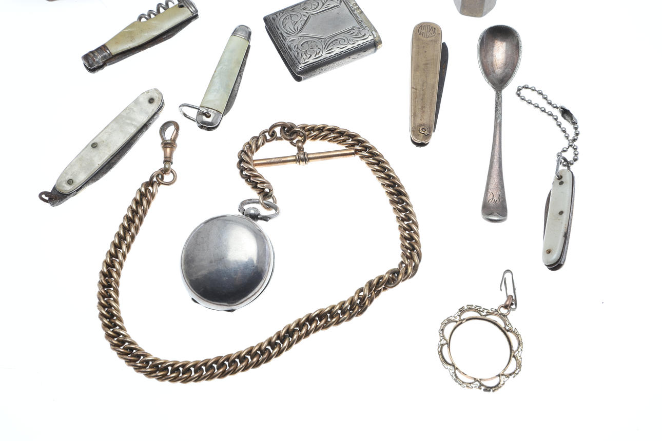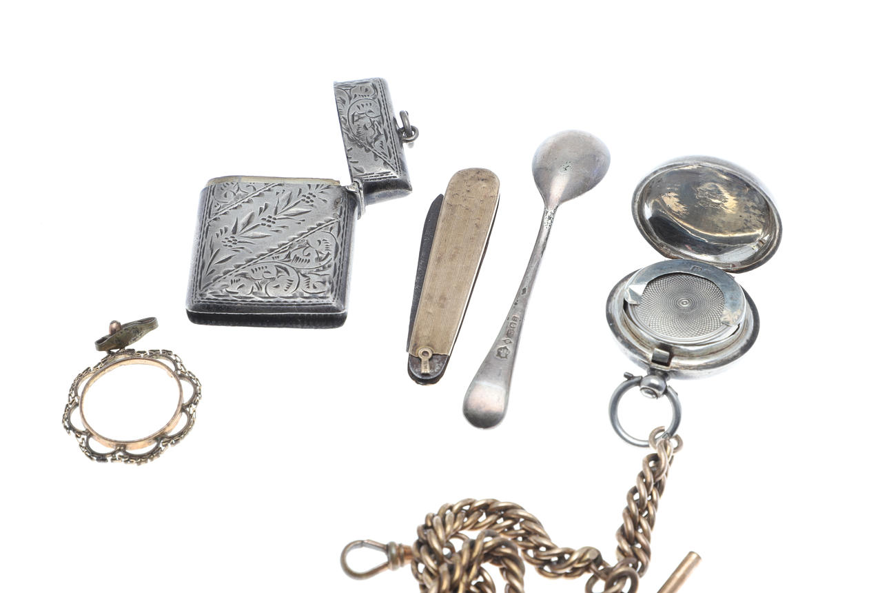 the plain Sovereign case hallmarked Birmingham 1906, the Vesta case Chester 1898, together with a silver salt spoon, a gold plated Albert and other items.