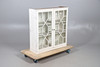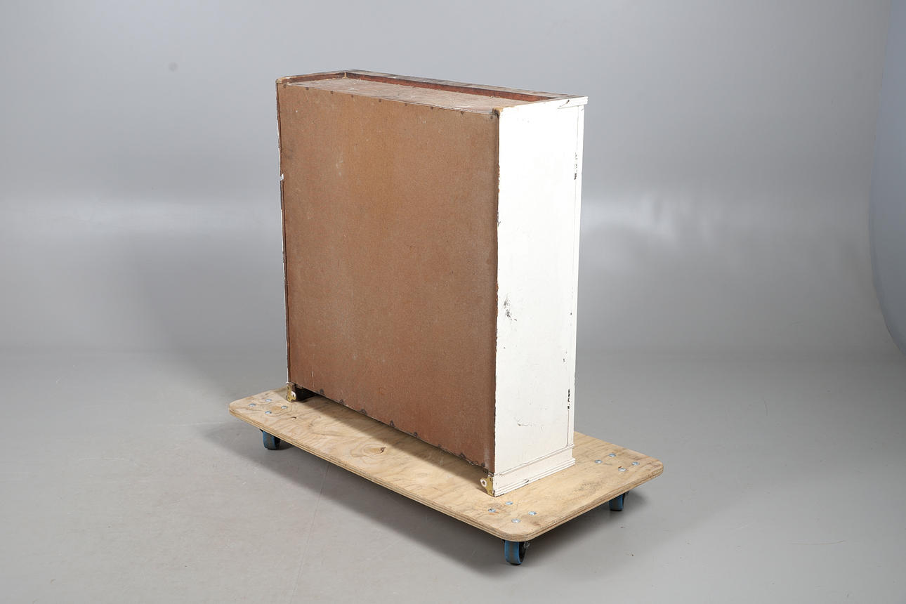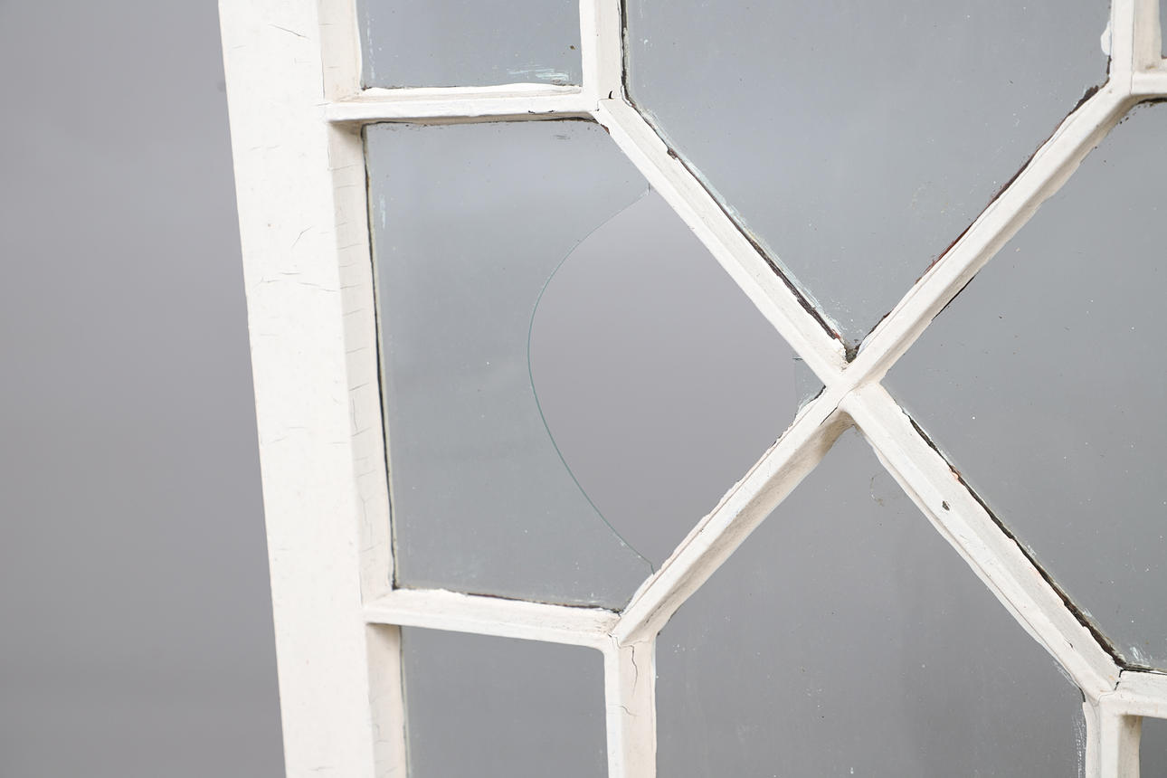 Some shrinkage splits and losses. Wear and marks to painted surface. Missing lock plate. Signs of old worm. A few sections of glazing broken. Other imperfections. See online images.