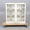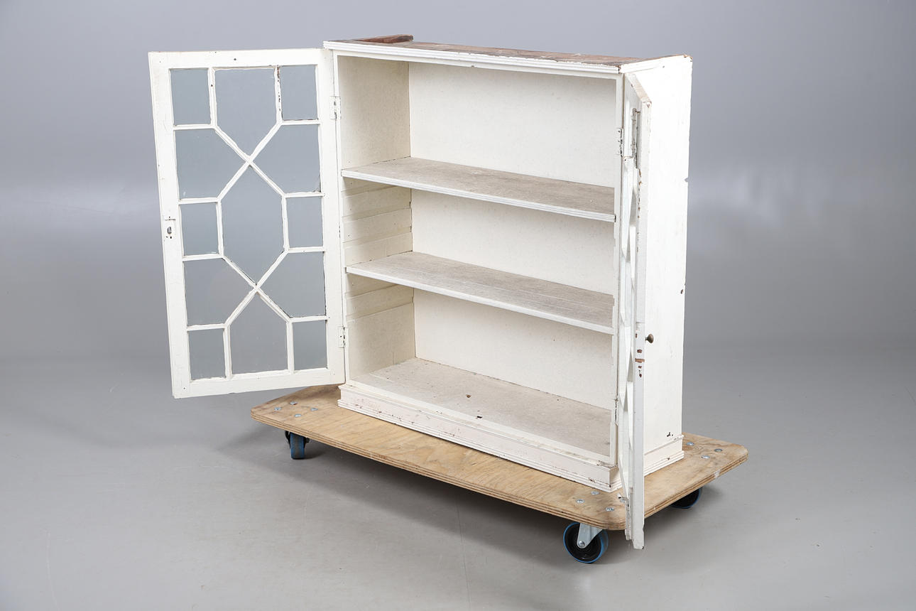 with astragal glazed doors opening to reveal fitted shelves, 92cm x 30cm x 98cm high.