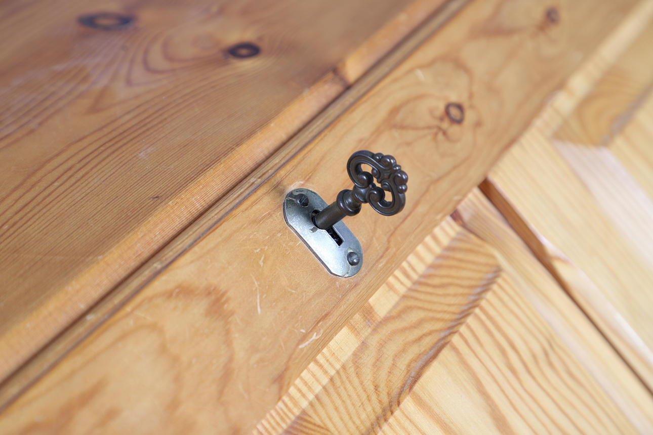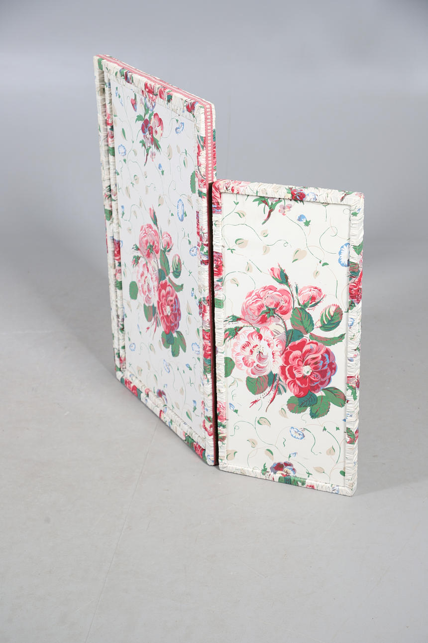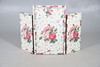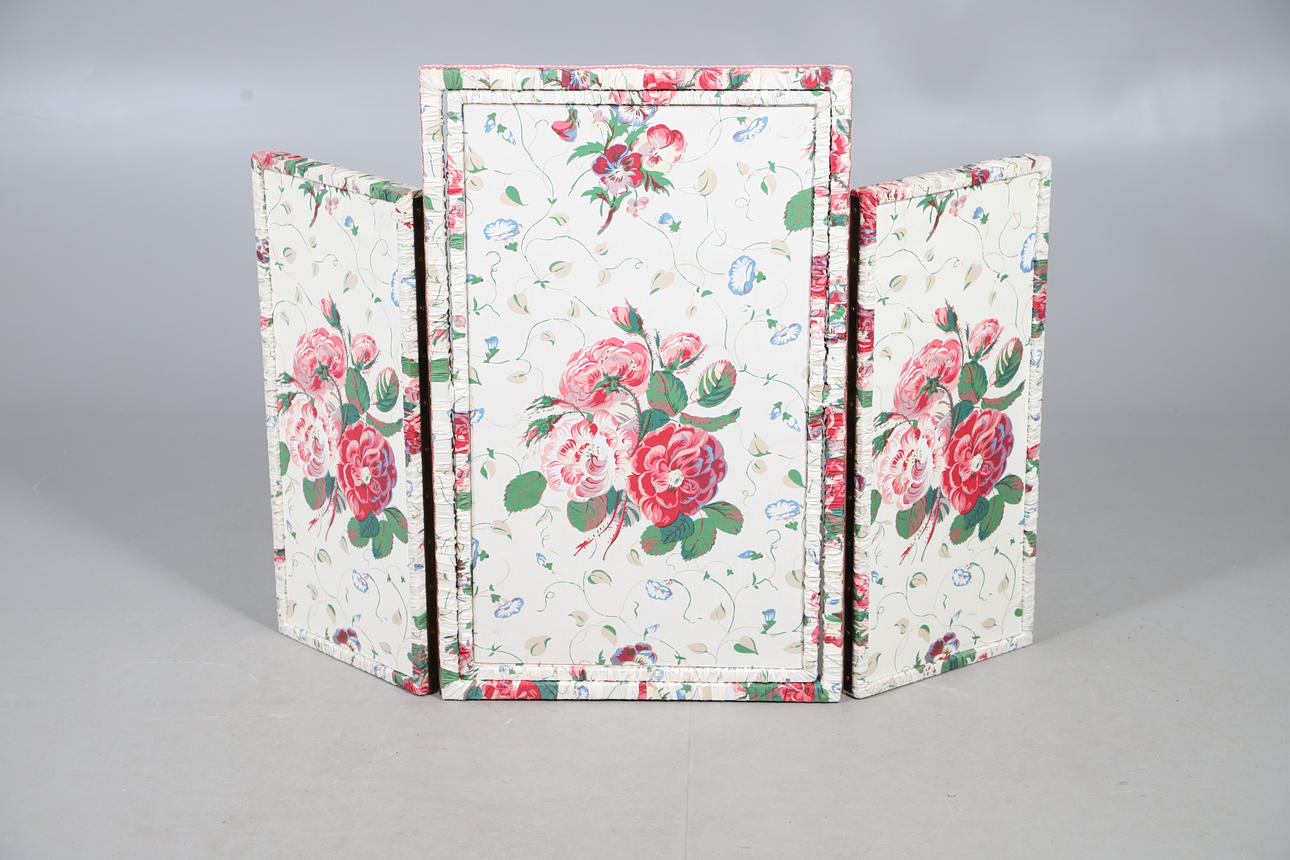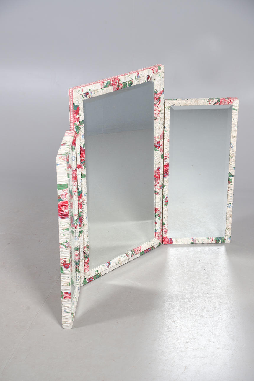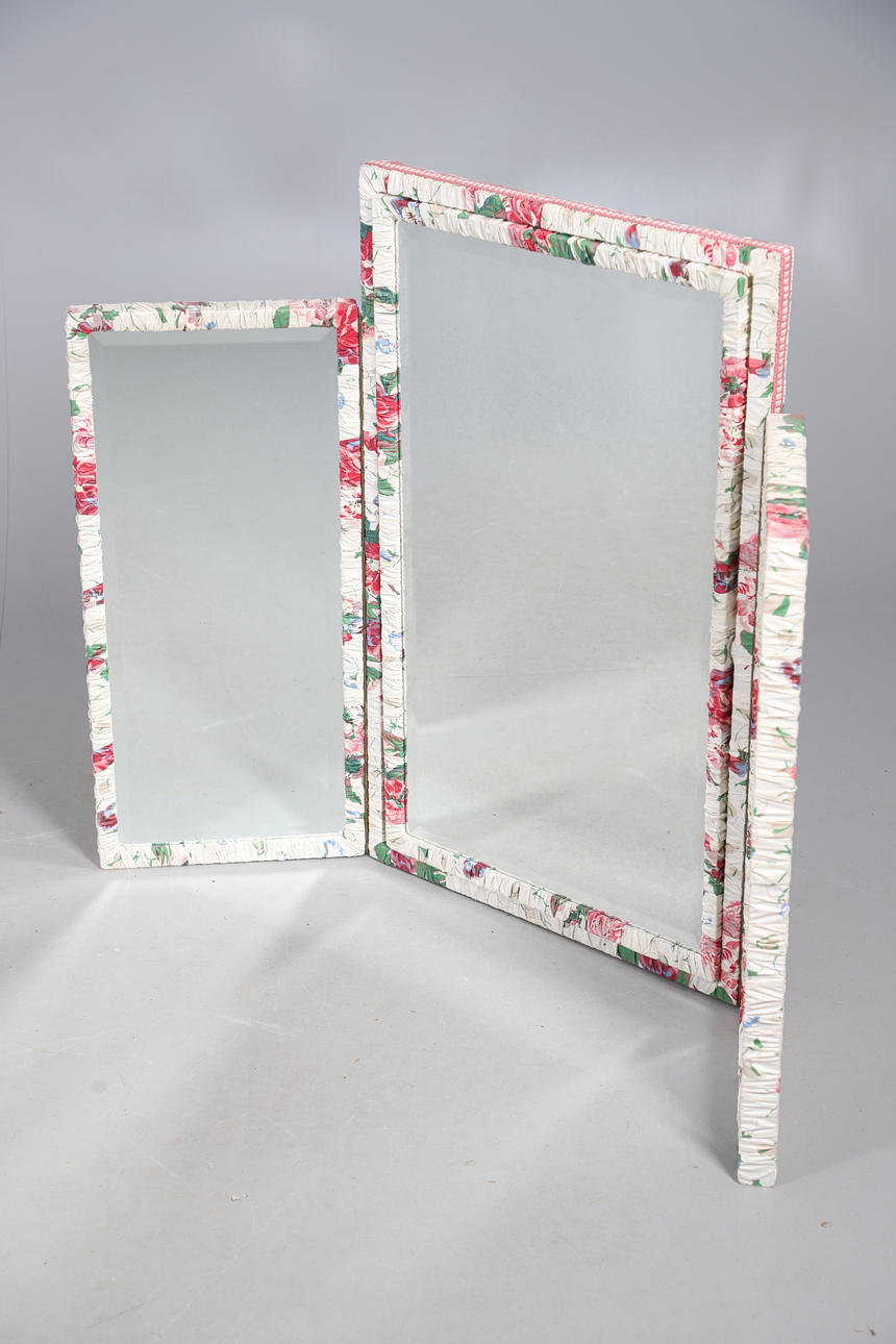 A modern pine bureau, 91cm high x 75cm wide x 45cm deep; together with a pine corner cupboard, 90cm high x 63cm wide x 37cm deep, and a chintz fabric covered triptych dressing table mirror, 81cm high x 50cm wide (folded) (3).