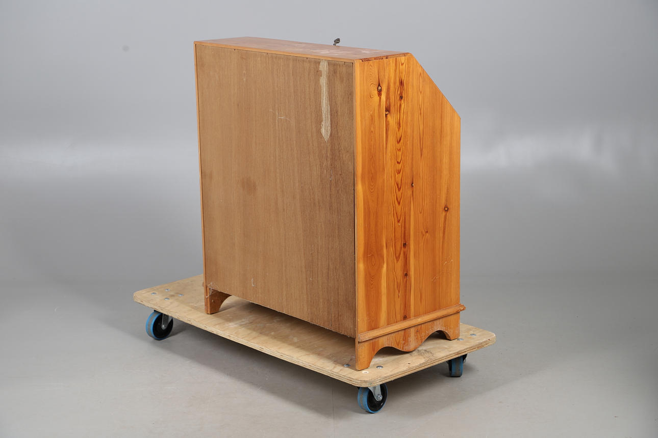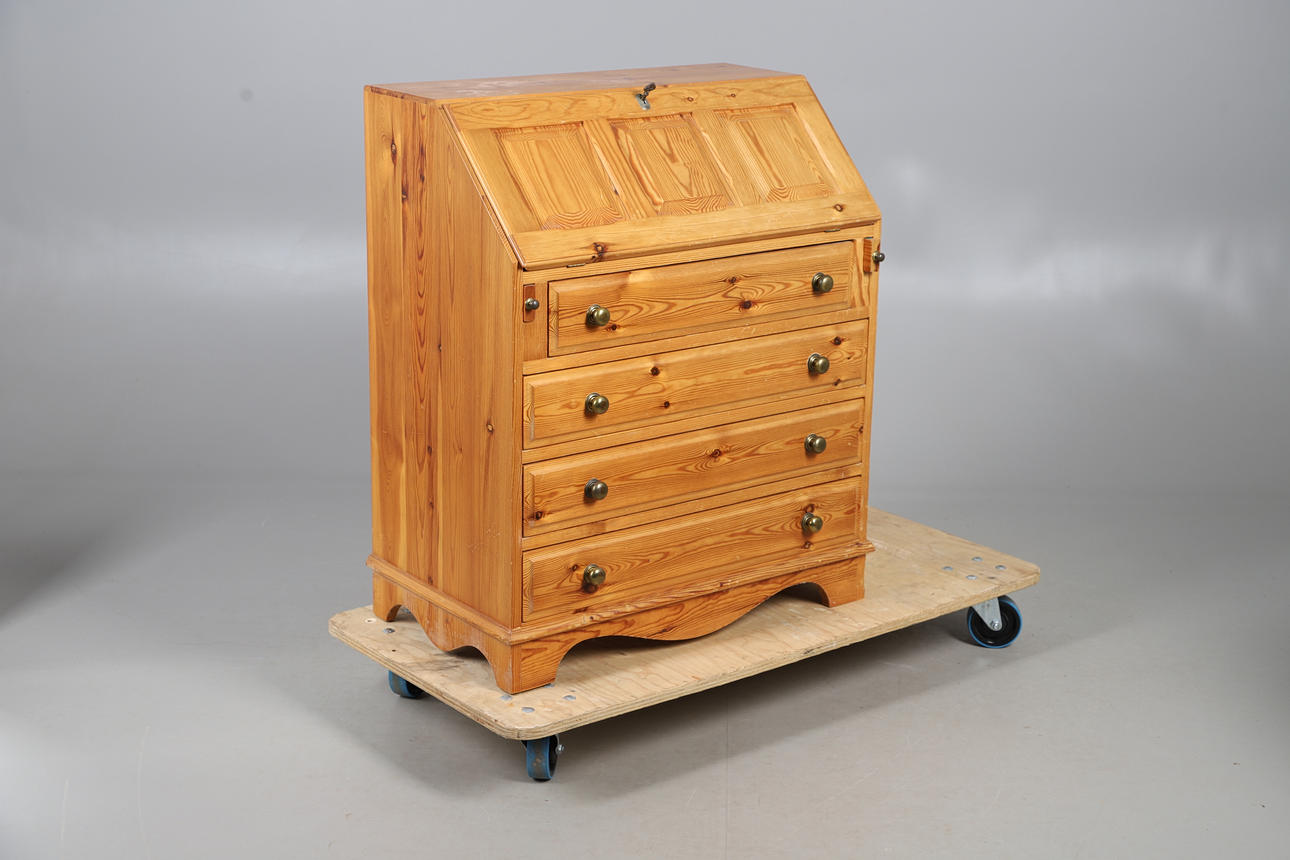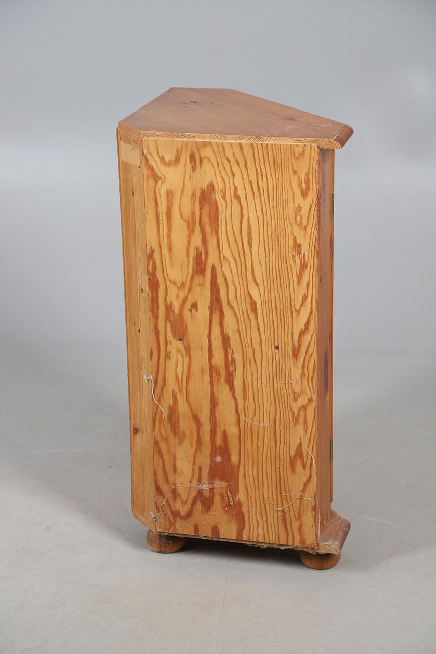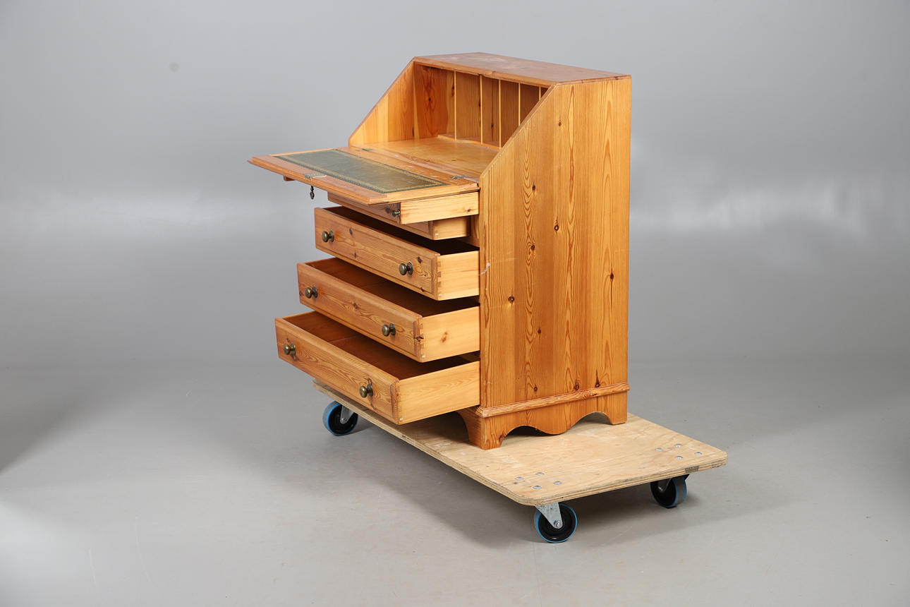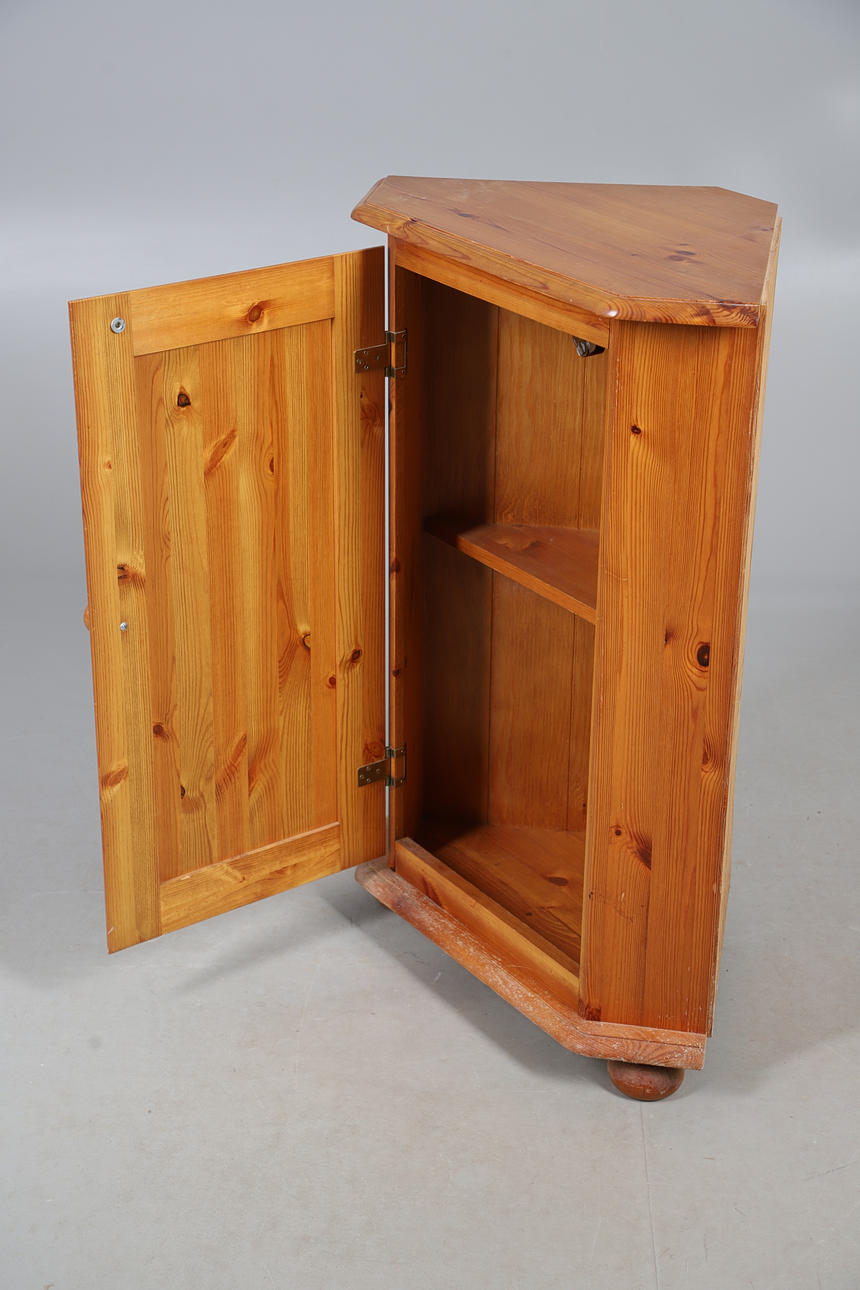 A MODERN PINE BUREAU, CORNER CUPBOARD AND DRESSING TABLE MIRROR.
