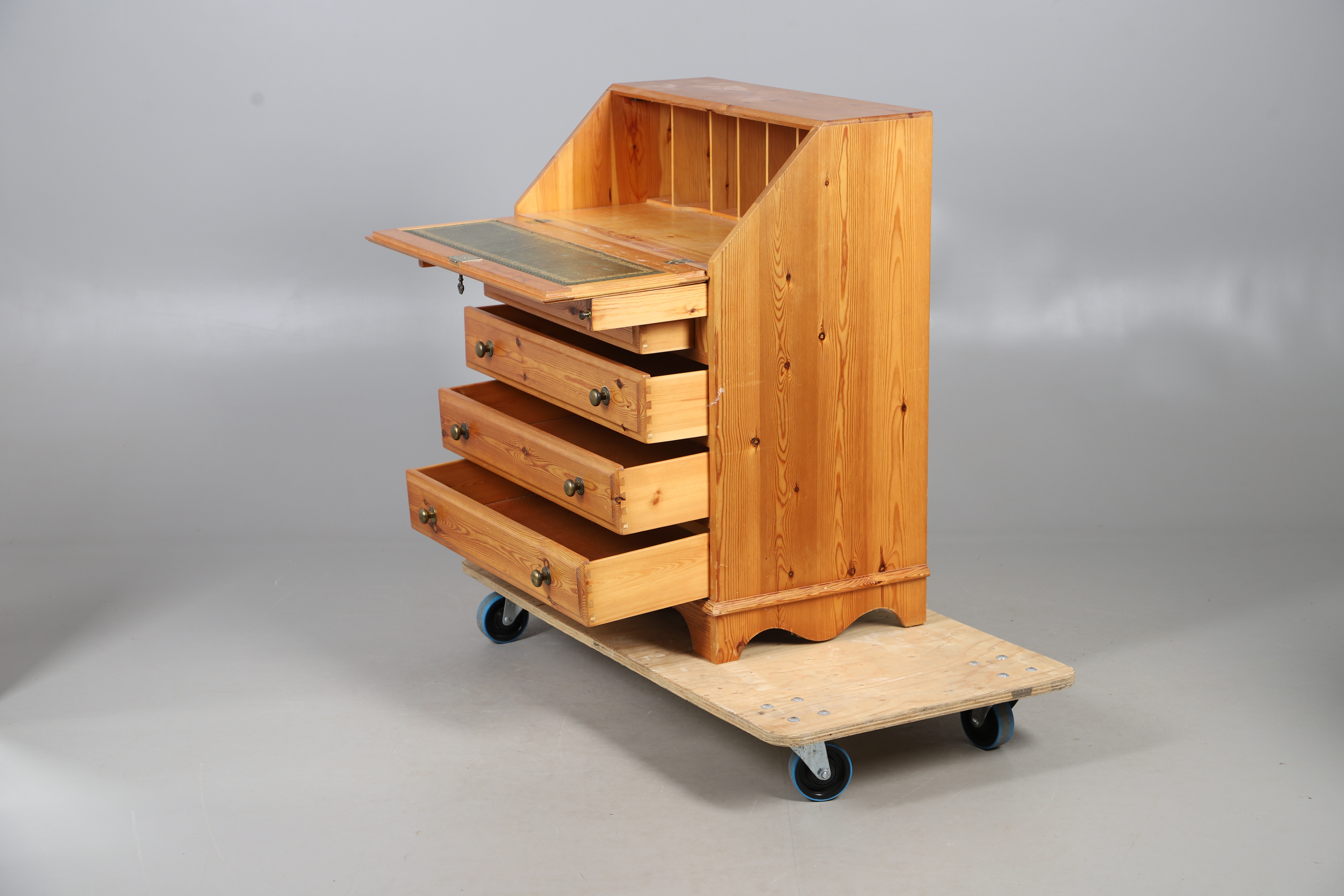 5001165. A MODERN PINE BUREAU, CORNER CUPBOARD AND DRESSING TABLE MIRROR.
