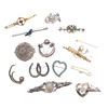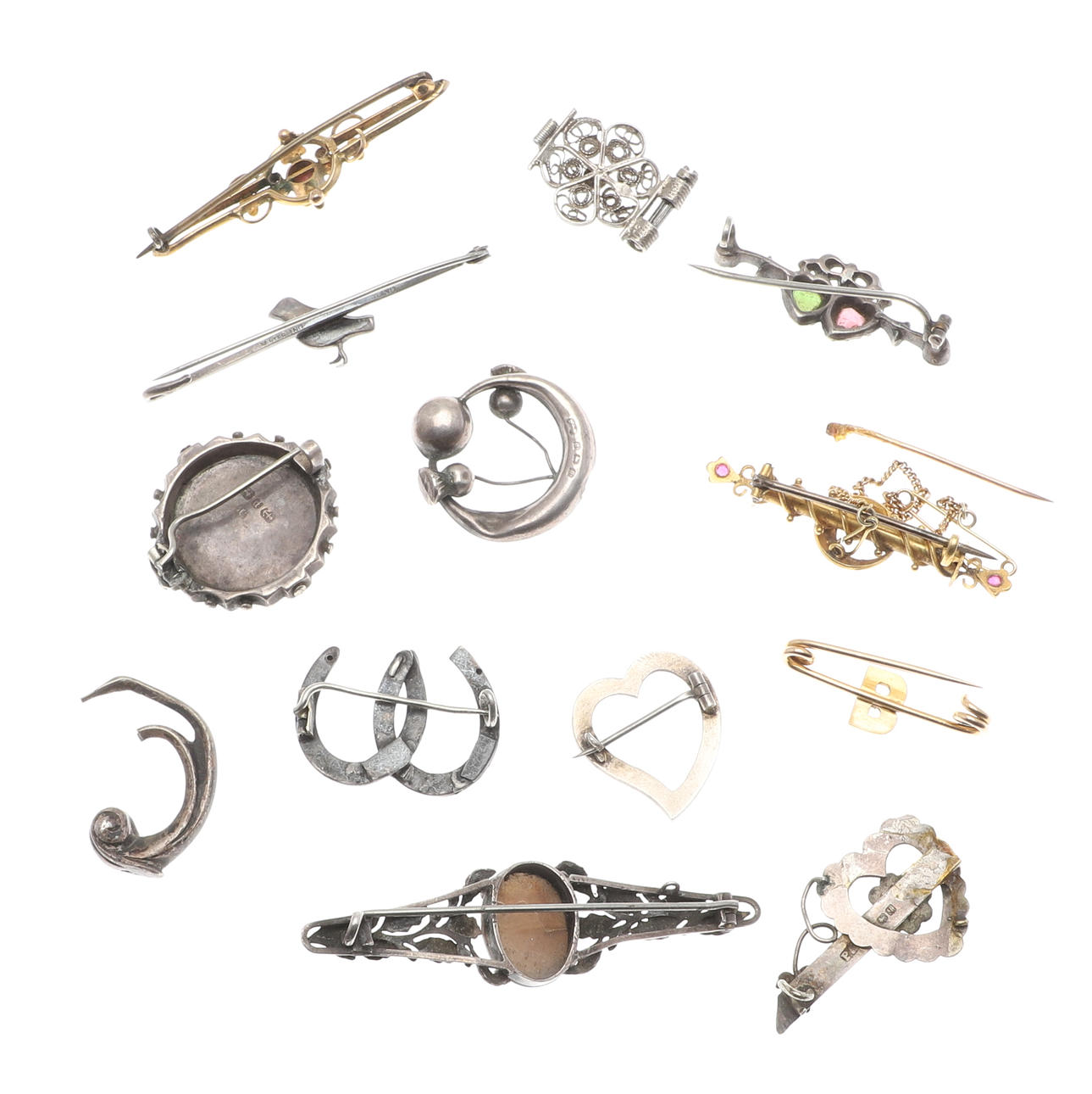 A Victorian gold bar brooch with ruby terminals, tests as 15ct, an initial B brooch also 15ct, total 5.2g, together with a 9ct gold bar brooch and silver items etc.