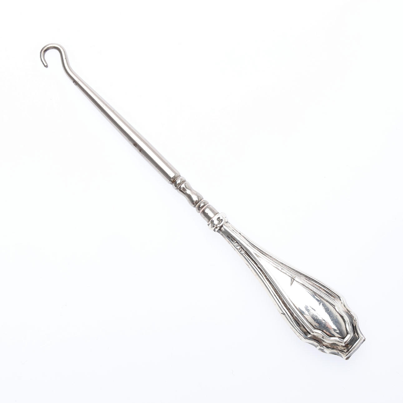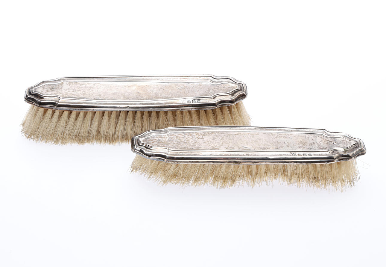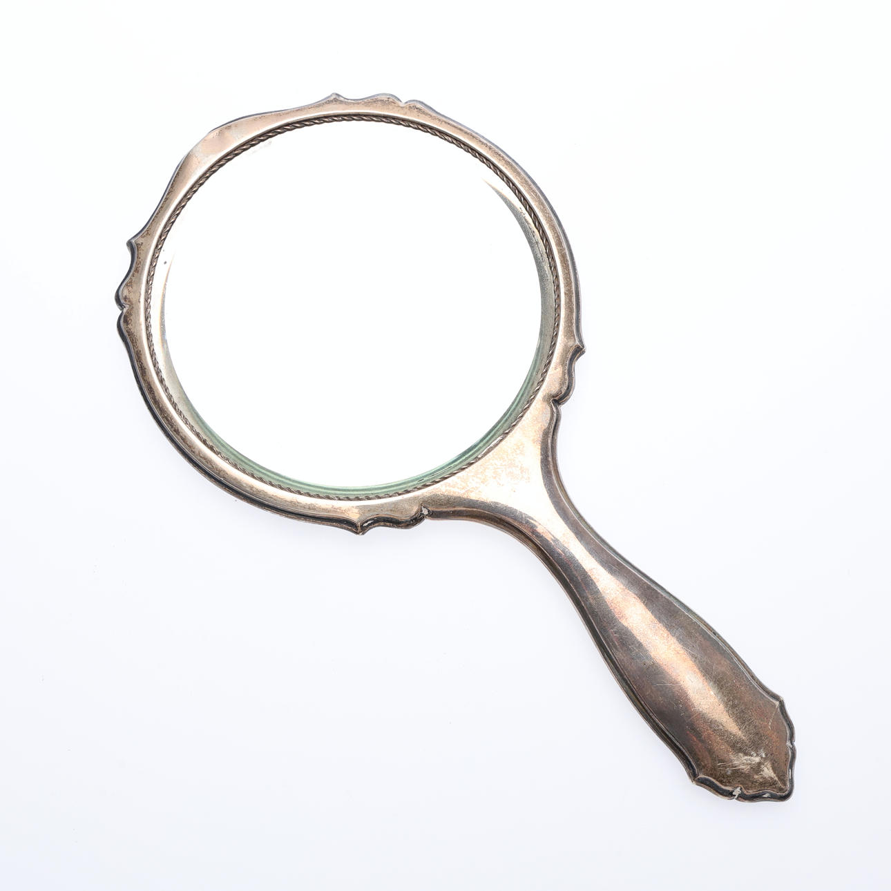 5001308. 2 SILVER MOUNTED HAND MIRRORS, 2 BRUSHES, AND A BUTTON HOOK. (5).