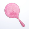 George V silver and pink guilloche enamel hand mirror, by Albert Carter, Birmingham, 1922, L.25.5cm; another silver hand mirror, pair of silver mounted clothes brushes, and a silver handled button hook. (5).