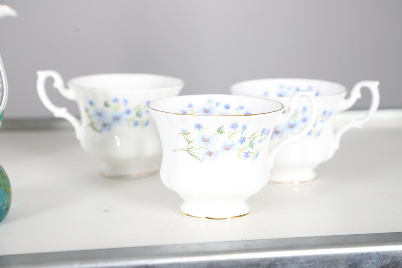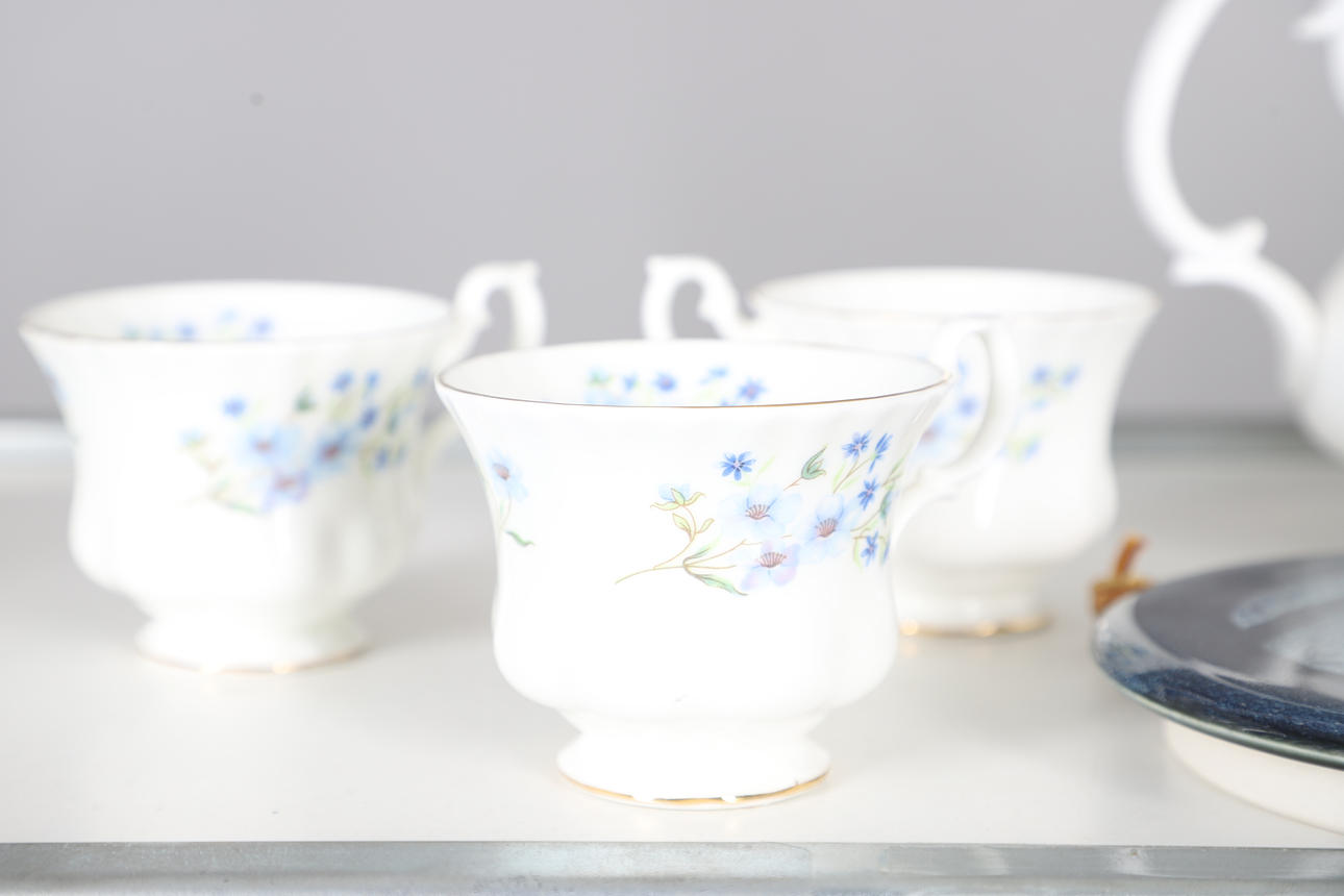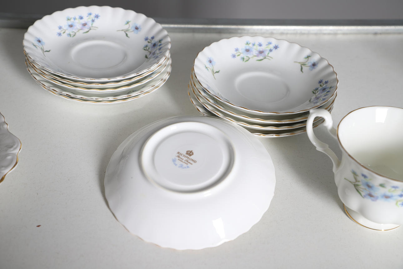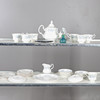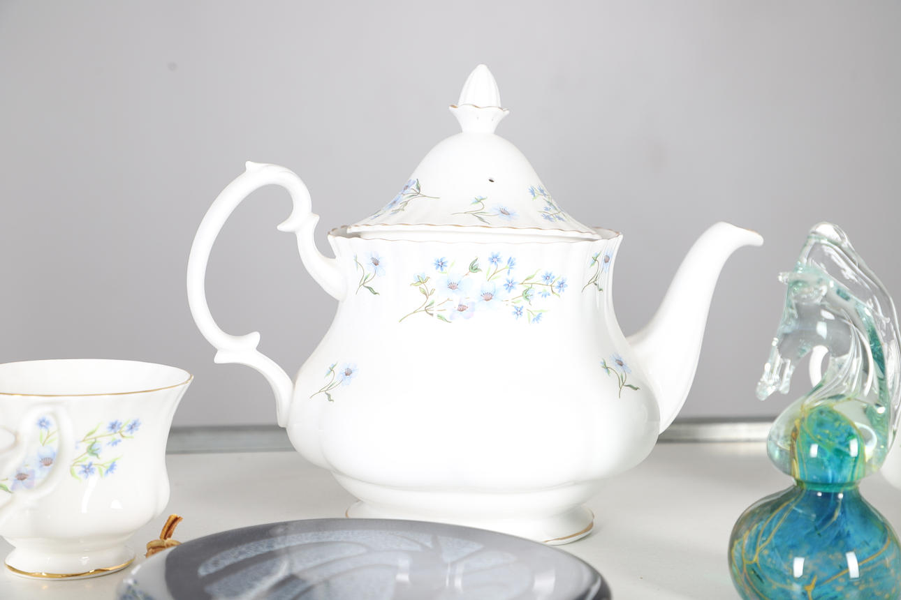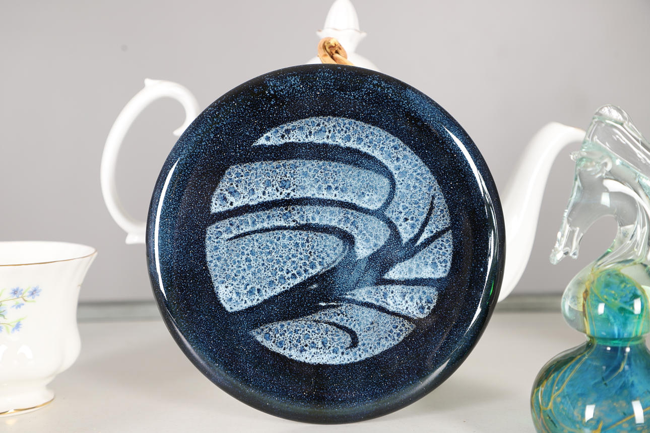 comprising of a teapot, 22cm high, milk jug, seven cups, ten saucers, eleven tea plates, one sandwich plate, 25cm diameter; together with a Creek Clayworks hanging plaque, and a glass seahorse ornament.