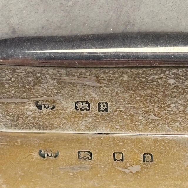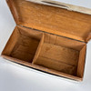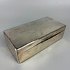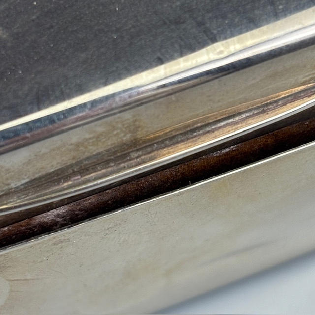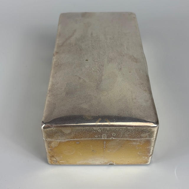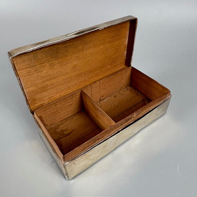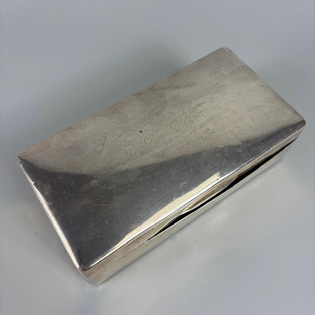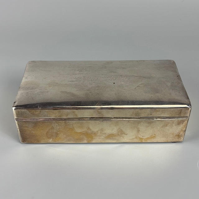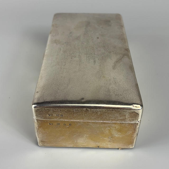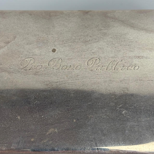 English London hallmarked silver cigarette box with wood liner engraved to top 'Pro Bono Publico' (in public service), approximately 18 x 9 x 5.5cm, 485g total.
