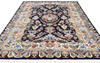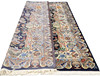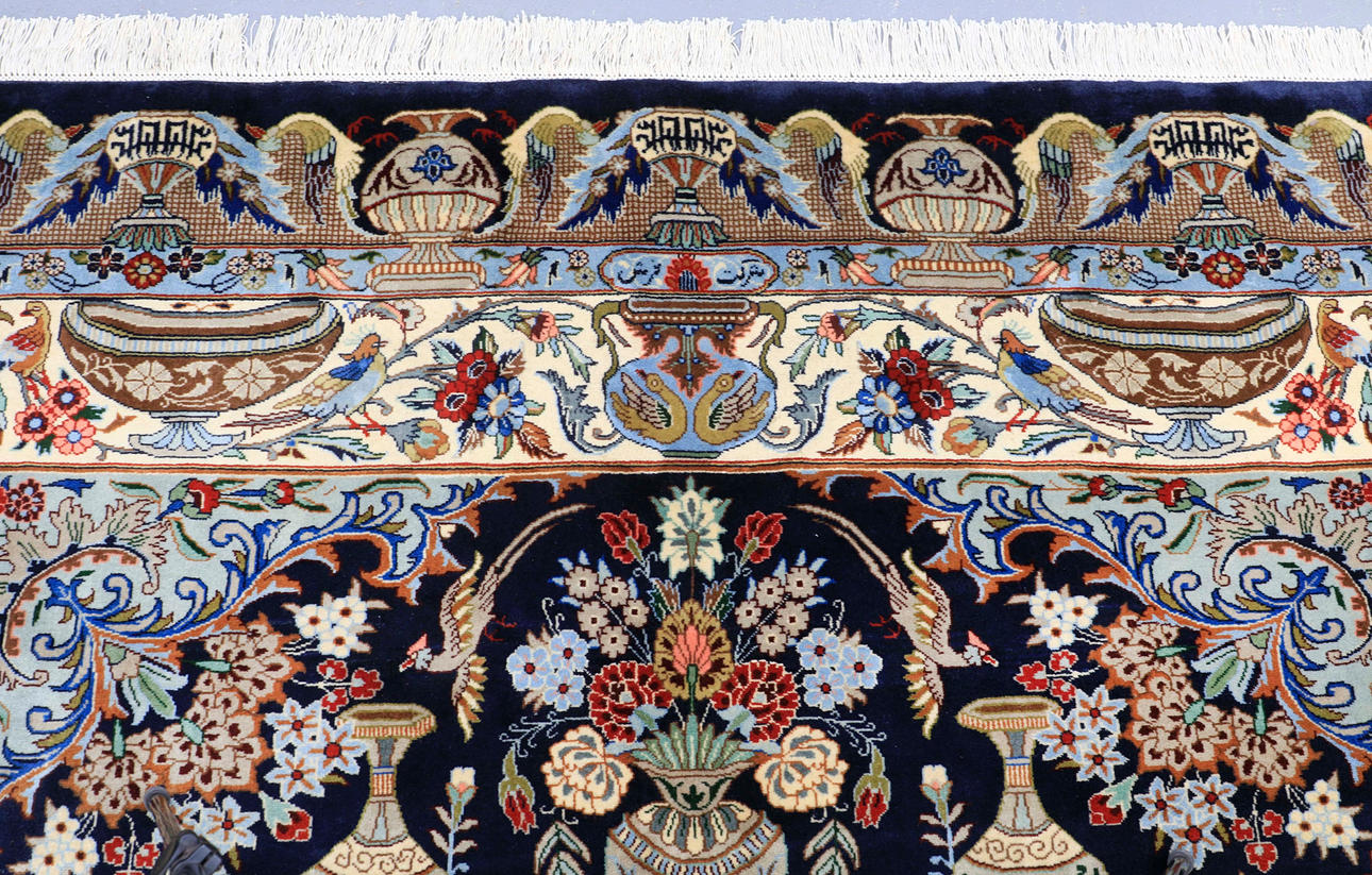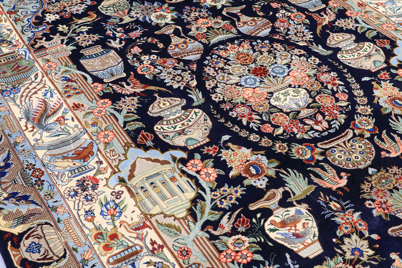 Figural Cashmar with dark bottom color and a central vase motif with floral decor, surrounded by additional architectural and figural elements in beige, blue, green and red tones. The main border has a light bottom colour with similar decoration and is surrounded by an outer border with a dark bottom colour. The forelock is made of wool and the warp is of cotton.