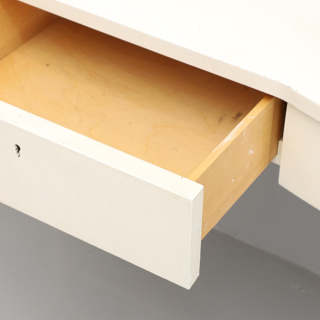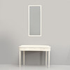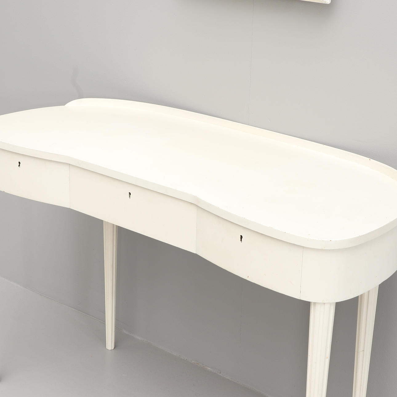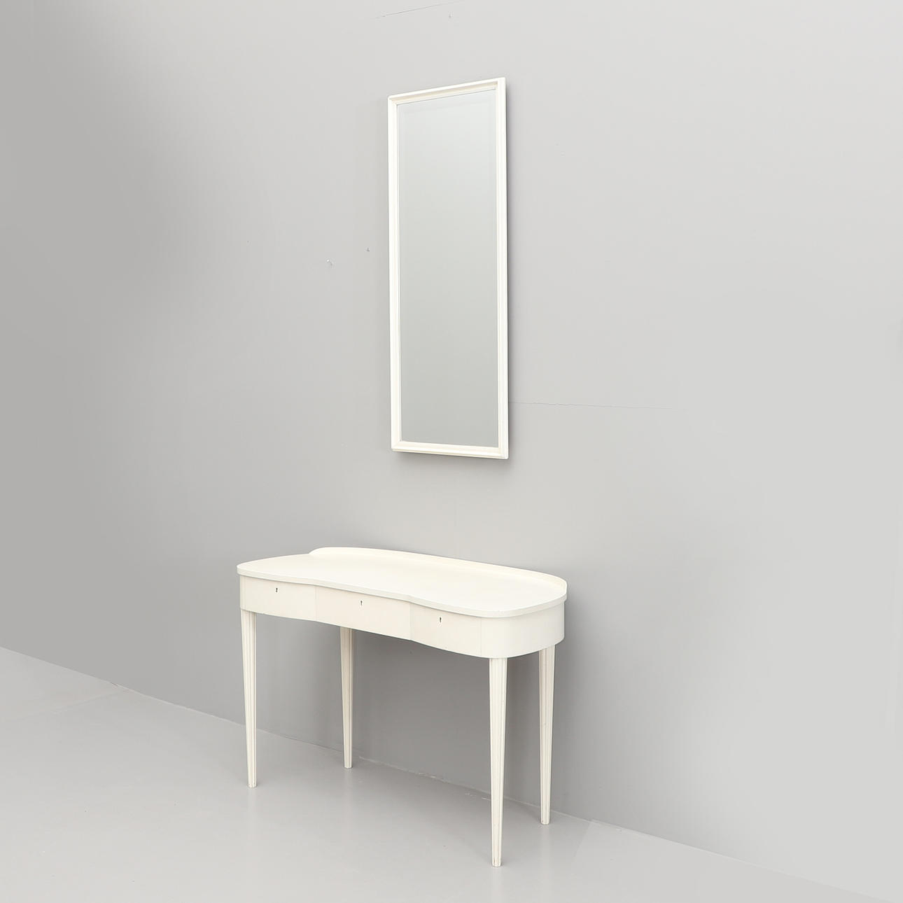 White painted. Table with kidney-shaped disc, three drawers, good-roned legs. Width 110, depth 47, height 73 cm. Rectangular mirror height 114, width 47 cm.