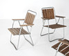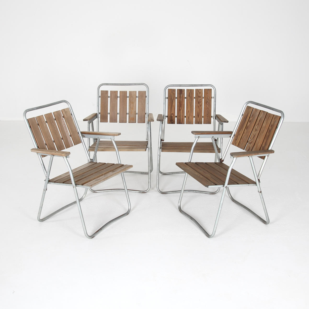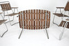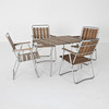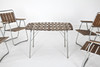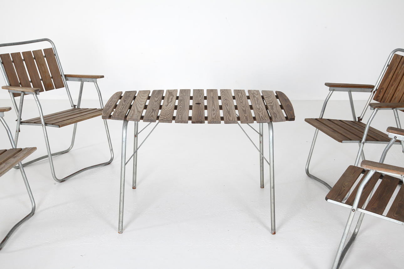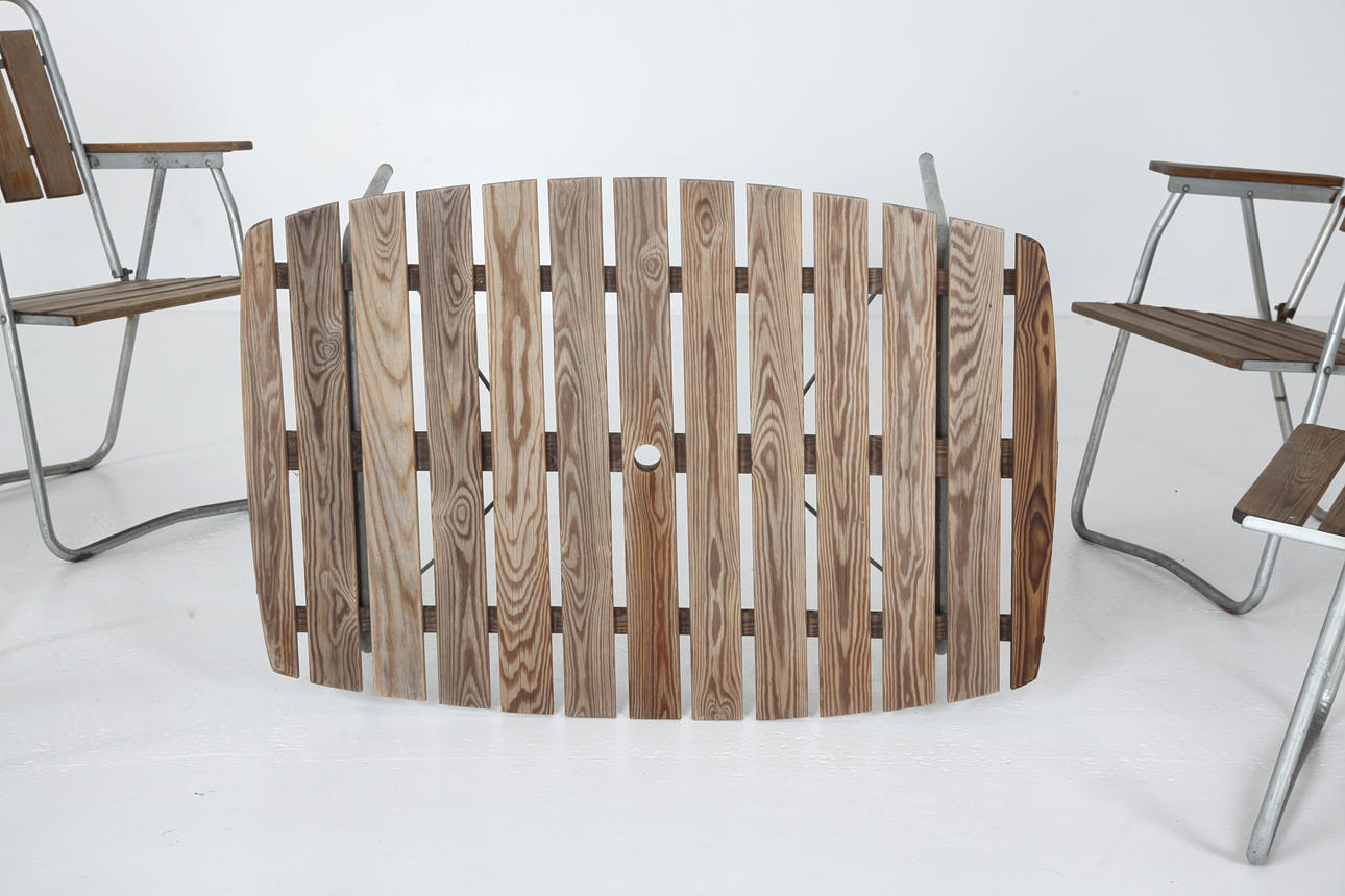 Table and chairs, folding. Galvanized steel, oiled pine ribs. Sweden circa 1960.