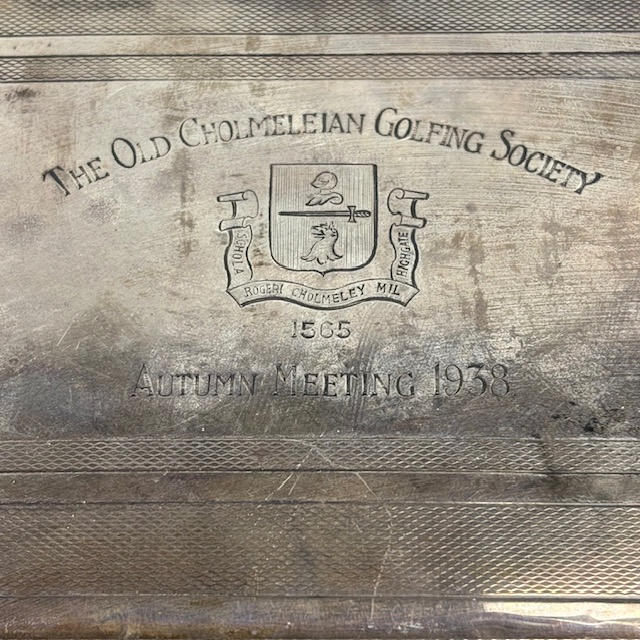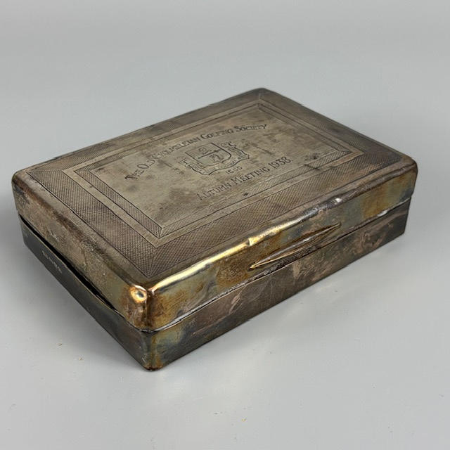 English fully hallmarked silver cigarette box, the top engraved 'The Old Cholmeleian Golfing Society, Autumn Meeting 1938', approximately 12 x 9 x 3cm and a total of 311g.