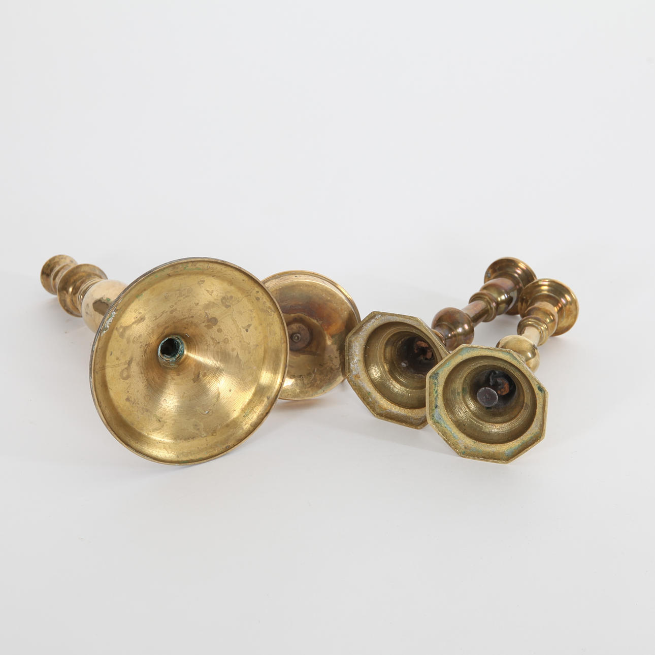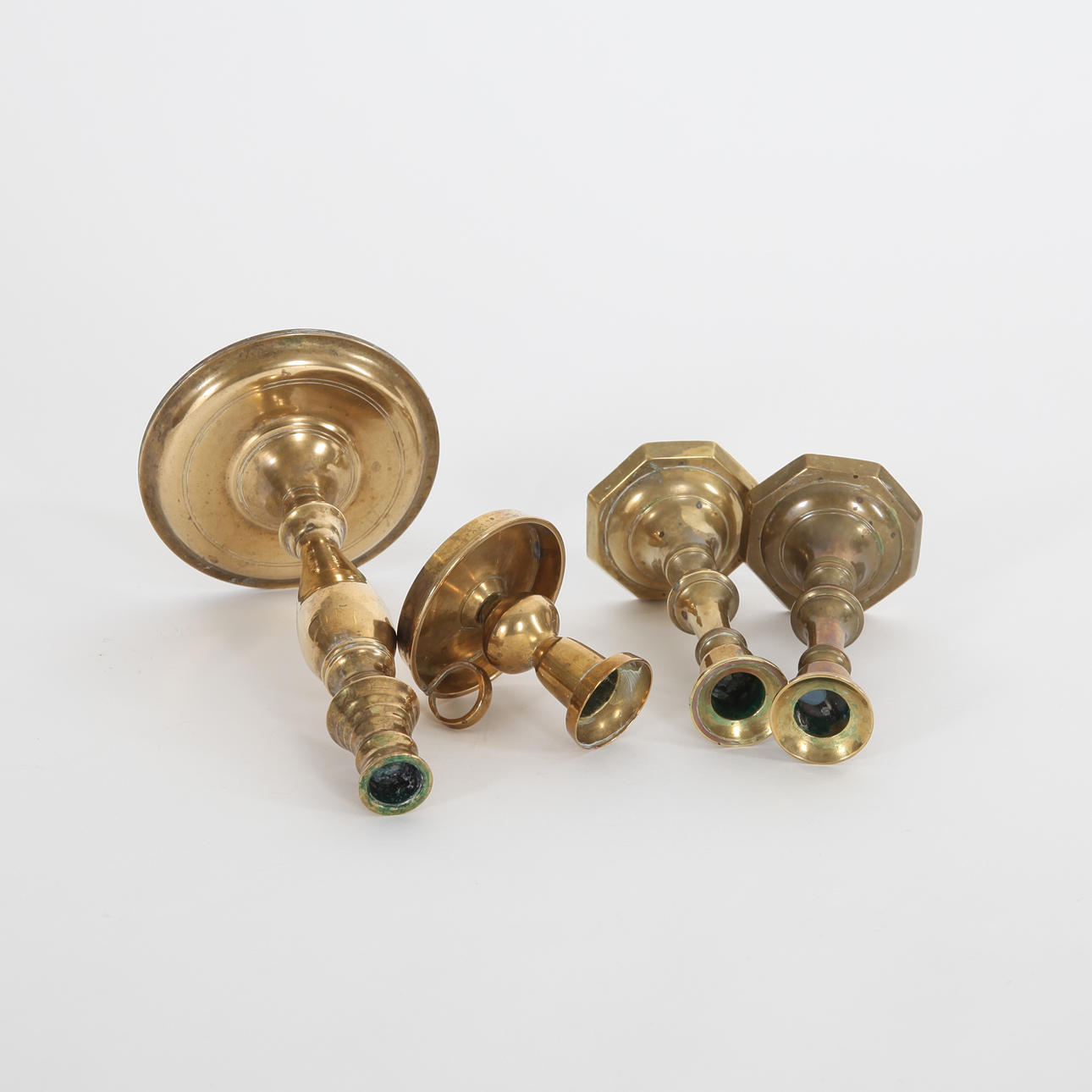 1 pair of brass candlesticks, height 15 cm 1 brass candlestick, 19th/20th century, height 23 cm 1 chamberstick, brass, height 8 cm.