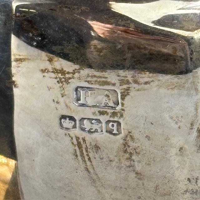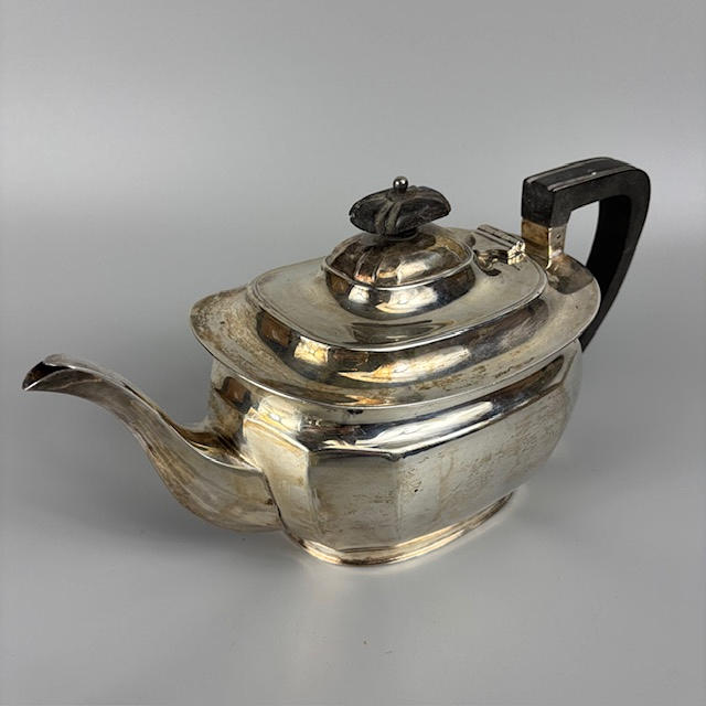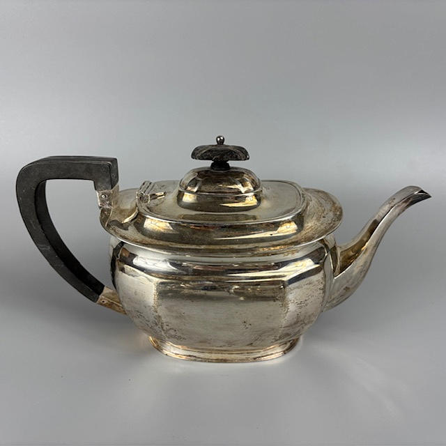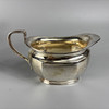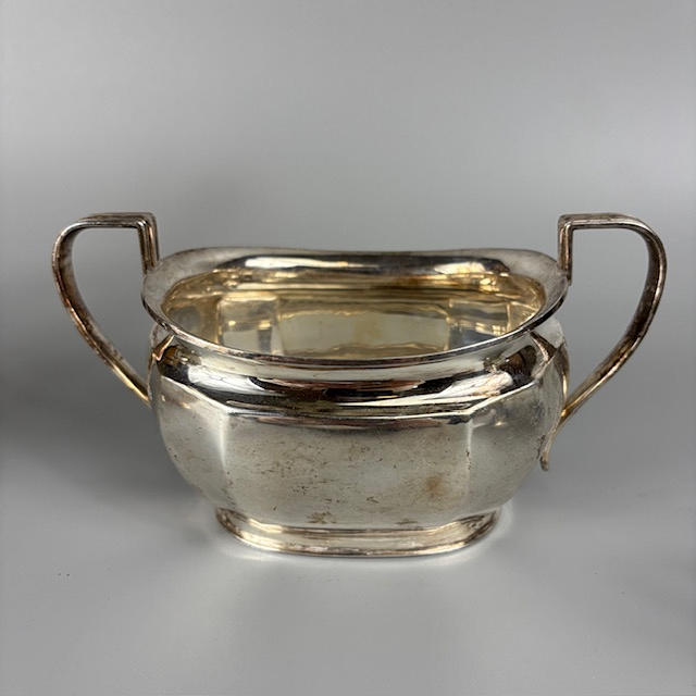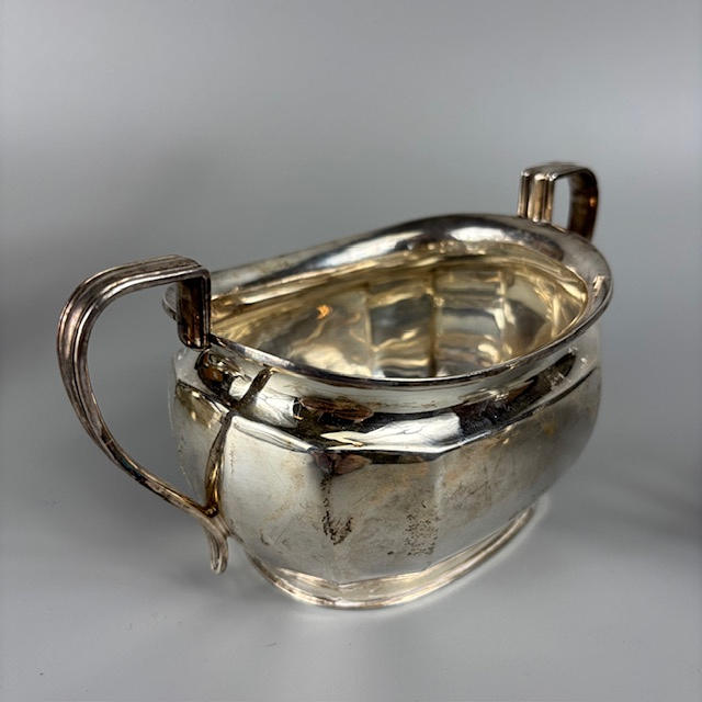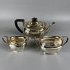 Fully English hallmarked tea set Sheffield 1932 and 1933, teapot approximately 13cm tall, 616g, sugar basin 7cm tall, 255g, milk jug 6cm tall 175g.