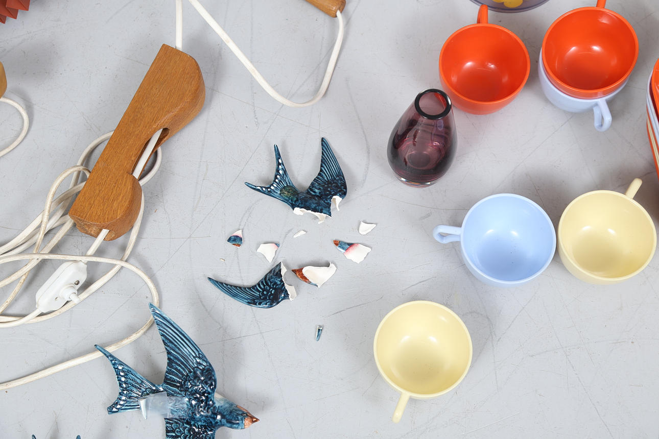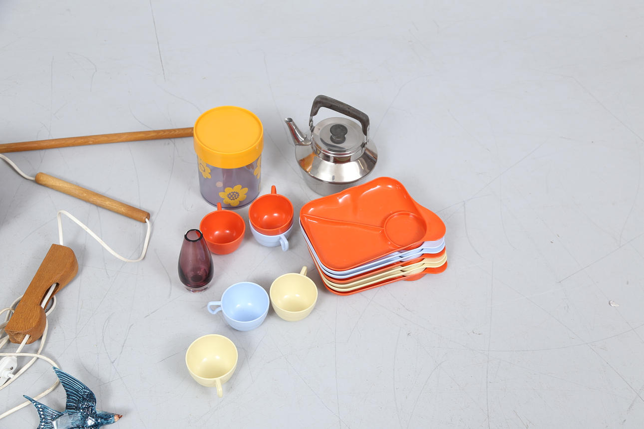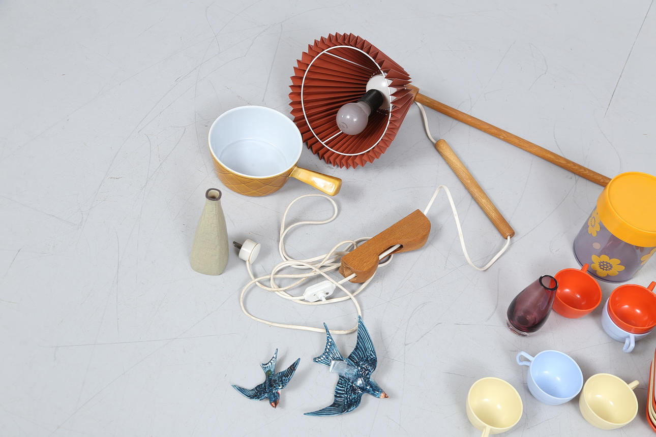 Trays with mugs, 7+6, Kristallo, Skaraplast. Kaffeburk, Denmark. Coffee pot, Sigvar Bernadotte, etc.