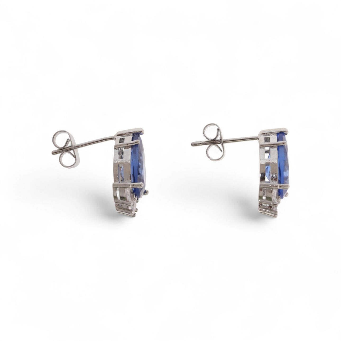 Silvery metal and blue and colourless zircons. 1 x 1.6 cm. 3.6 gr.