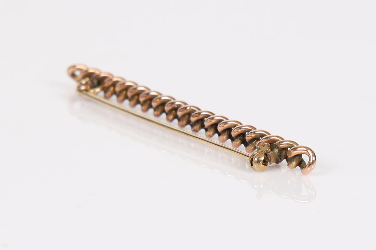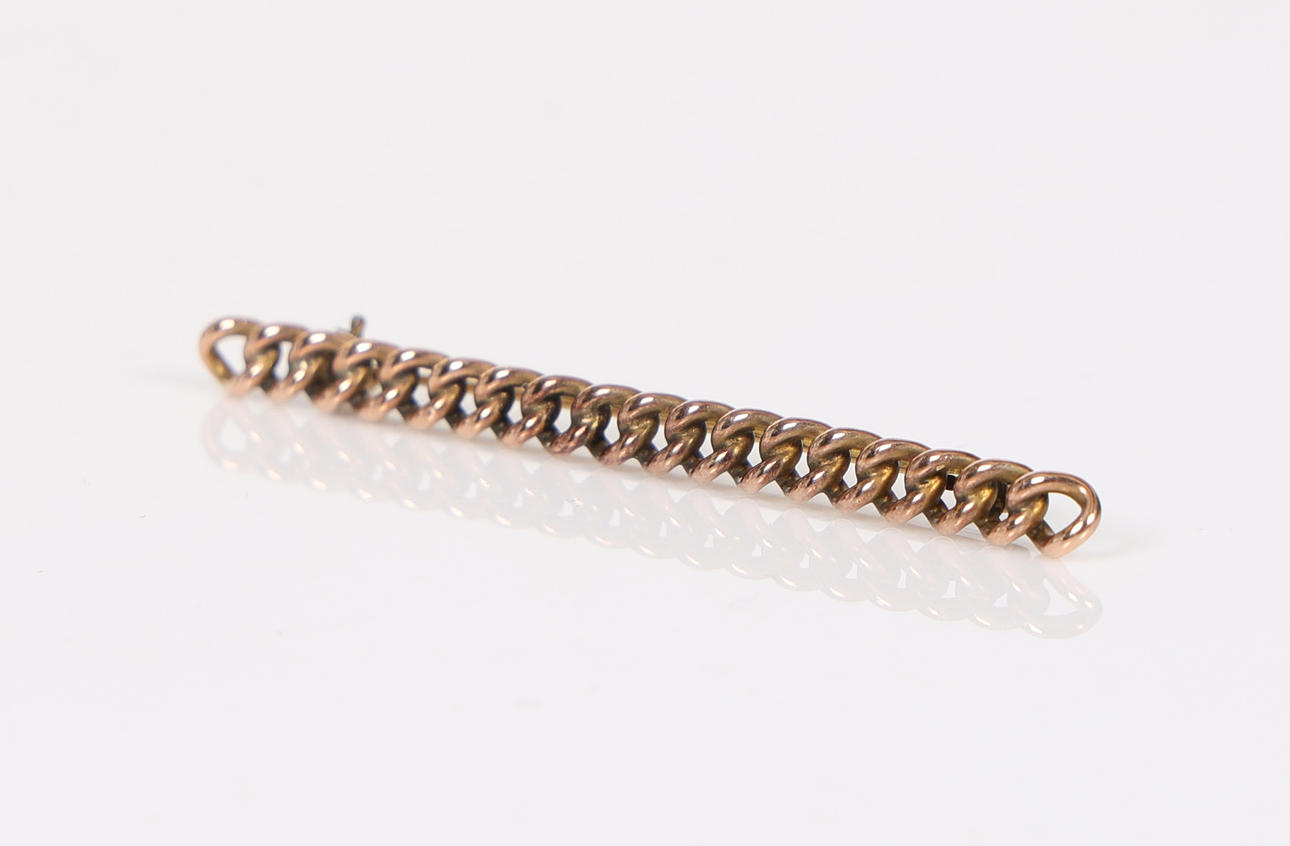 Unmarked but has tested as 9ct, 6.5cm long, weight 5.2 grams.