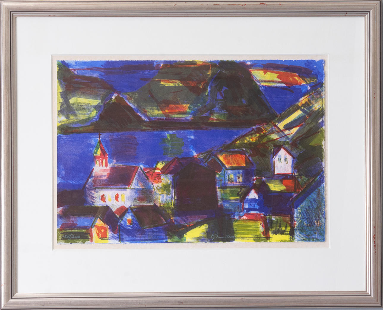 Framed lithograph of Faroese motif with houses and sea.