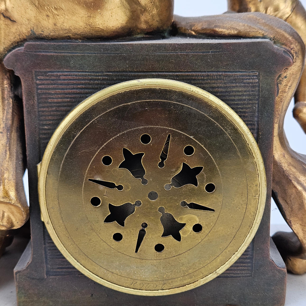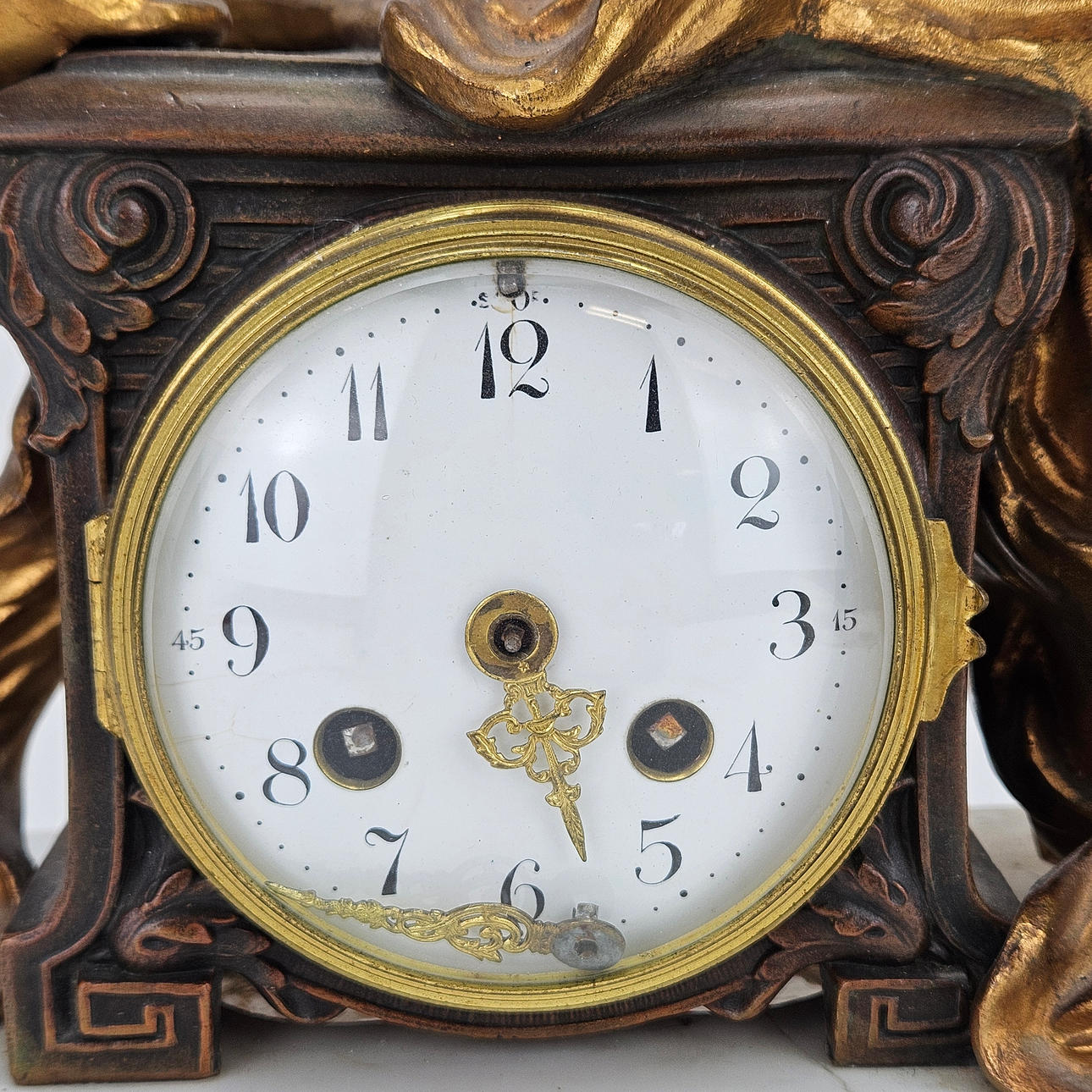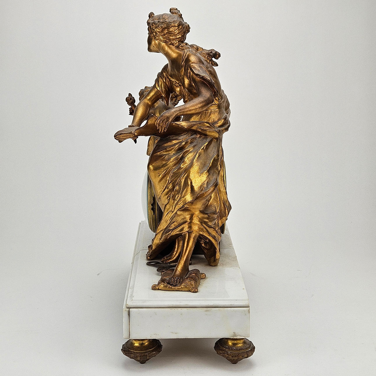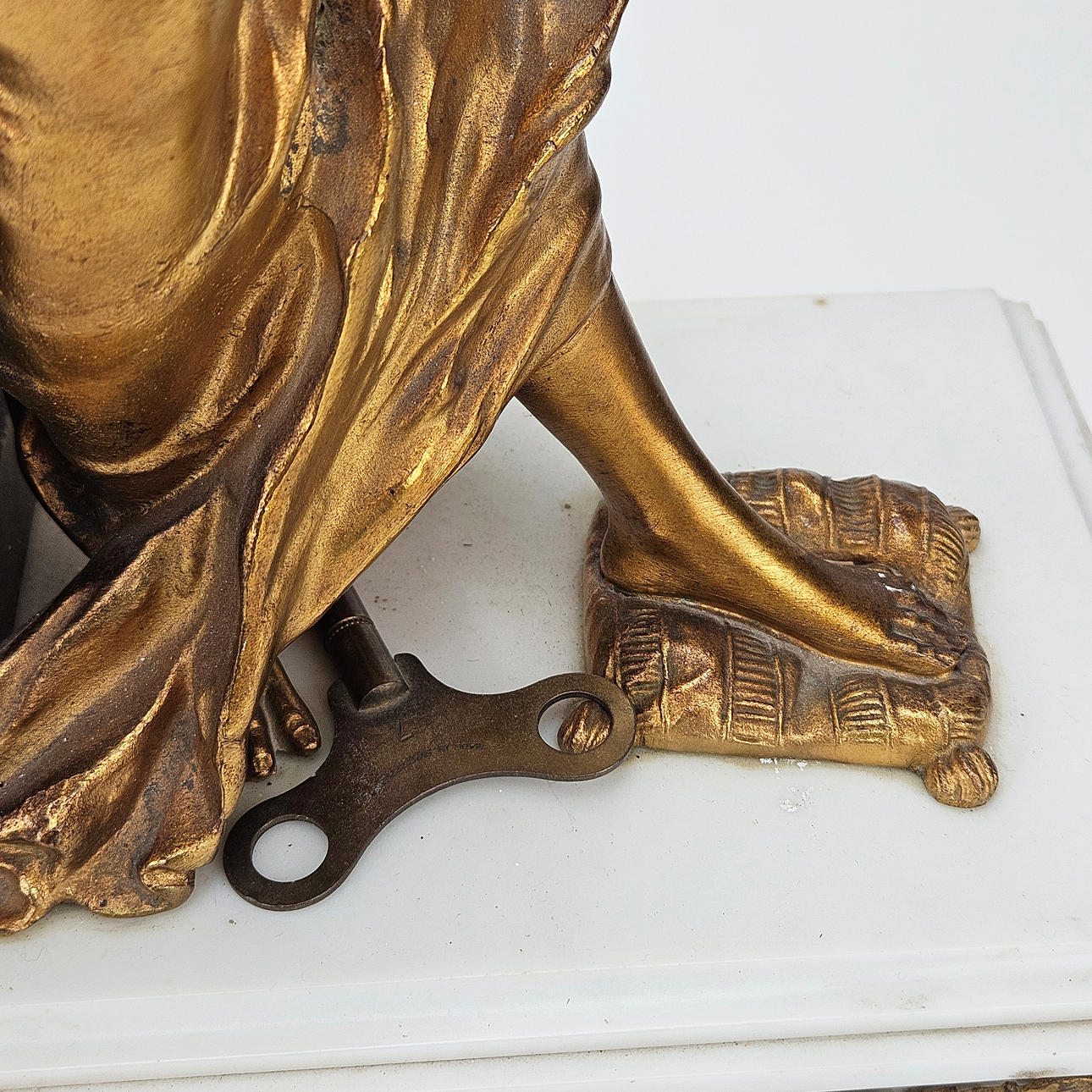 Plinth with damage, loose pointer, pendulum and key missing.
