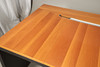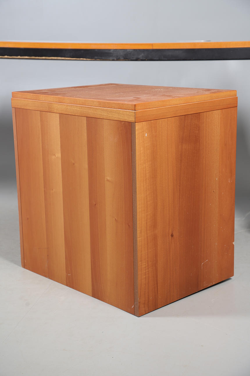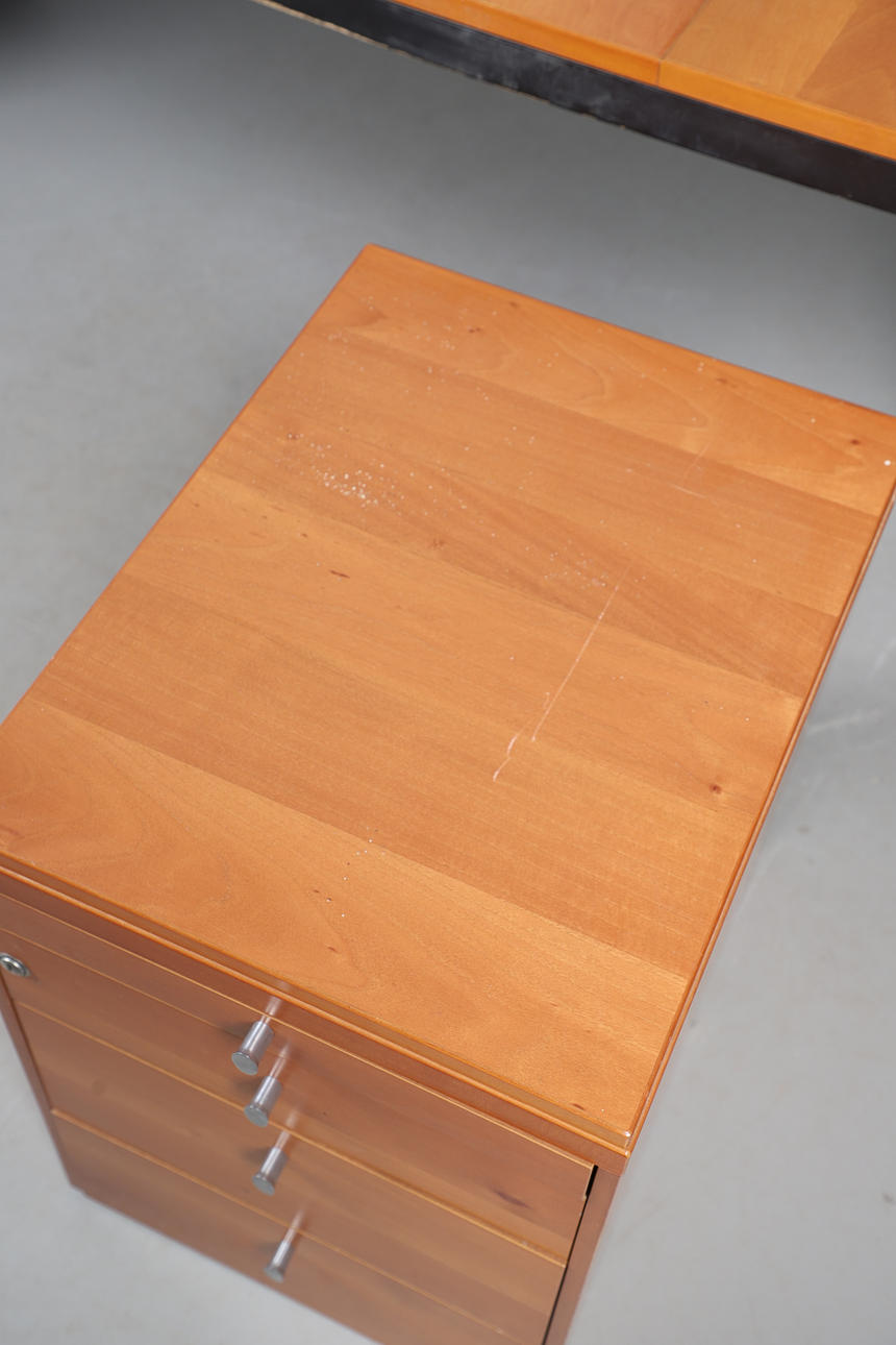A large cherrywood finish desk, comprising of a chest of four graduated drawers and a large table top. Size of table top, 200cm x 98cm. Approximate height of desk, 81cm. (6 parts).
