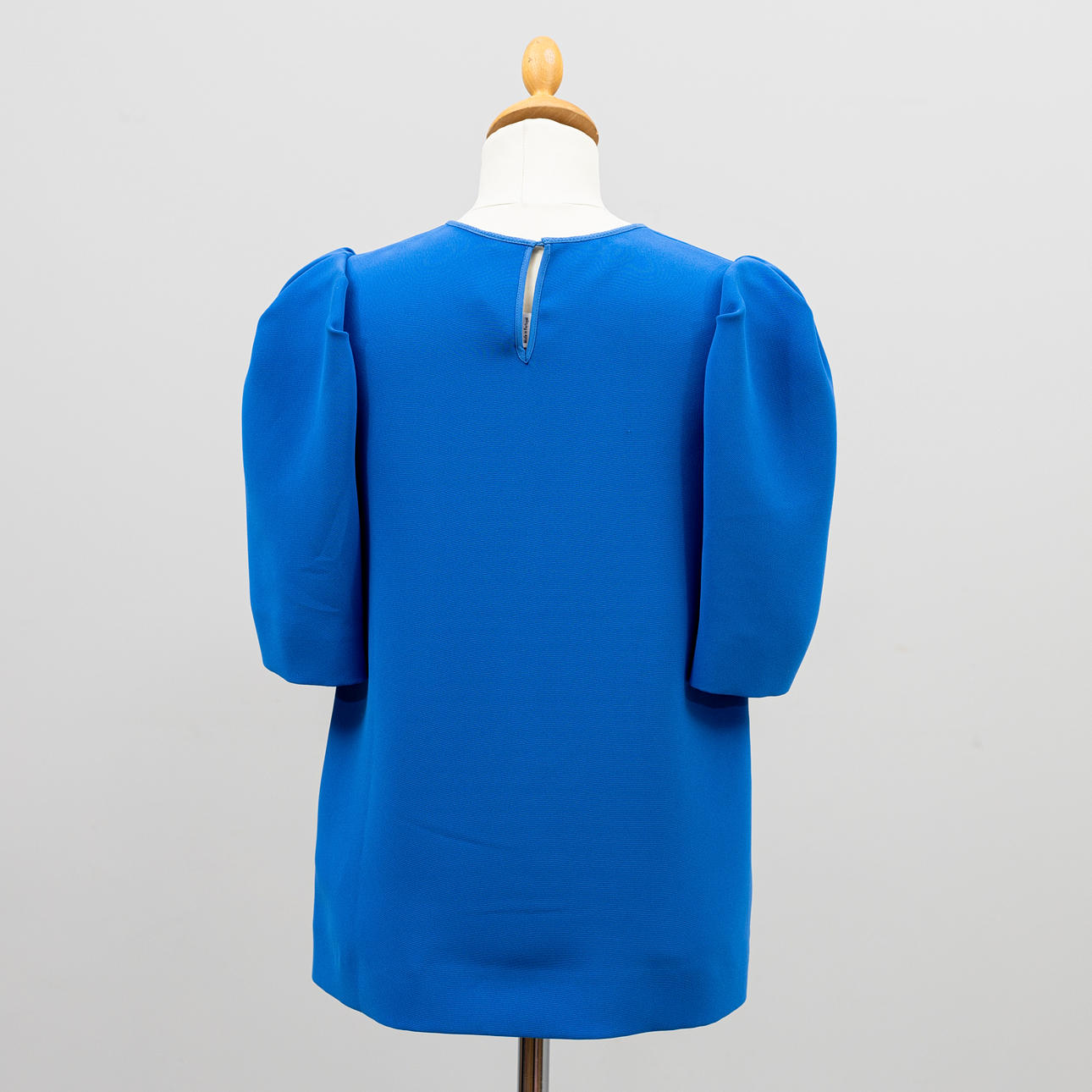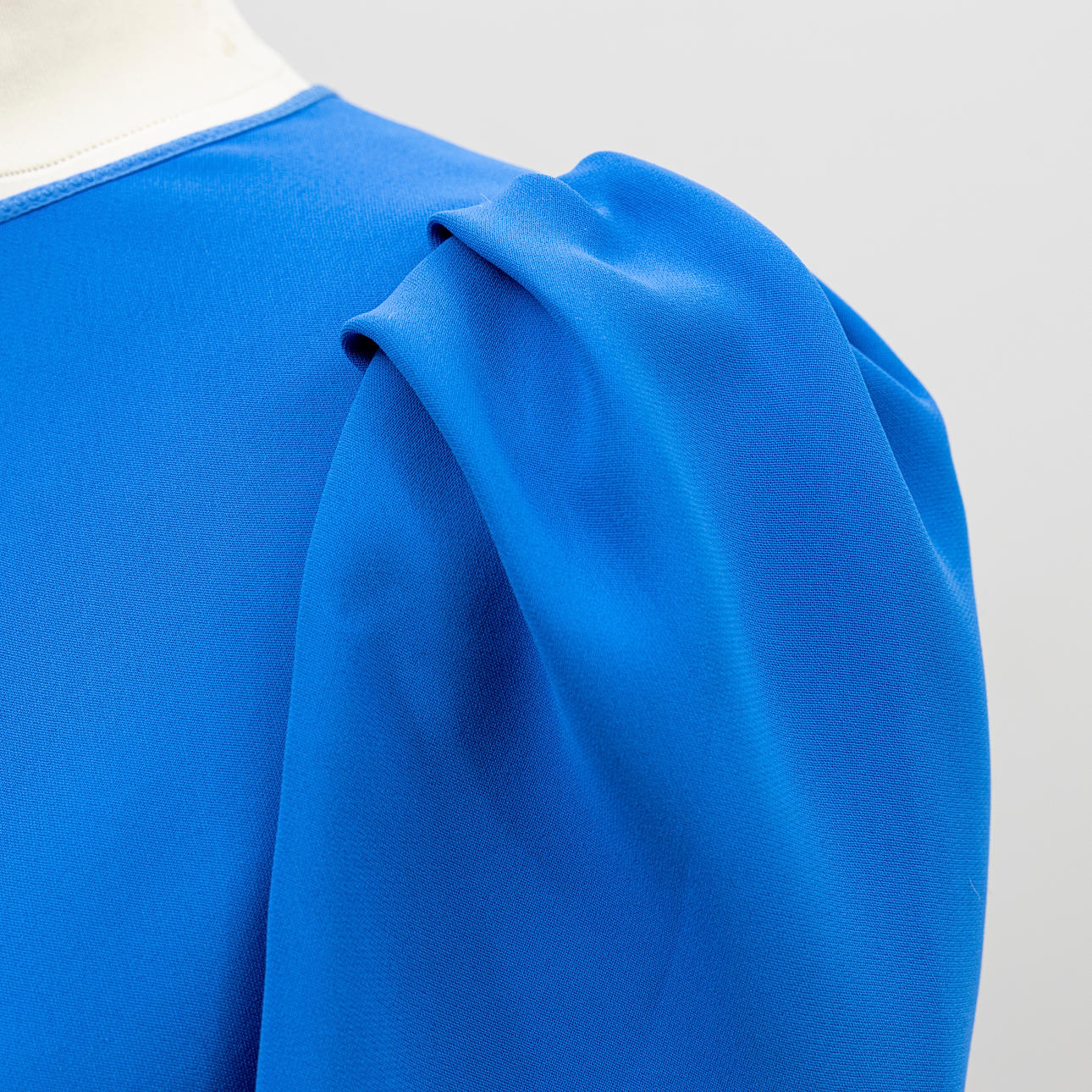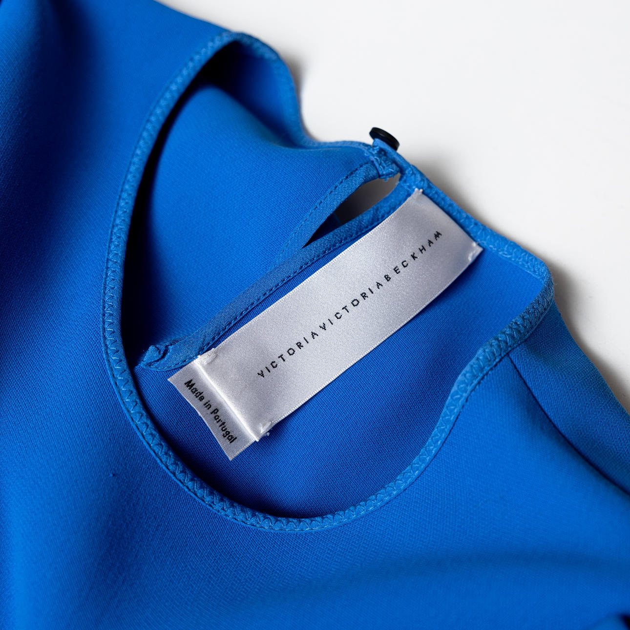 Cornflower blue with a short puff sleeve, a button at the neck. Tagged “VICTORIA VICTORIA BECKHAM made in portugal”. Enl marking size UK8.