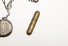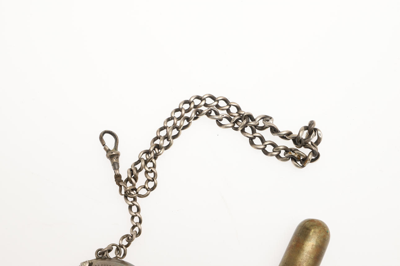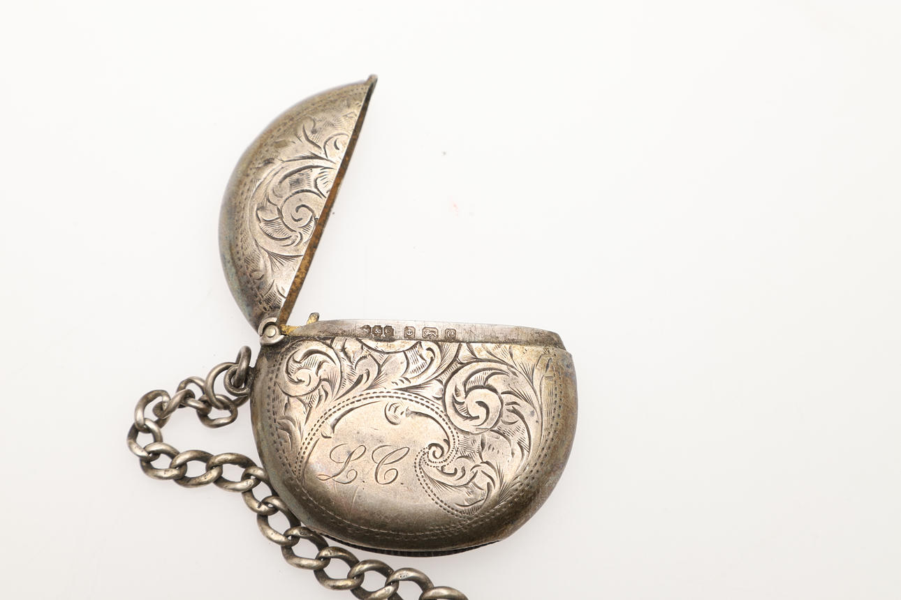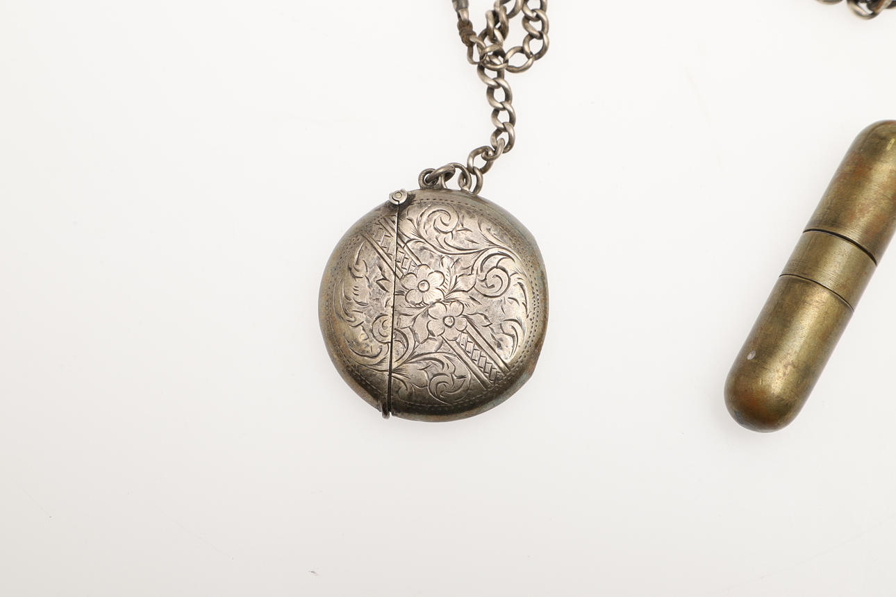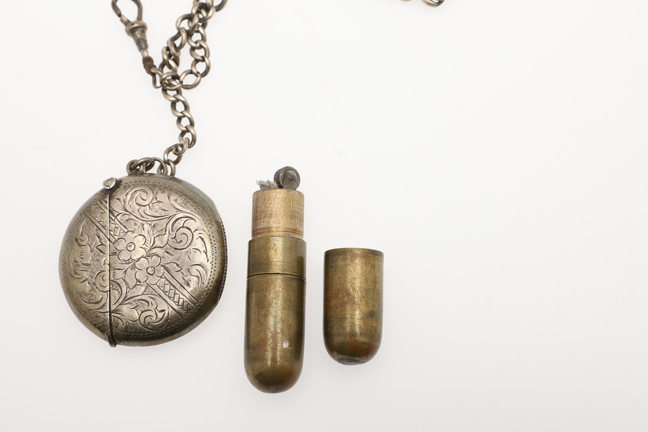 A circular silver vesta case with scrolling decoration and initial L.C. hallmarked for Birmingham 1904, on a silver chain, c. 55.03 g. With a brass lighter.