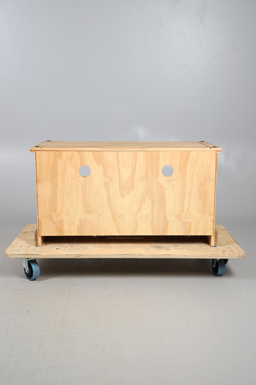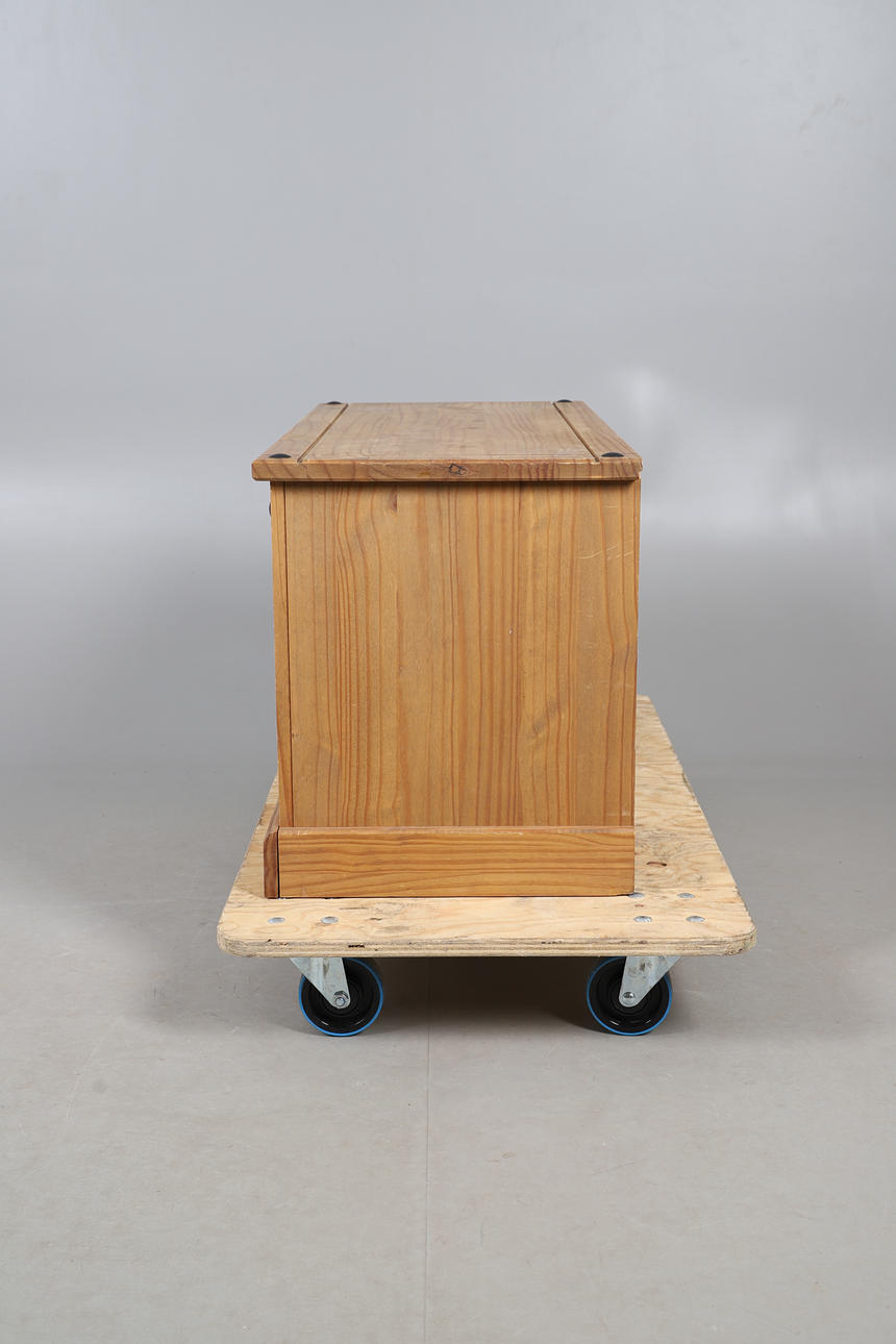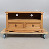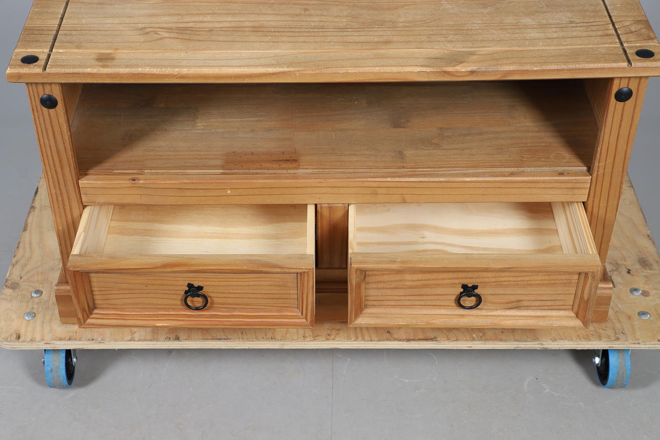 A modern pine TV stand, with two single drawers with drop down handles. 51cm (h) x 95cm (w) x 43cm (d).