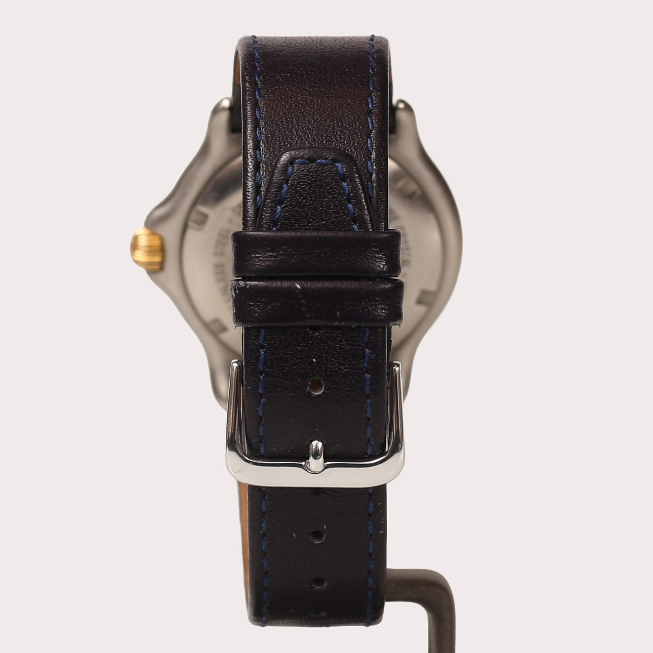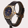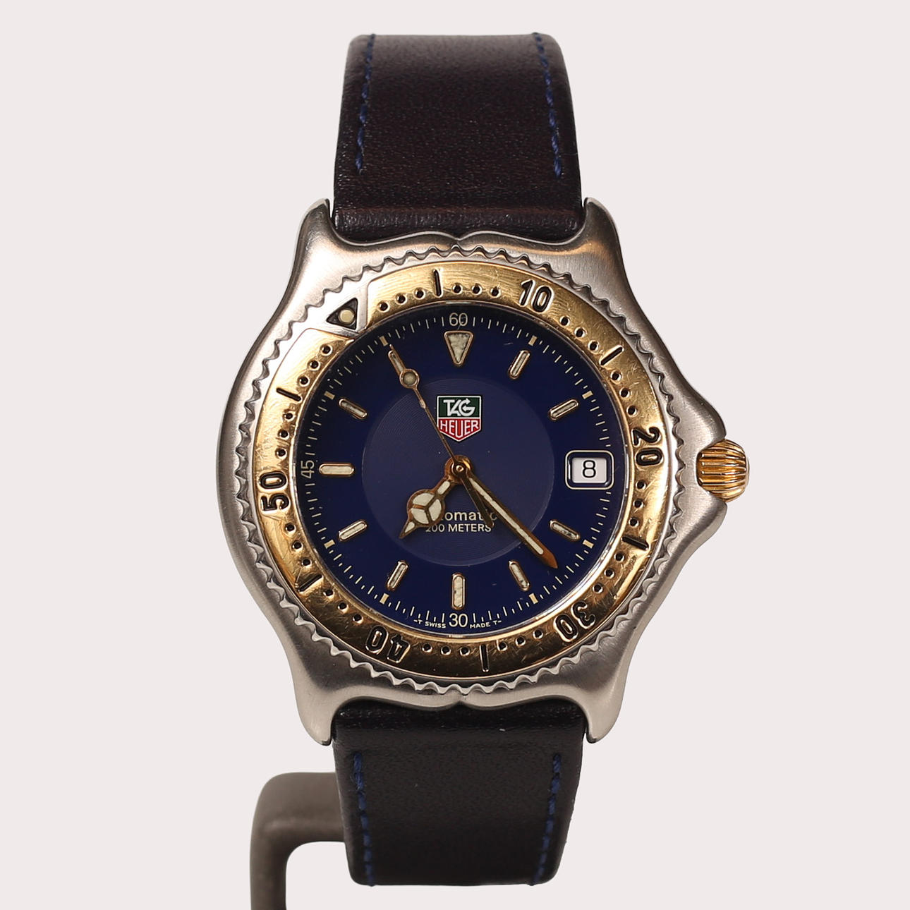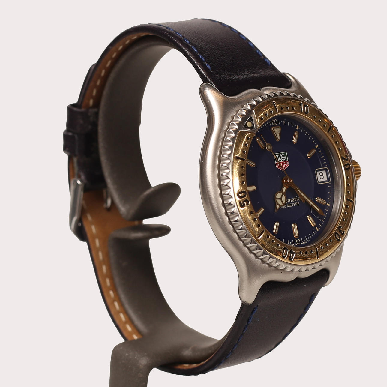 38 mm TAG Heuer, blue dial circa 1990-1995. Swivel ring and crown in gold, threaded mission crown, automatic clockwork, sapphire crystal. Blue leather bracelet.