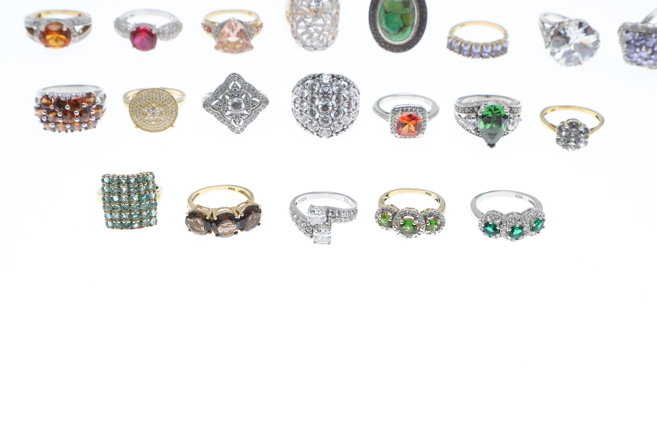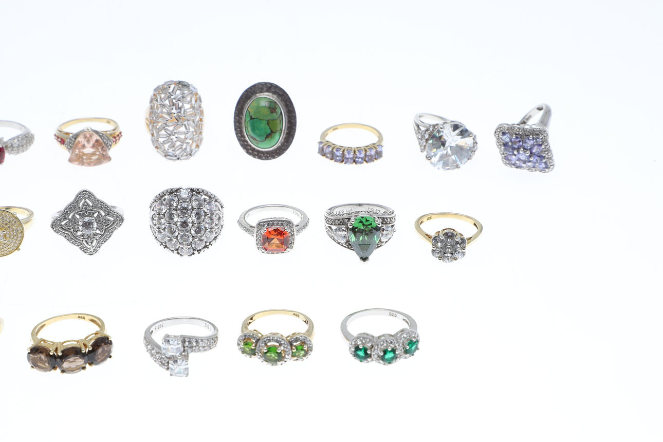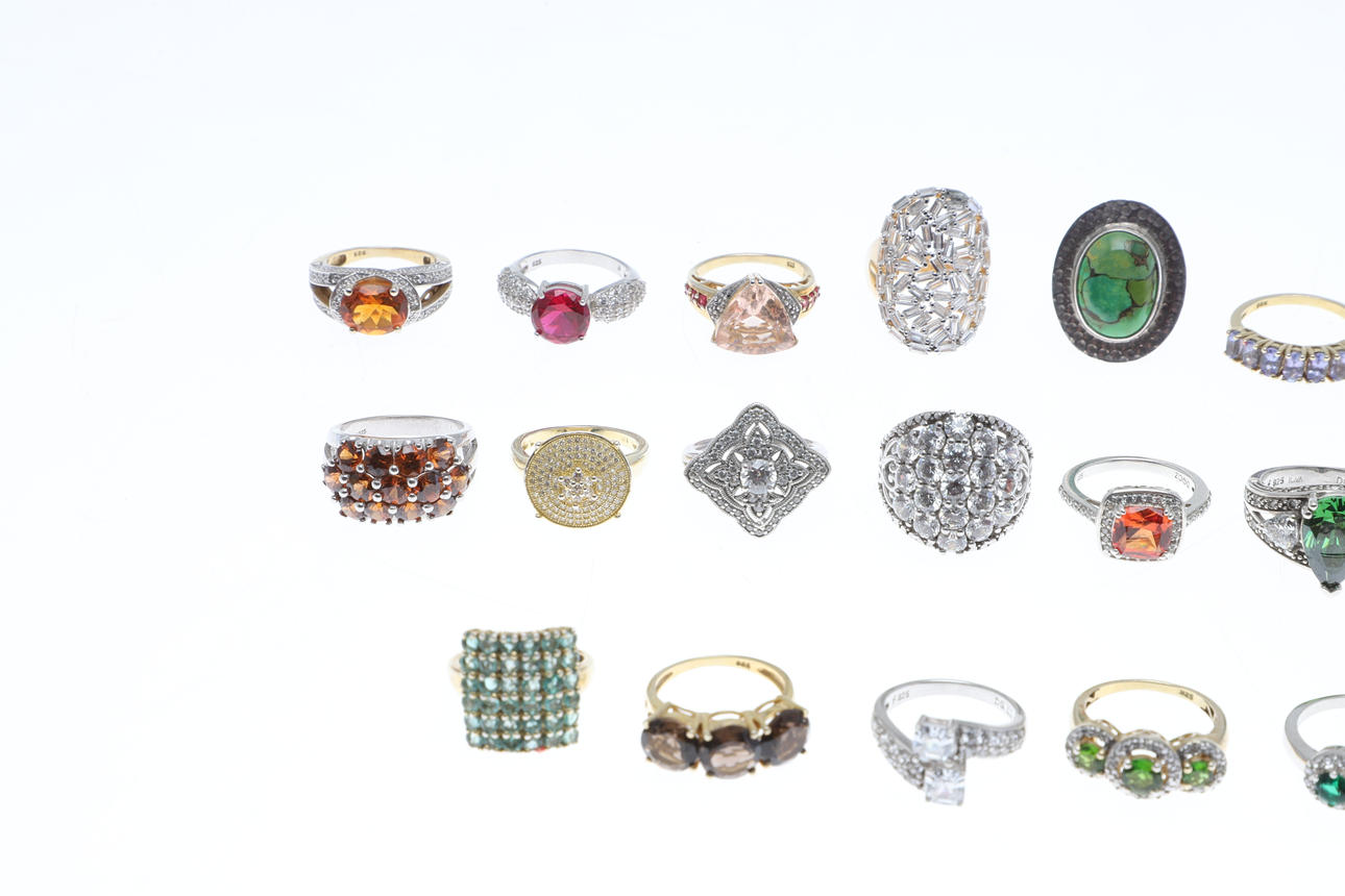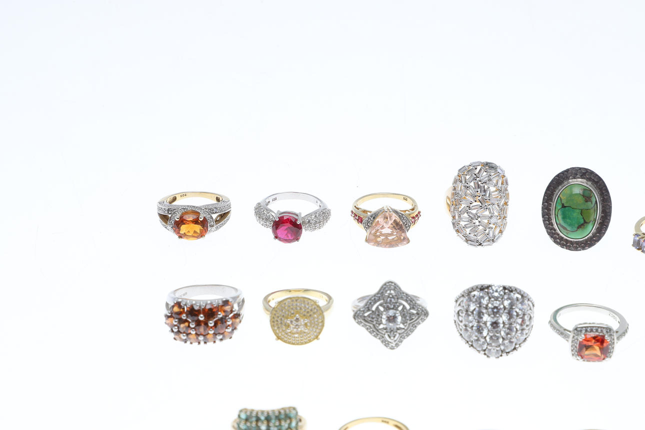 A QUANTITY OF SILVER AND GEM SET RINGS.