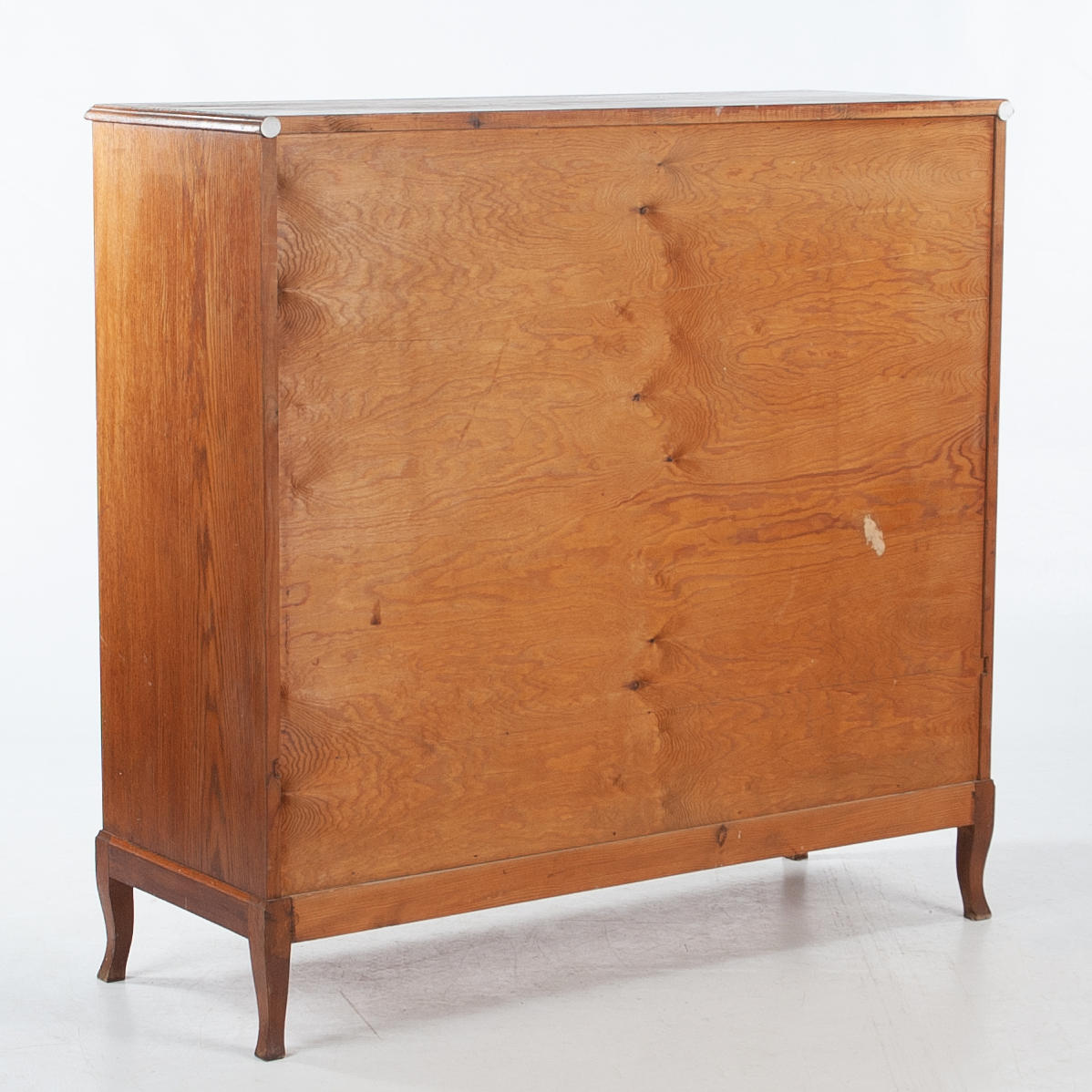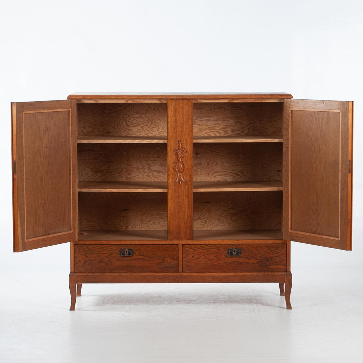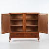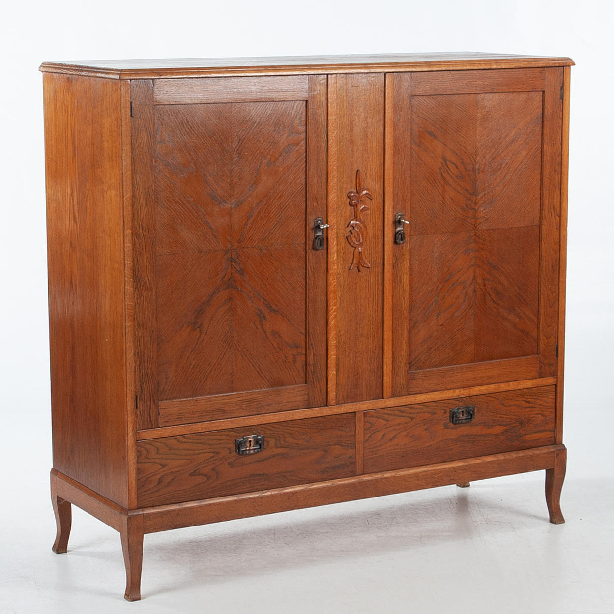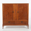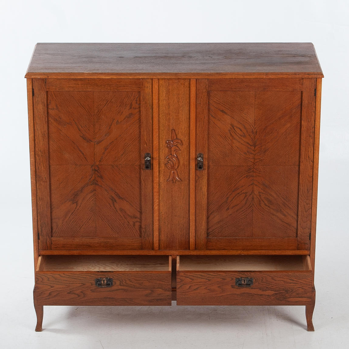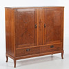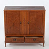 Rectangular cabinet with two doors with mirrored veneer laying in geometric pattern. Center post with stylized cut decor. Interior shelf decor. Below are two boxes. Tapered legs.