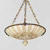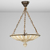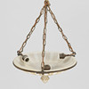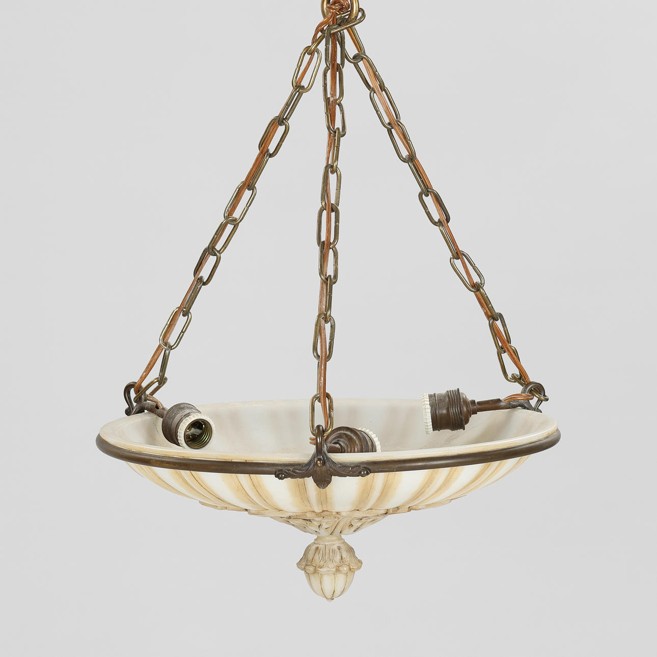 Large ceiling lamp (plafond) of alabaster with ornamentation in relief, suspension and details in brass, three light sources.