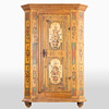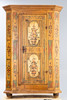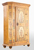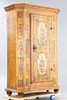 Softwood, painted in polychrome. Single-door body with slanted corner pilasters, with stylized floral decoration on beaded rings.. Baseboard and two-pass pediment creased. Natural-colored background. A large vase motif on each door front. HxWxD: 188 x 125 x 60 cm.