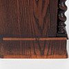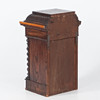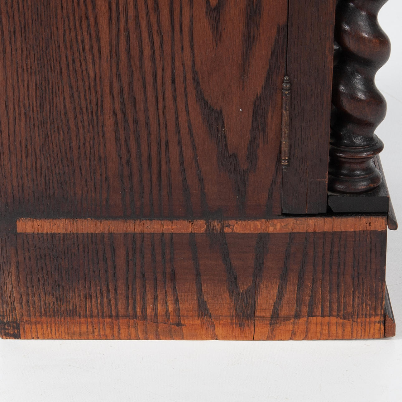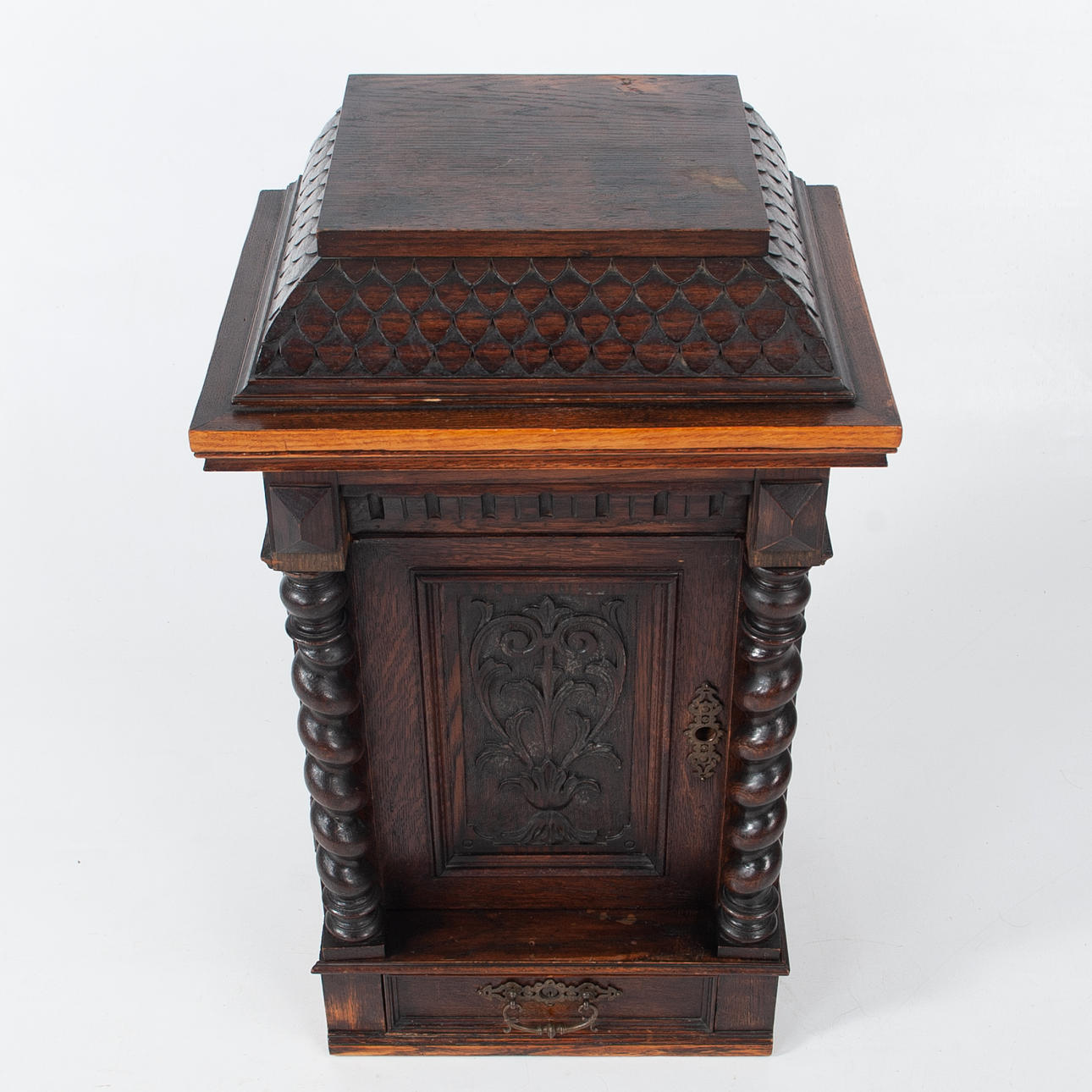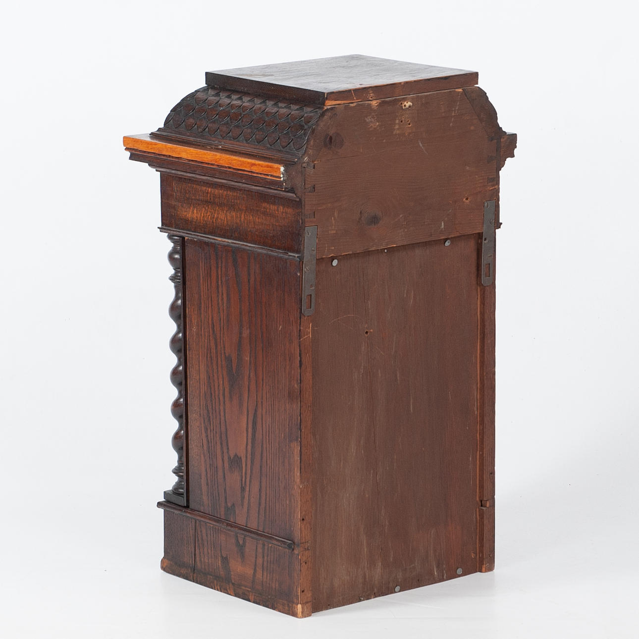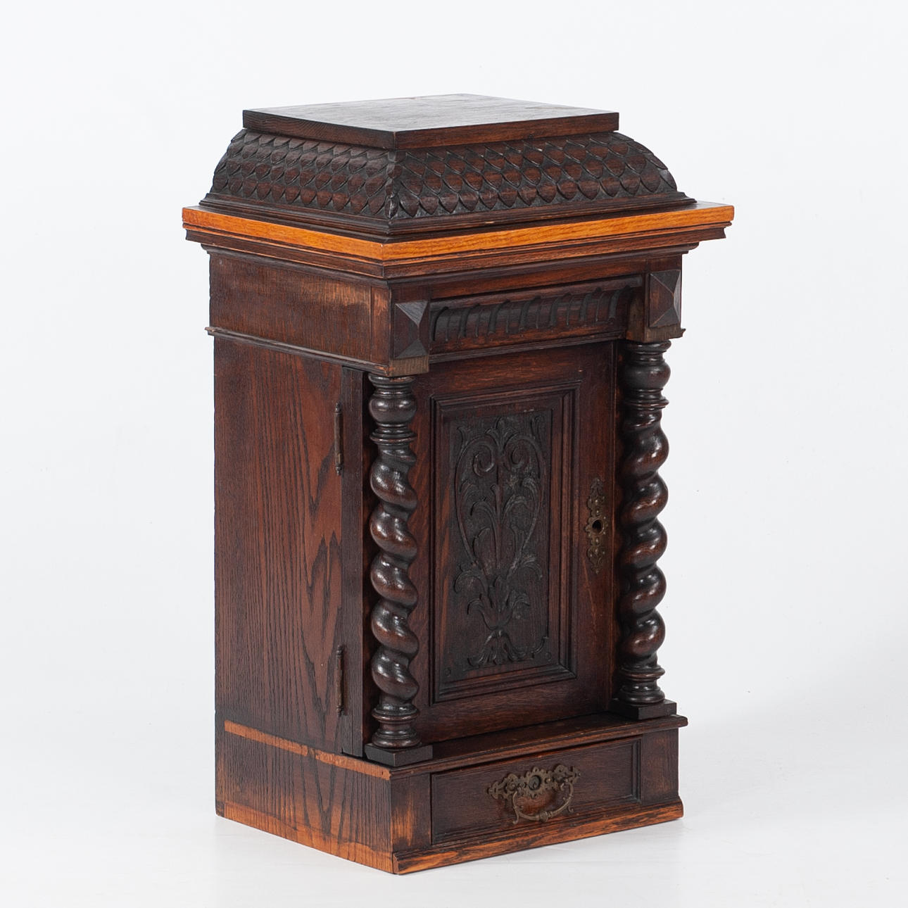 Dark stained wood with rich decor. Front with profiled mirror door, turned columns and cut ornamentation.